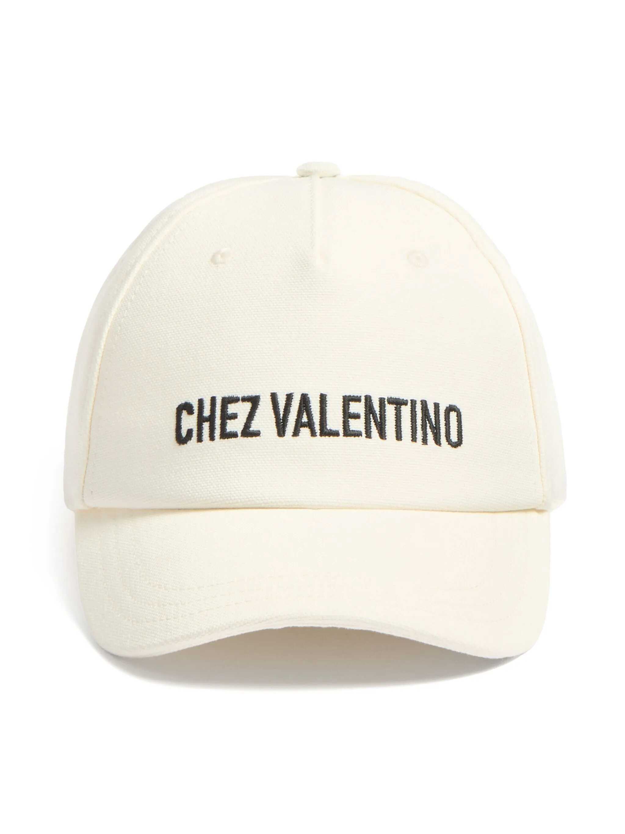 Valentino Garavani baseball cap crafted from ivory cotton canvas, featuring "Chez Valentino" embroidery on the front and "Paris / Rome" embroidery on the back. Detailed with an adjustable strap with a metal buckle and a lined interior.