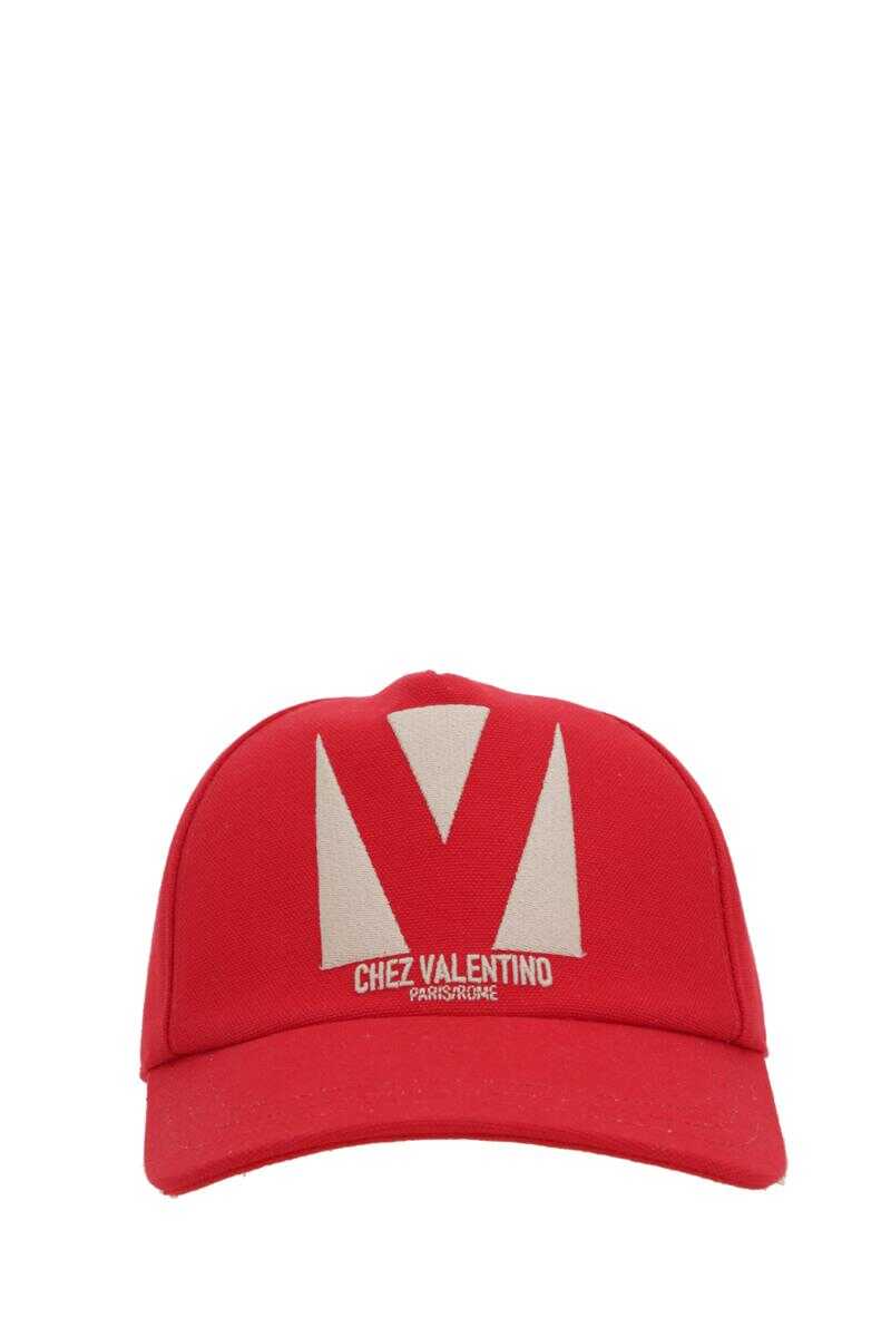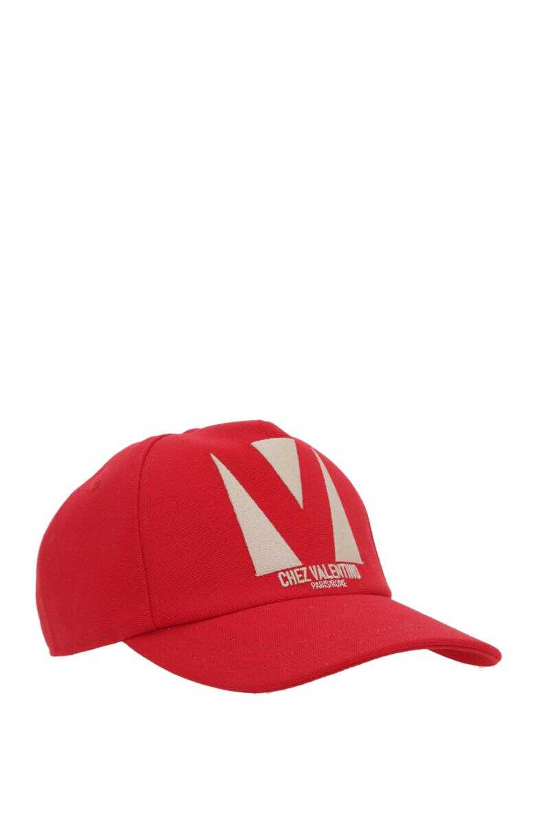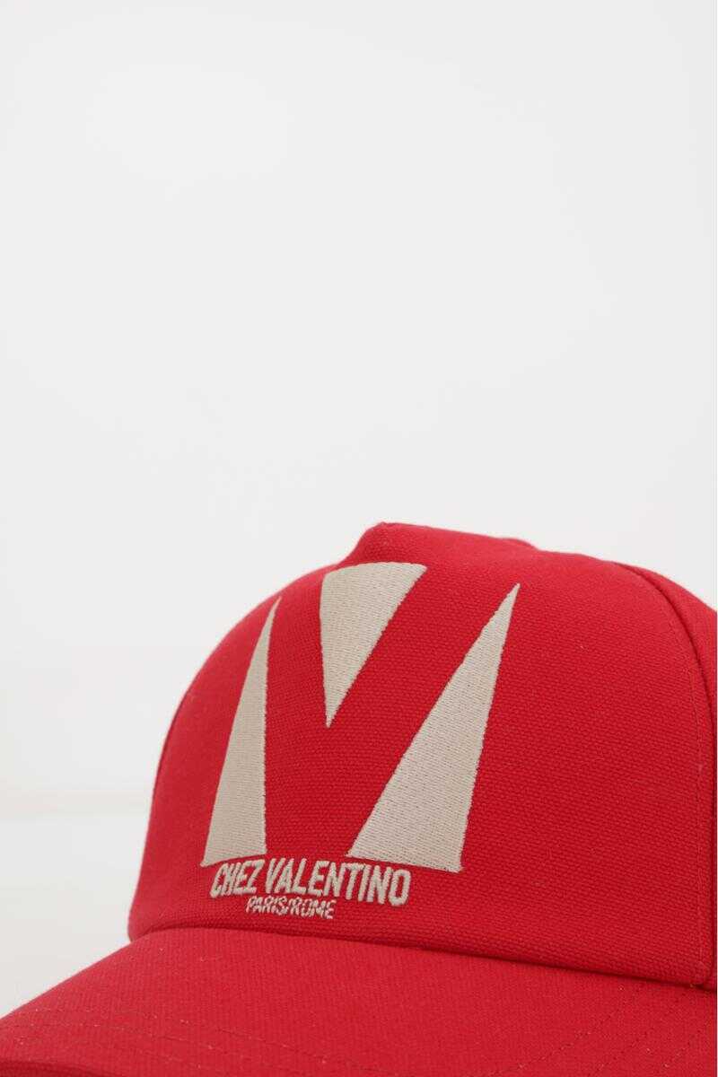 Valentino Garavani baseball cap crafted from red cotton canvas, featuring "Chez Valentino Paris / Rome" embroidery. Detailed with an adjustable strap with a metal buckle and a lined interior.