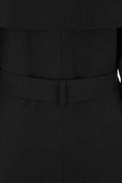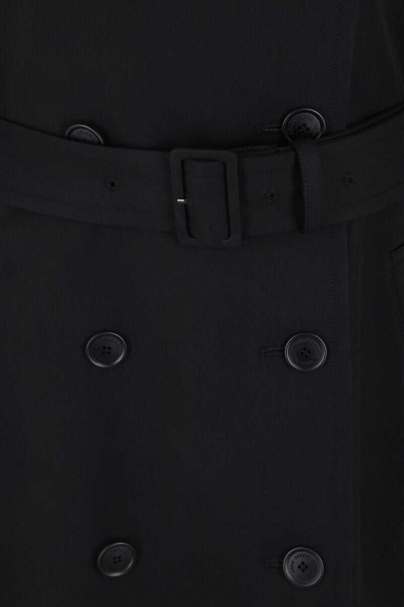 Balenciaga's hourglass-shaped double-breasted oversized trench coat crafted in black wool and cotton gabardine. Featuring wide lapel with hook-and-eye, storm flap, button closure, tabs at shoulders and cuffs, belt loops, front pockets, back box pleat and straight hem. The design is completed by the matching removable belt. Lined interior.