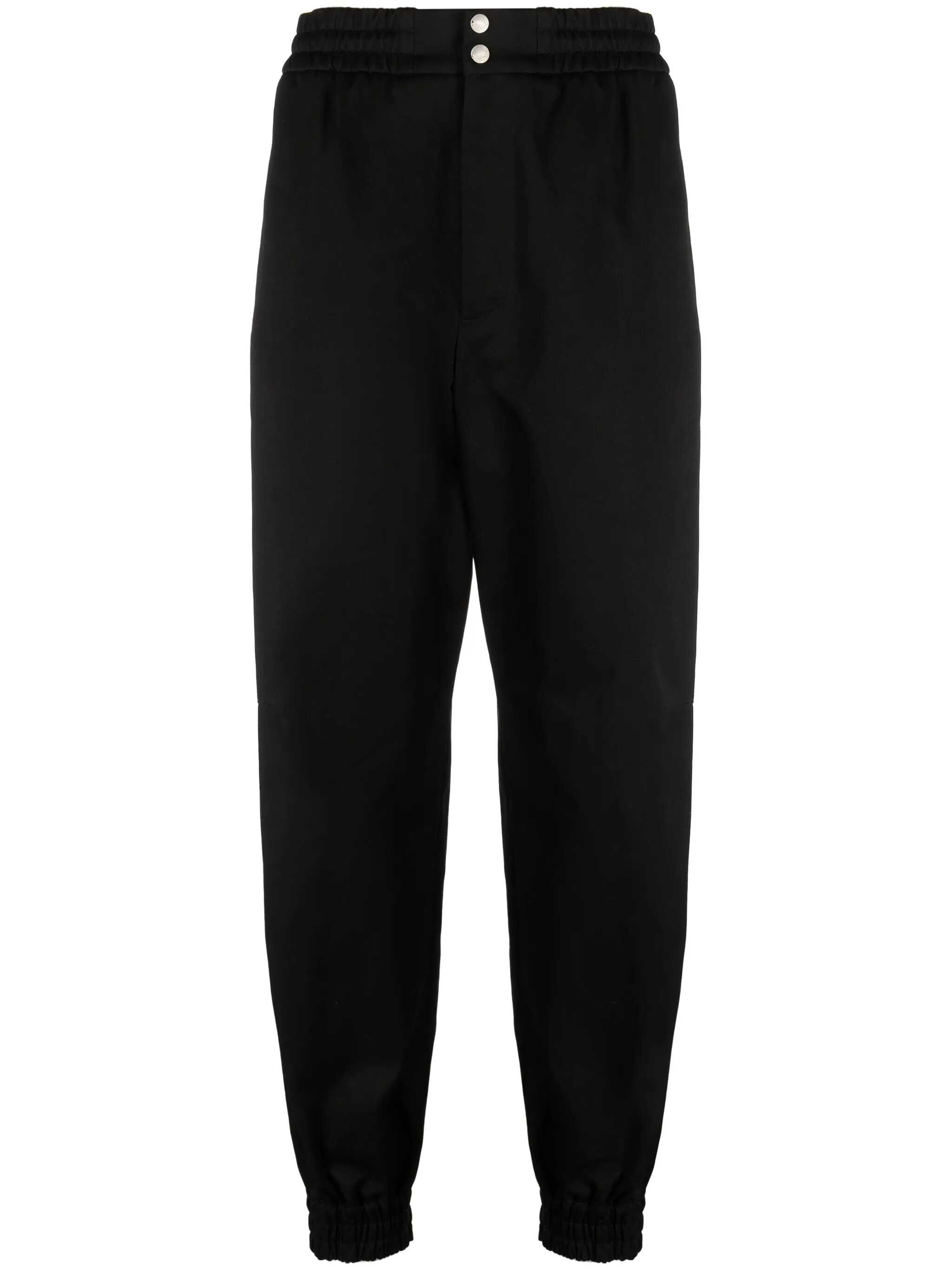 Alexander McQueen's pants crafted in black cotton gabardine. Featuring elasticated waistband with drawstring, snap-button / zip closure, multiple pockets, zip-up at ankle and elasticated bands at hem.