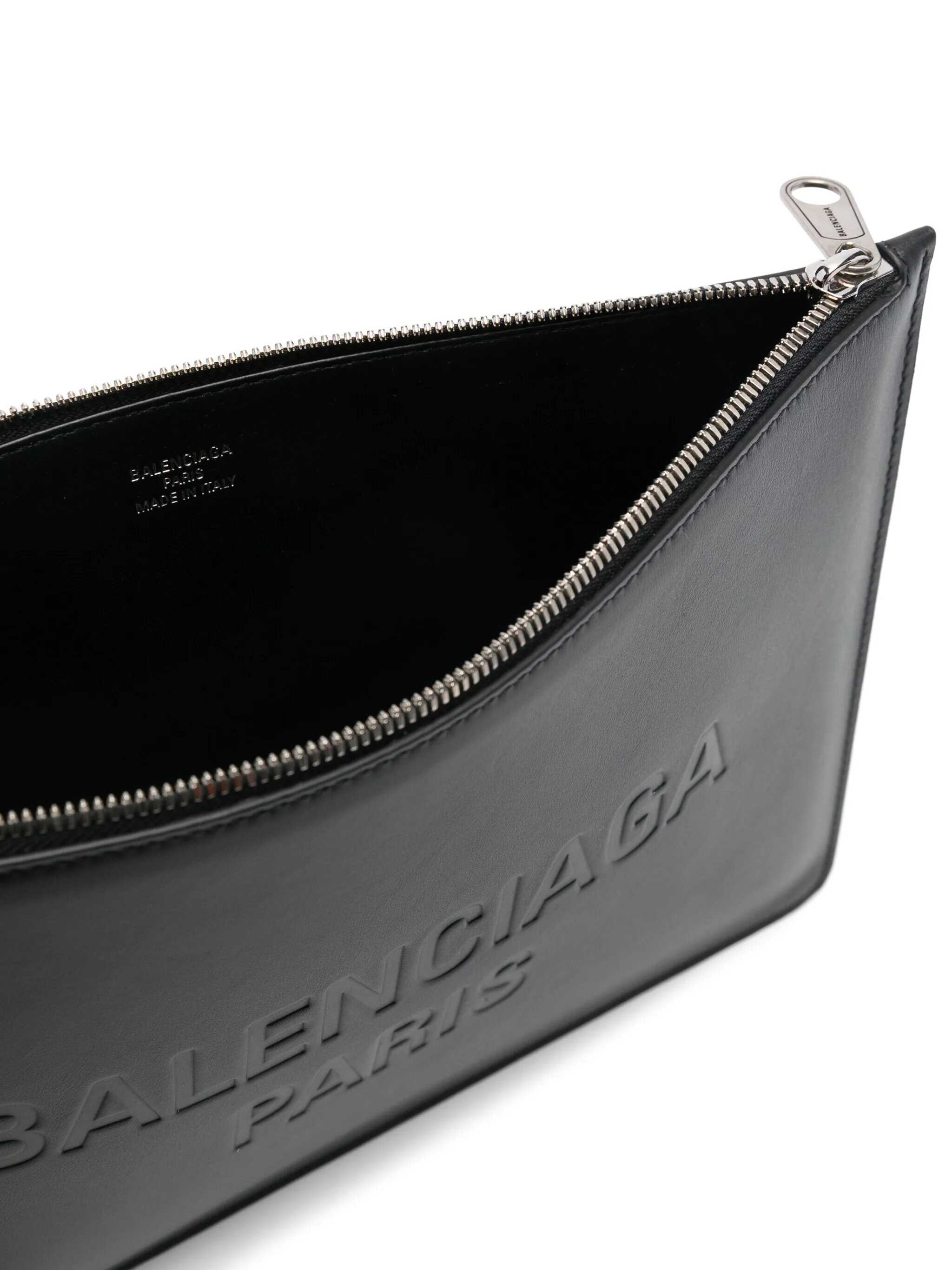 Balenciaga pouch crafted in black smooth leather with lettering logo embossed on front. It features silver-tone hardware, zip closure and removable wristlet. Black leather-lined interior.