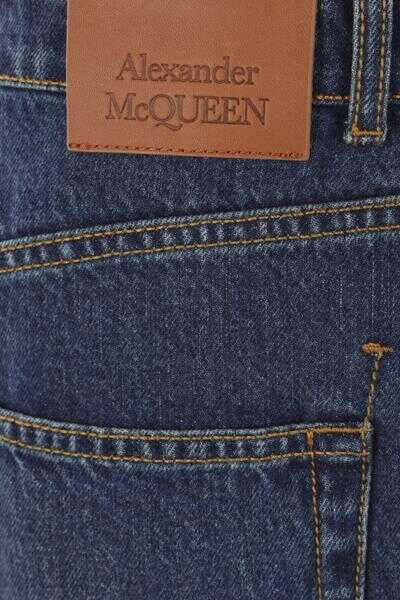 Alexander McQueen's wide-leg jeans crafted in blue cotton denim. Featuring metal button / zip closure, belt loops, five classic pockets and embossed logo patch at back waist.