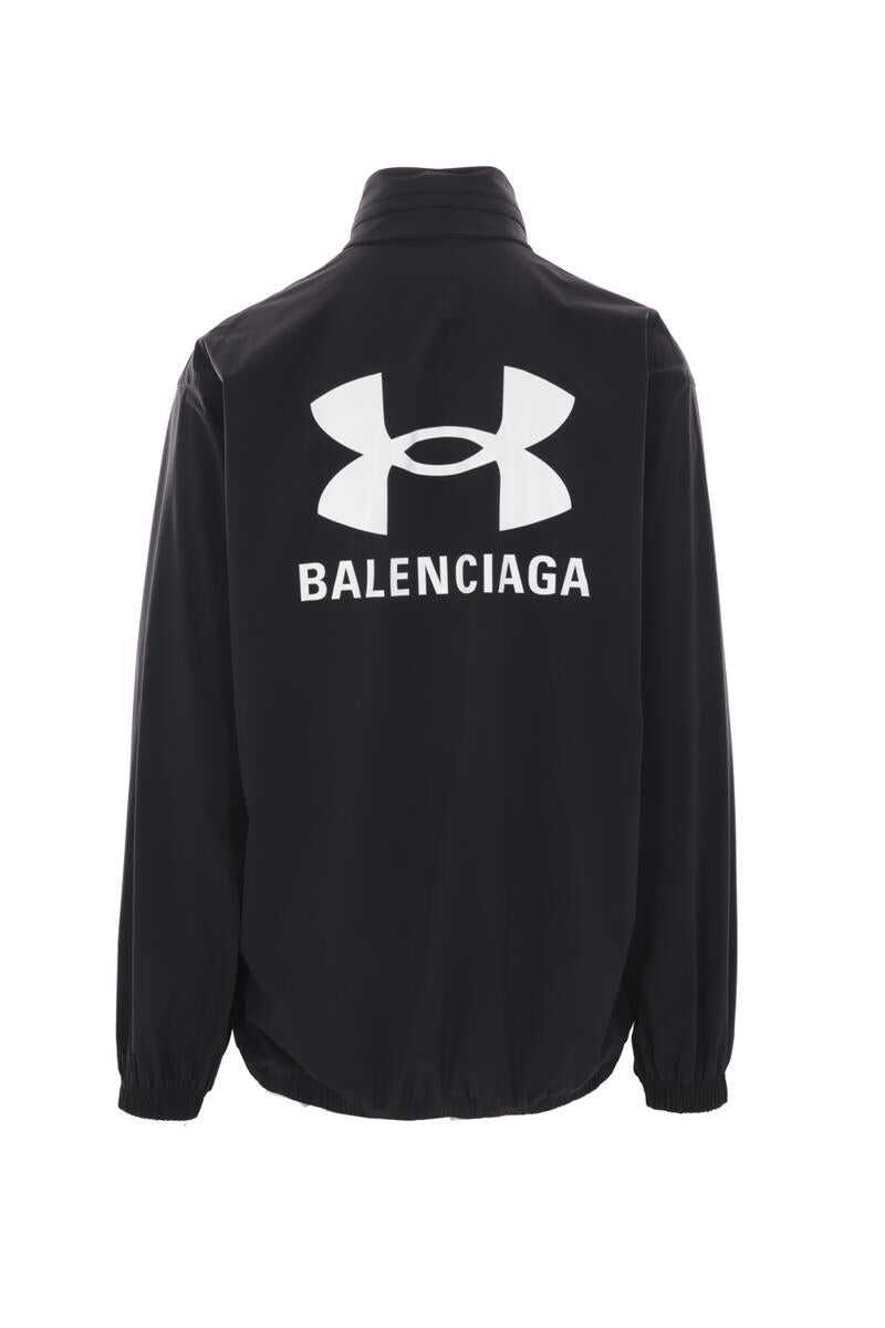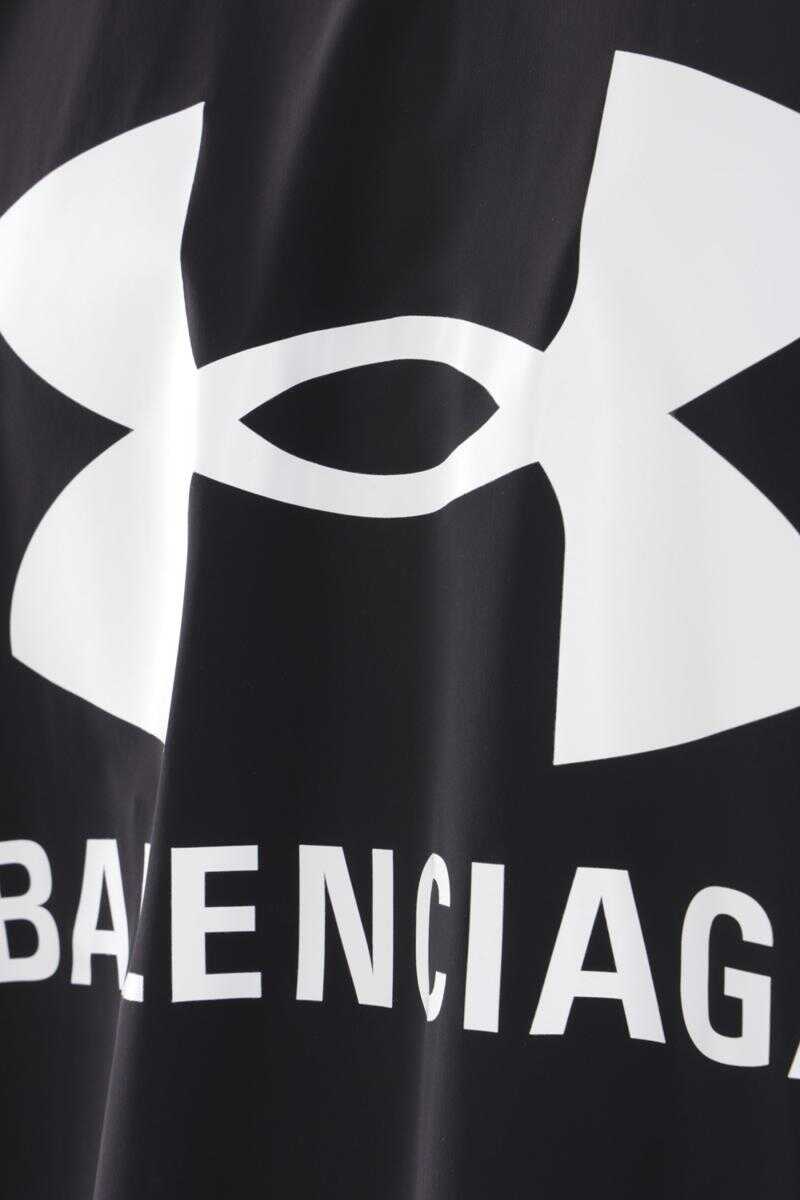 Balenciaga oversize windbreaker designed in collaboration with Under Armour® and crafted in black stretch nylon with logo print at chest / at back. It features stand collar, extractable hood, zip closure, side pockets, long sleeves and elasticated edges. Unlined interior.