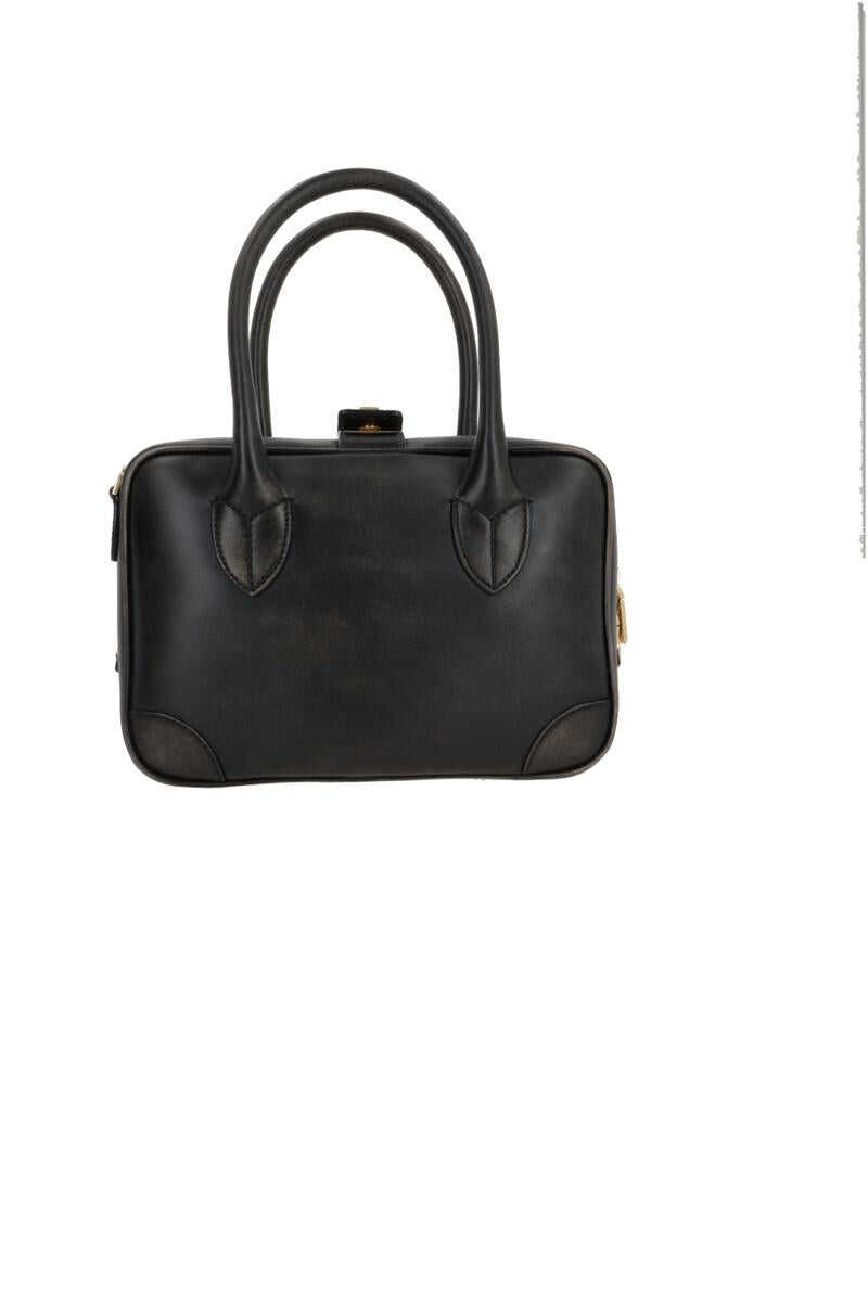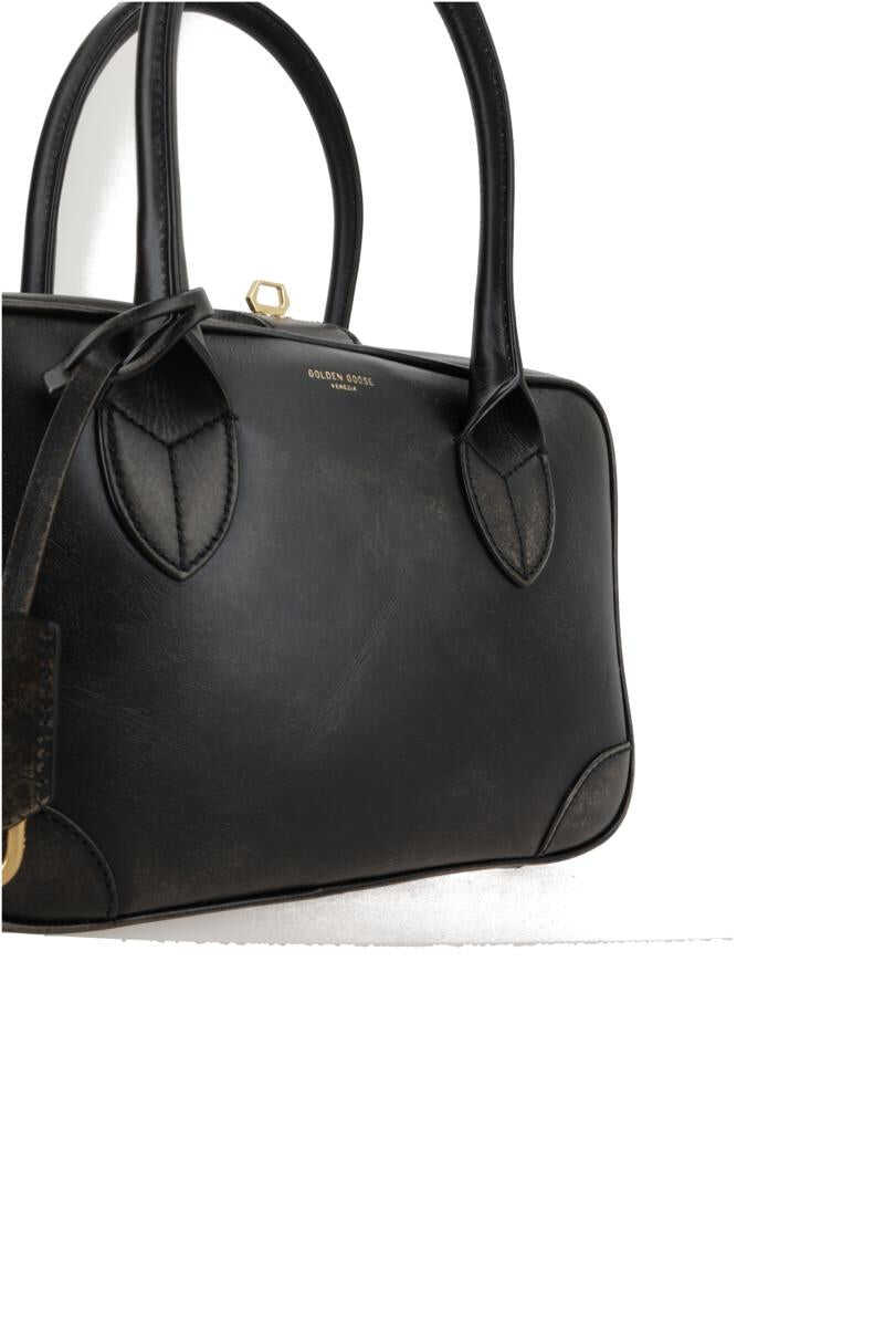 Golden Goose Deluxe Brand handbag made of black leather with a vintage effect. Featuring gold-tone hardware, a double-zip closure, a twist-lock top strap, dual handles, and an adjustable/removable shoulder strap. The black canvas-lined interior includes multiple pockets. The design is completed with protective metal feet, a keyring with a leather pouch, and the iconic embossed logo on the front.
