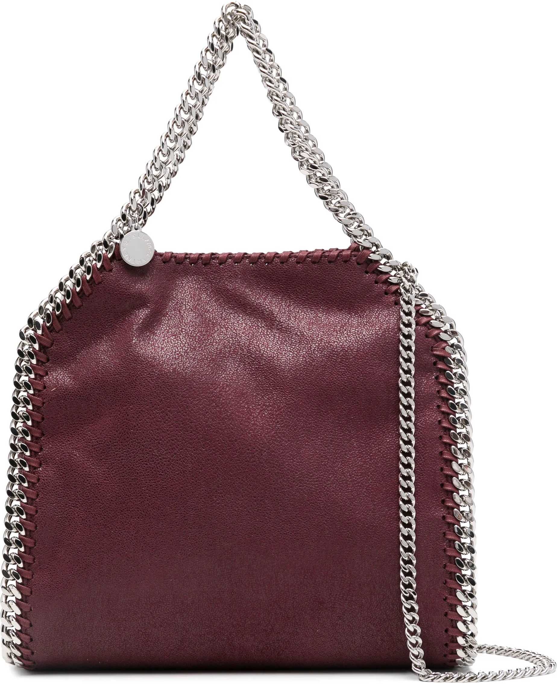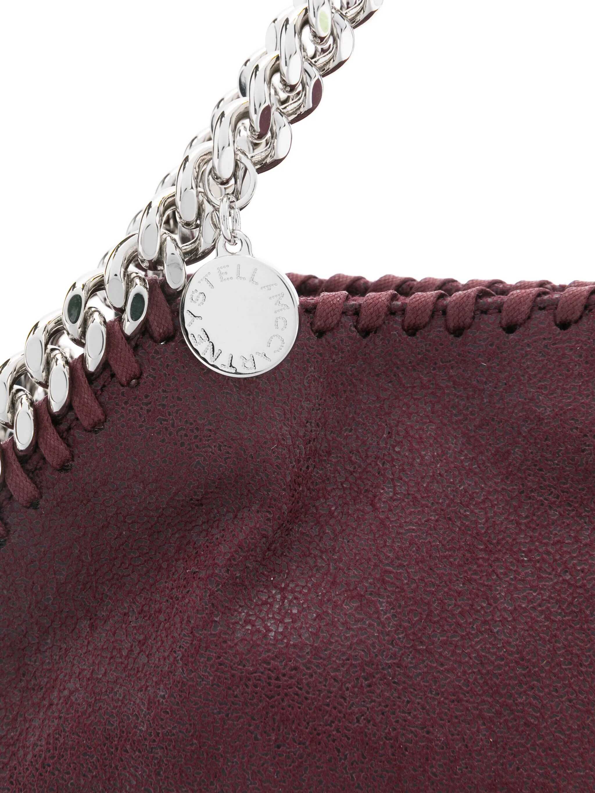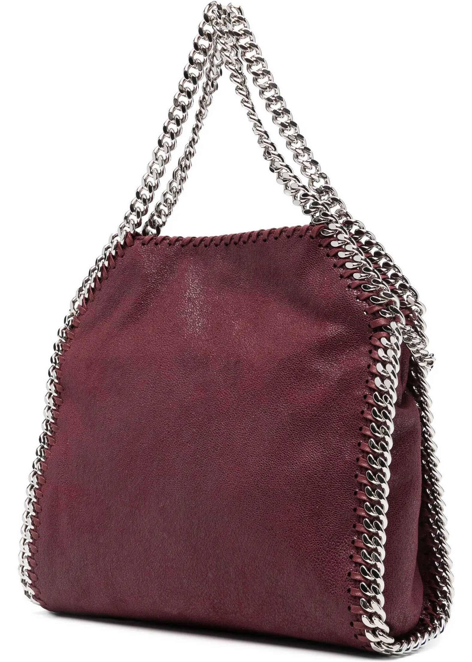 Mini Falabella tote bag in Plum-colored vegan Shaggy Deer fabric. It features diamond-cut silver-tone chain detailing, two top handles, a shoulder strap, magnetic closure, one main internal compartment, and an internal flat pocket. Dust bag included. Any imperfections in the material are not to be considered manufacturing defects, but rather a characteristic of the fabric.