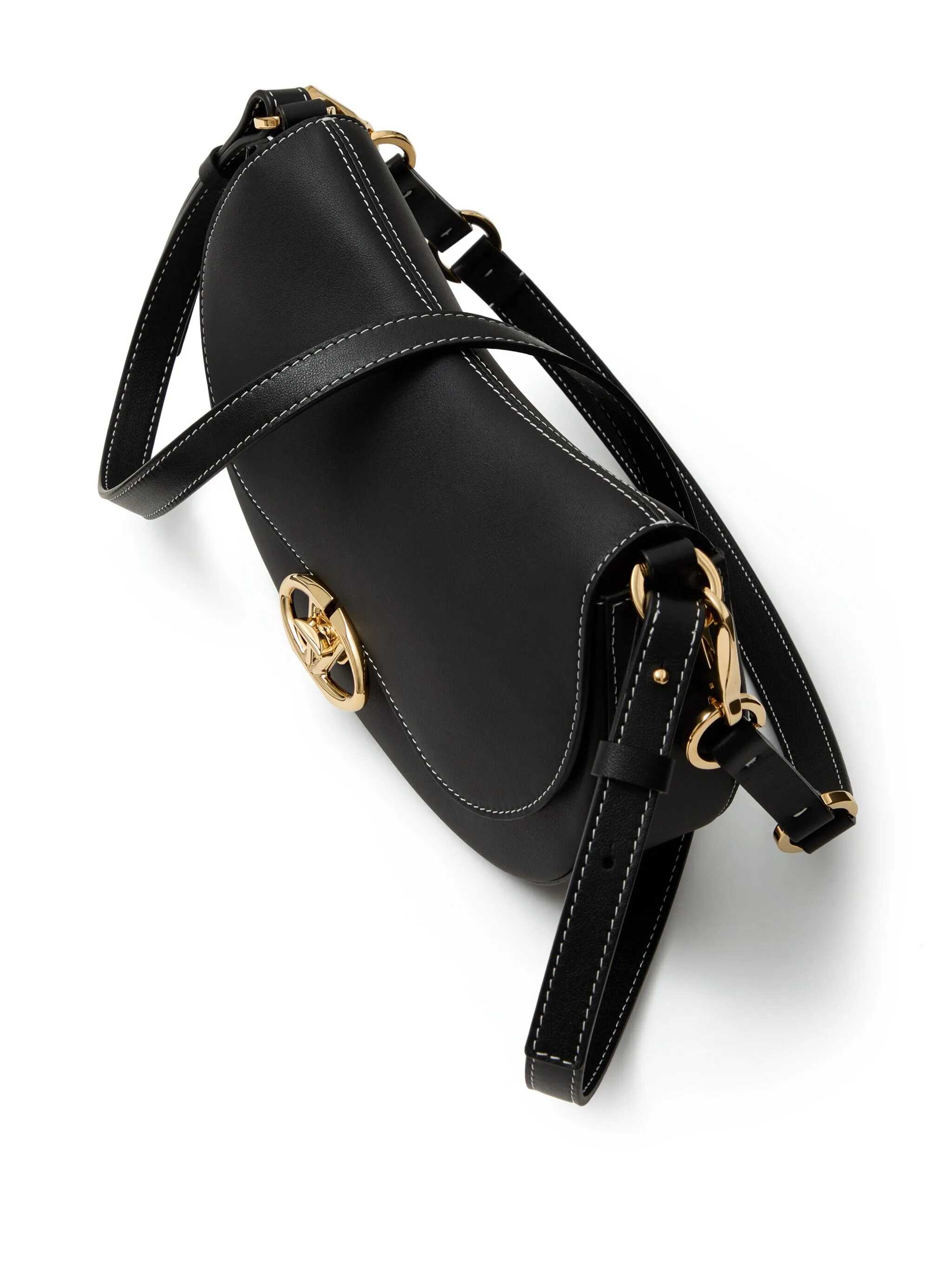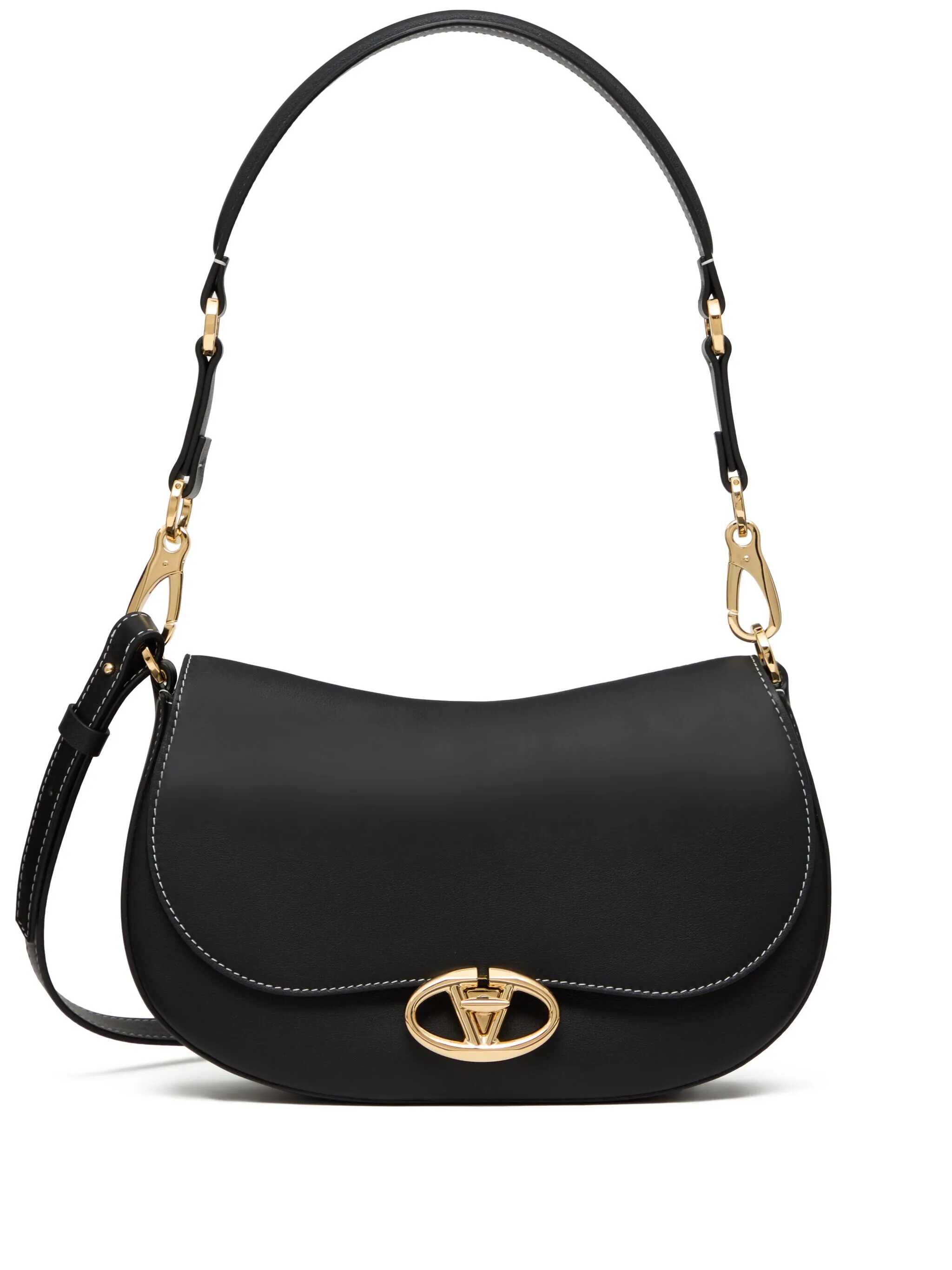Black leather Ovhal shoulder bag from Valentino Garavani featuring frontal fastening, gold tone hardware, adjustable belt, handle, logo and inside pocket.