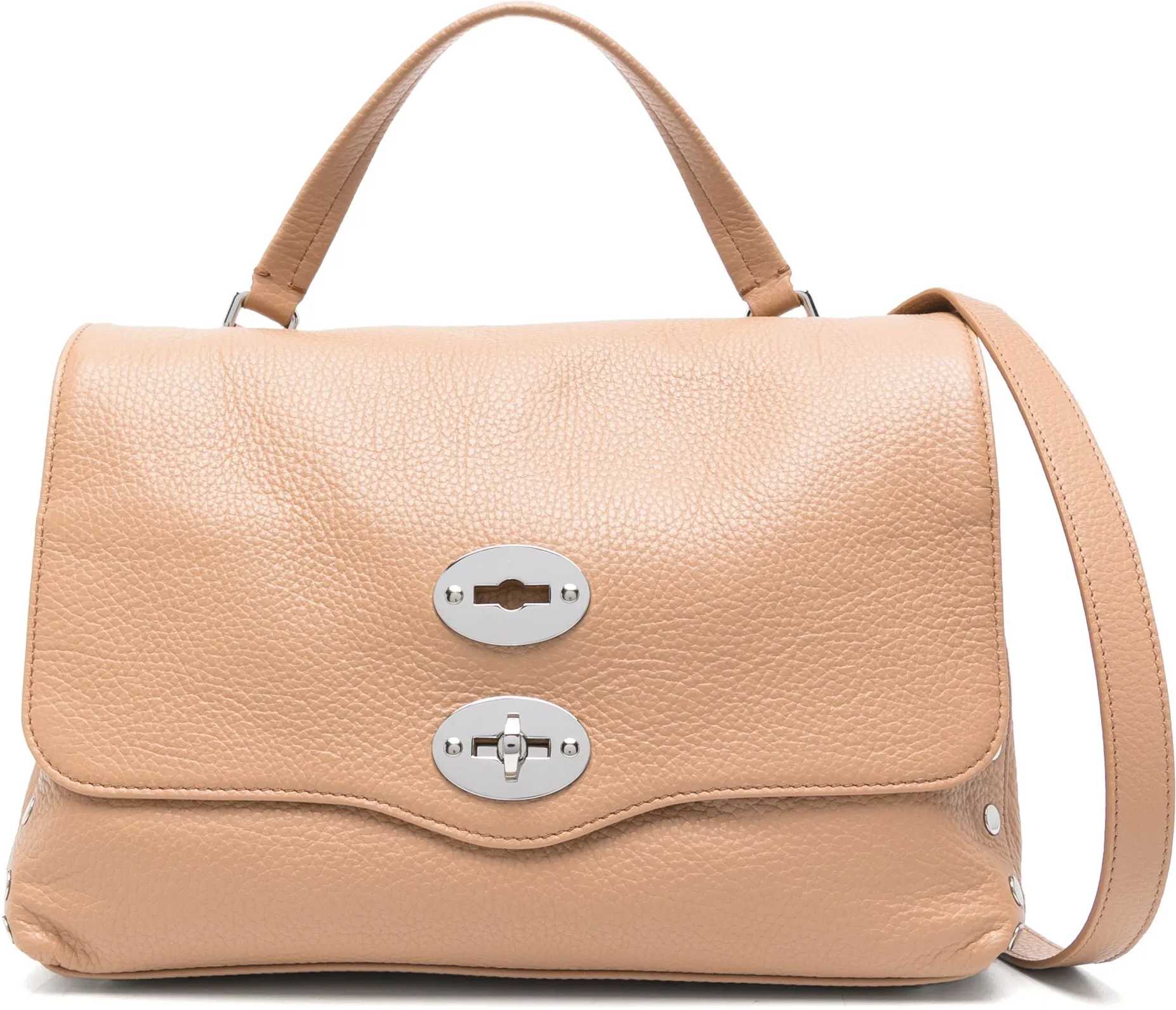 The leather Postina Daily Shoulder Bag by Zanellato is an elegant example of functionality and refined style. Featuring a single flat leather handle on top, it offers a front swivel hook closure that adds a touch of practicality. The adjustable and removable shoulder strap allows for different modes of use, while flat studs on the side panels add a characterful accent. Inside, two compartments and a welt pocket offer ample organization, making this bag an accessory as chic as it is functional.
