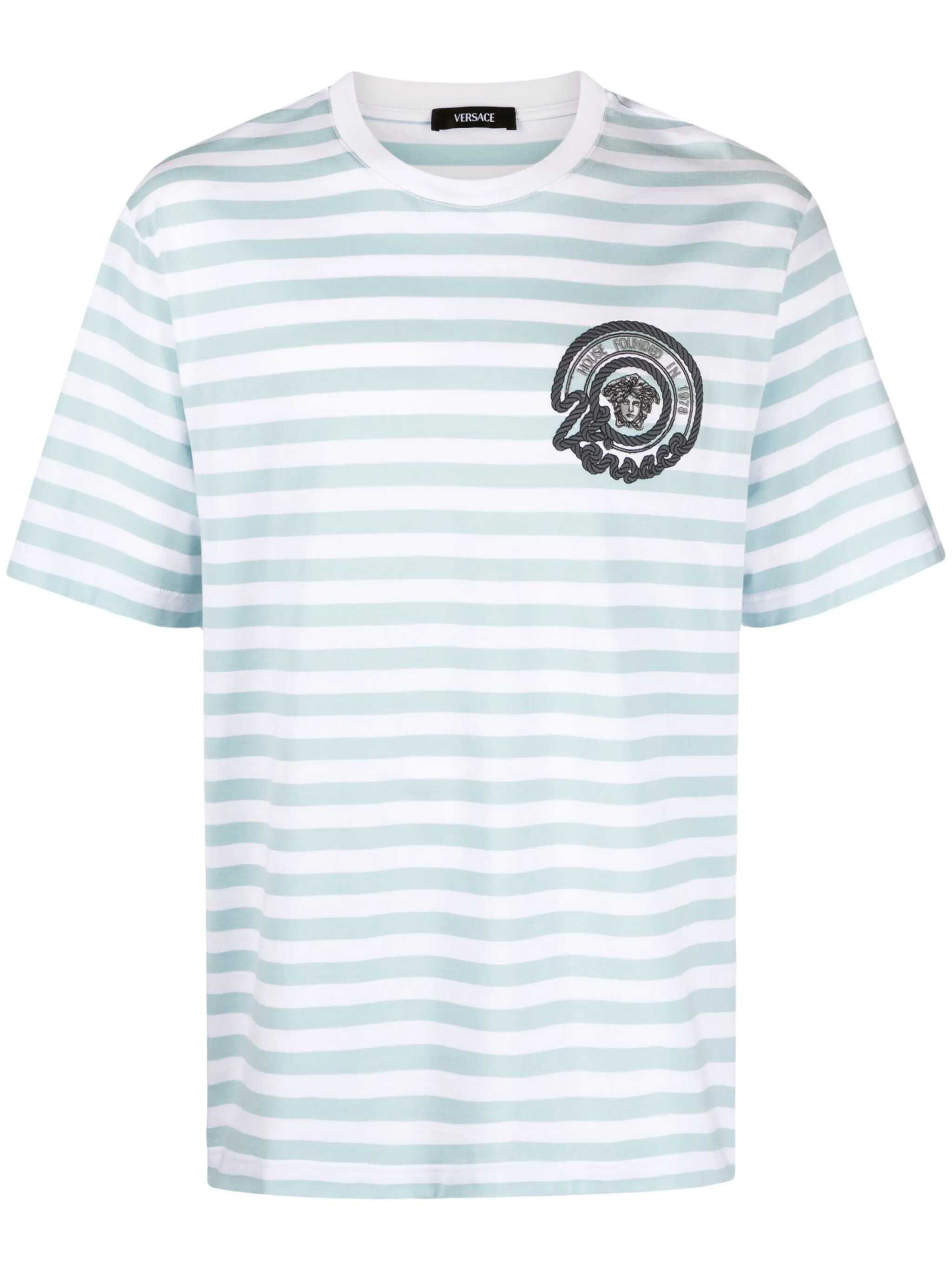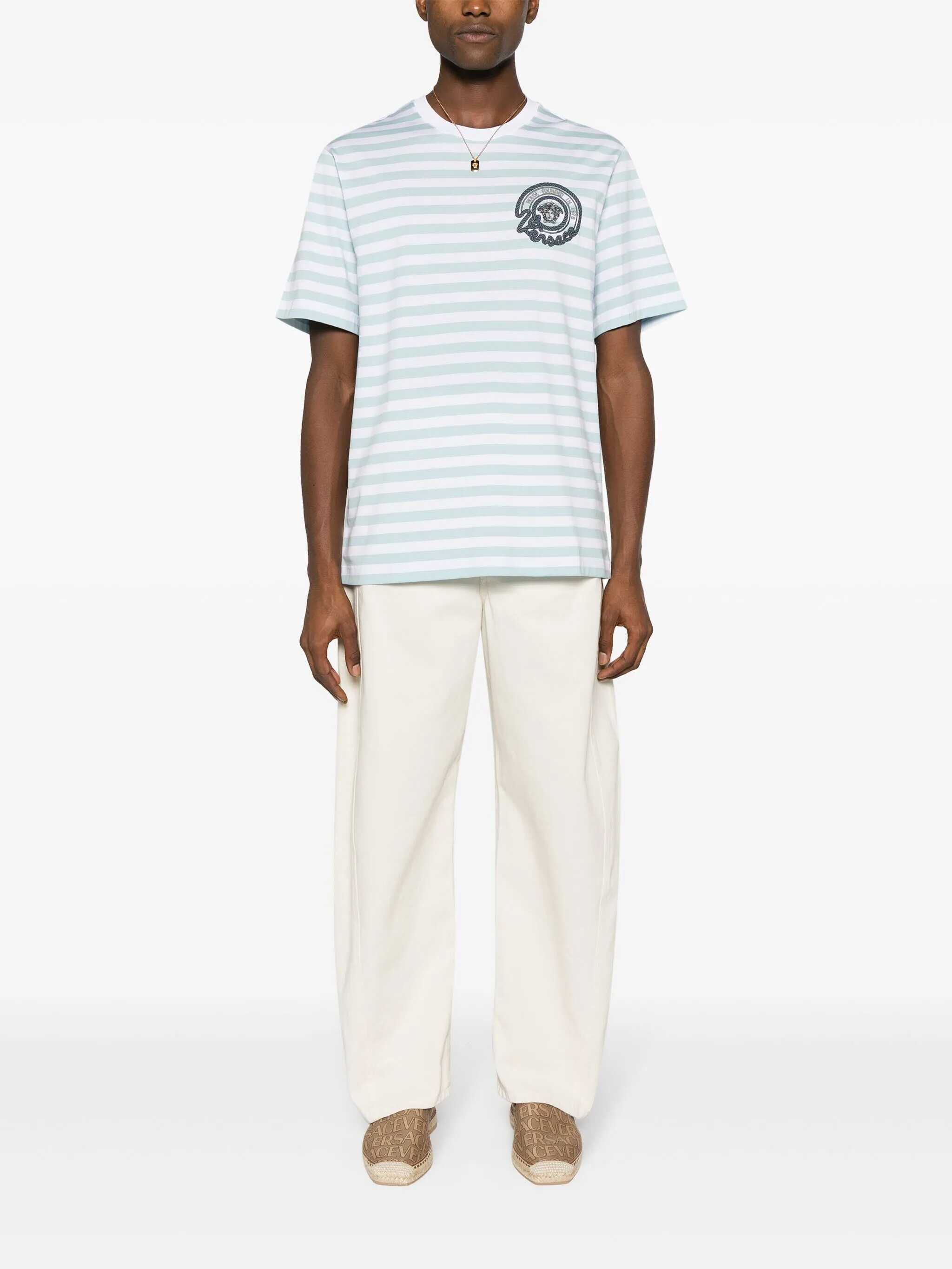 Short-sleeved cotton jersey T-shirt. Crew neck. Ribbed hems. Striped pattern. Versace Nautical logo with Medusa embroidered on front.