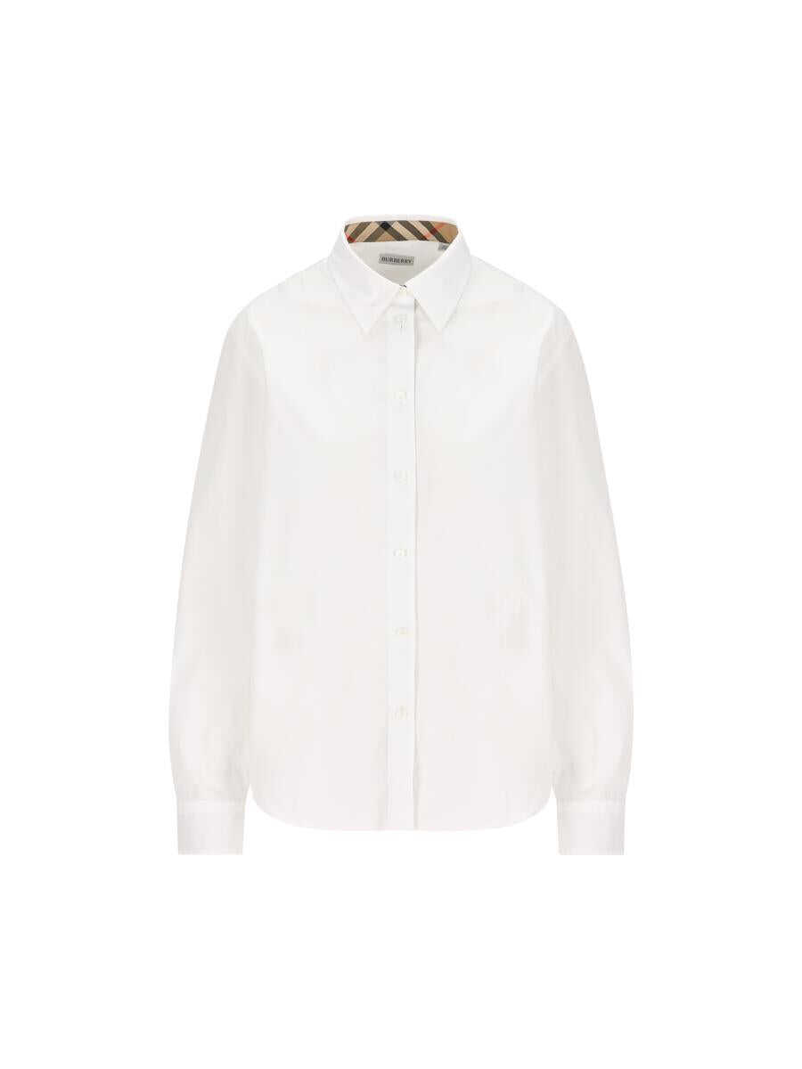 Burberry white cotton poplin shirt embellished with the iconic Check pattern on the inside of the collar, placket and cuffs. Embroidery of the Equestrian Knight Design on the front adds a distinctive touch, making this garment a timeless classic in women's wardrobes. - Material: 100% cotton - Color: white - Pointed collar with Burberry Check inside - Front button closure - Single button cuffs with Burberry Check inside - Curved hem - Equestrian Knight Design embroidered on front - Made in Italy - Item number: 8111217A1464