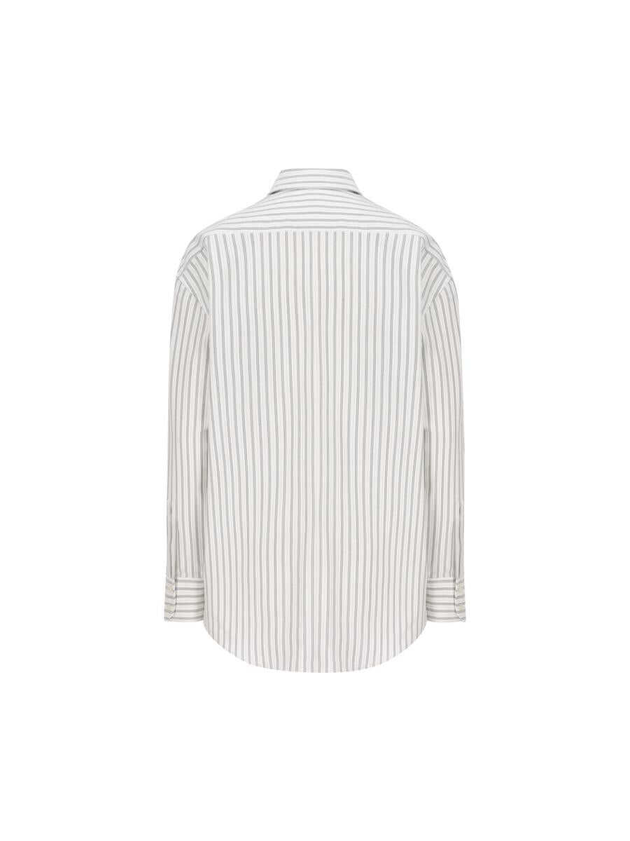 Masculine-inspired oversize shirt with vertical stripes and tailored trim. A relaxed silhouette that reinterprets formal codes with natural elegance. - Material: 100% cotton - Color: white - Classic point collar - Dropped shoulders - Long sleeves with cuffs - Cassandre embroidery at hem - Tone-on-tone vertical stripe motif - Fluid, masculine cut - Made in Italy - Item code: 835517Y6K549787