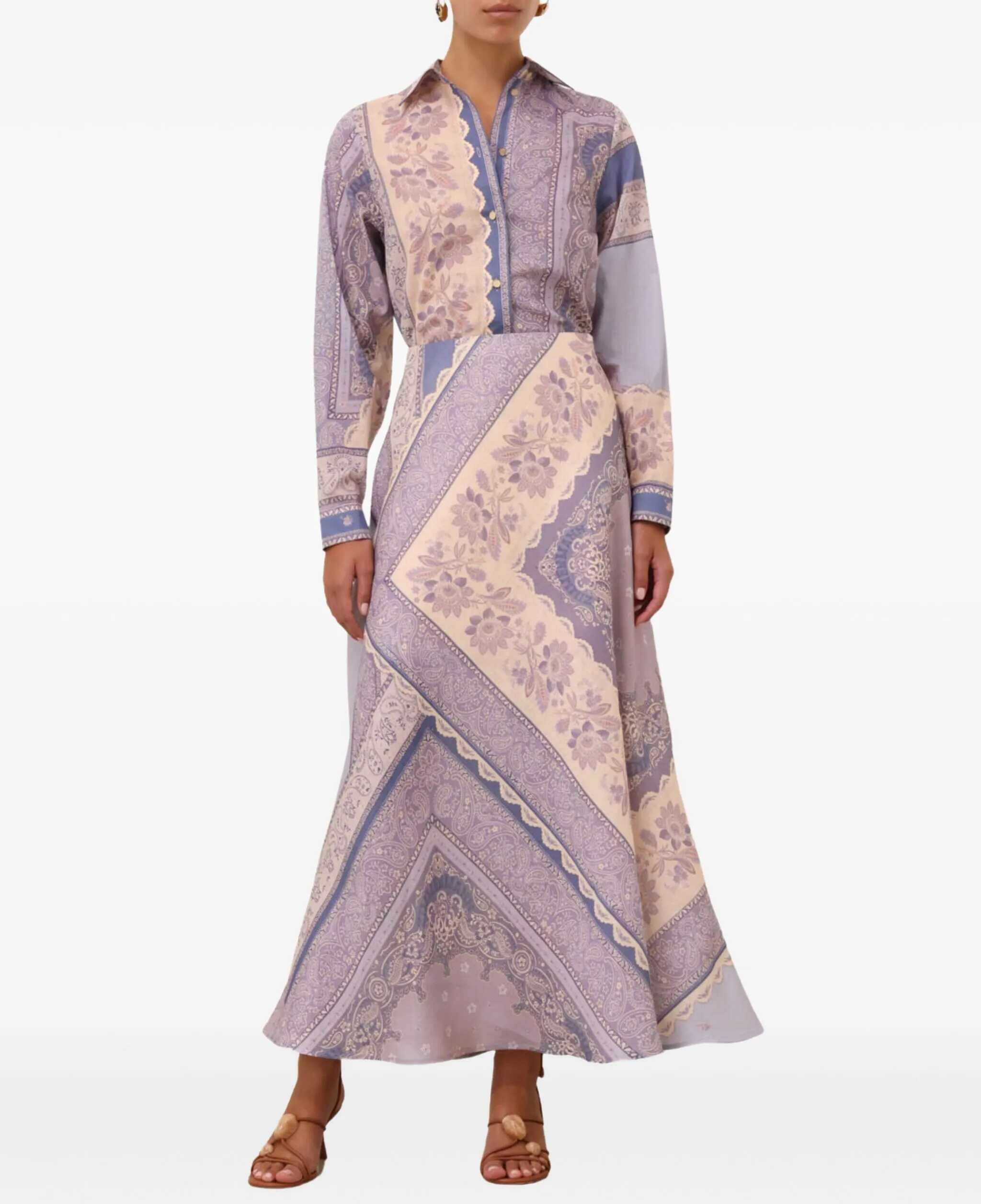 Zimmermann's Lucky Midi Skirt is a piece with casual and refined appeal, made from soft linen with a slanted weave that enhances the silhouette. The comfortable, feminine design is complemented by an elasticized waist that provides a versatile fit and a practical slip-on style. A floral print mixed with paisley motifs decorates the entire surface, lending a boho and romantic touch. Inside, a mini-length lining ensures comfort and coverage, making this skirt perfect for elegant and relaxed summer looks.