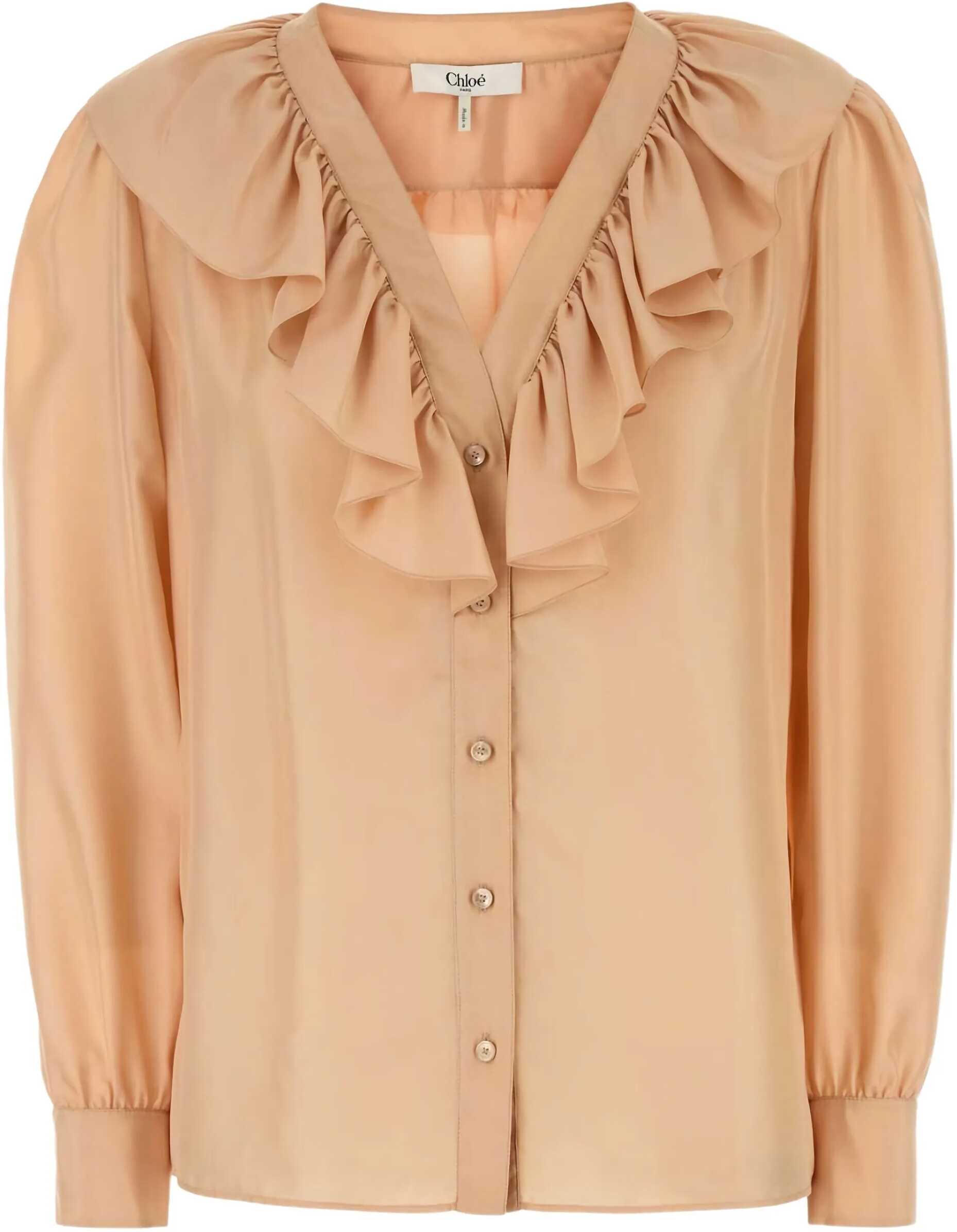 Chloé's Habotai Silk Ruffle Shirt by Chloé is a romantic and sophisticated piece, perfect for adding an ethereal touch to your wardrobe. Featuring a V-neckline and a delicate row of ruffles on the front, it expresses femininity with lightness and grace. The front closure and cuffs are embellished with mother-of-pearl buttons, giving a discreet and refined elegance. A modern interpretation of the classic shirt, in perfect Chloé style.