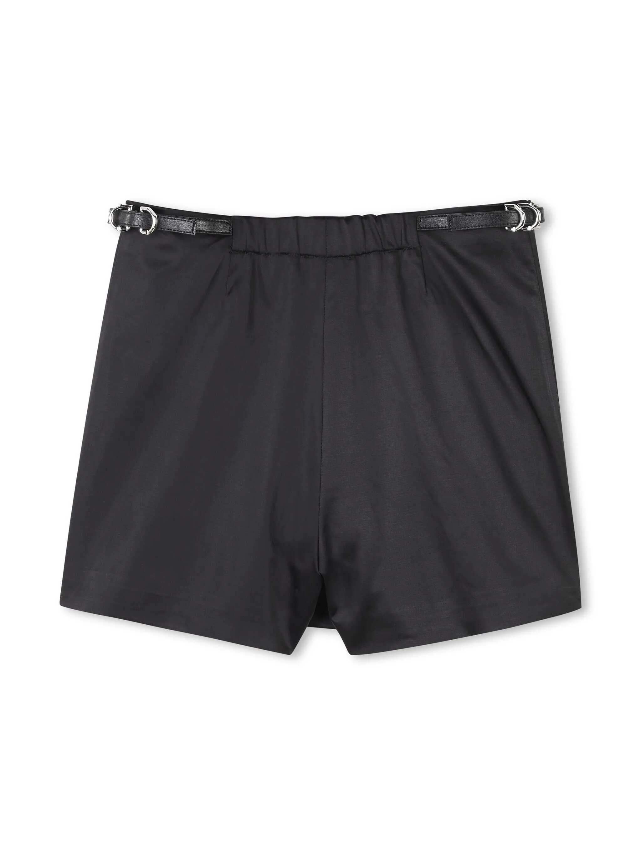 Satin shorts, cotton veil lining, elasticated back waist, front zipped closure with snap front panel, clamping tab in faux leather on sides, Givenchy signature embroidery on front bottom.