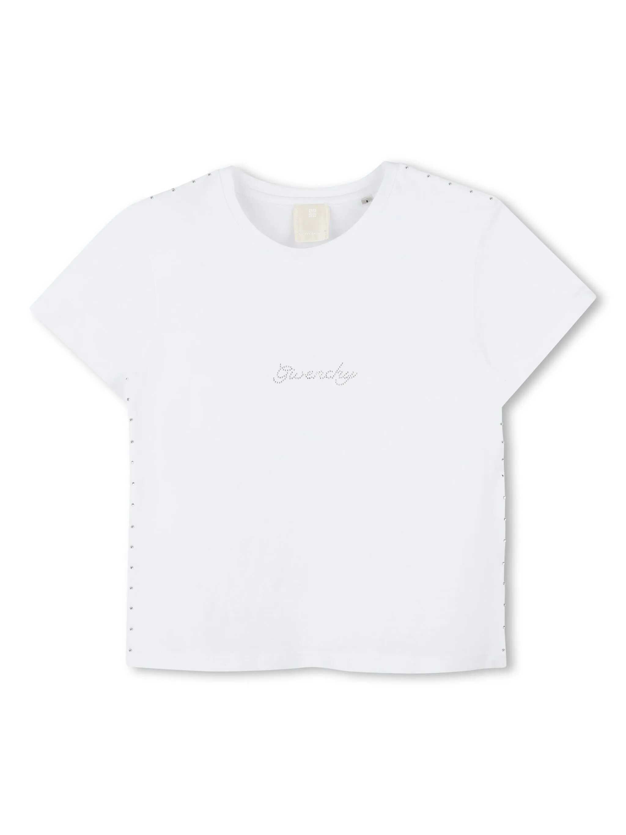Organic cotton jersey tee-shirt, rhinestones band on shoulders and sides, Givenchy signature rhinestones on front.