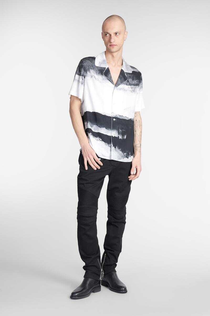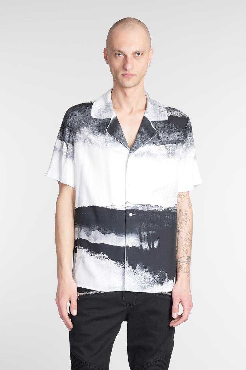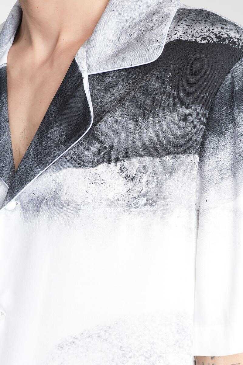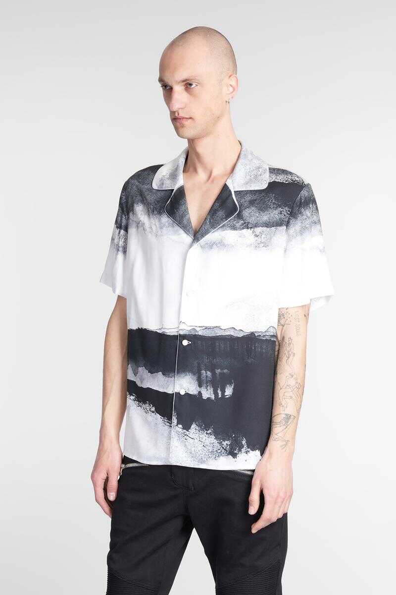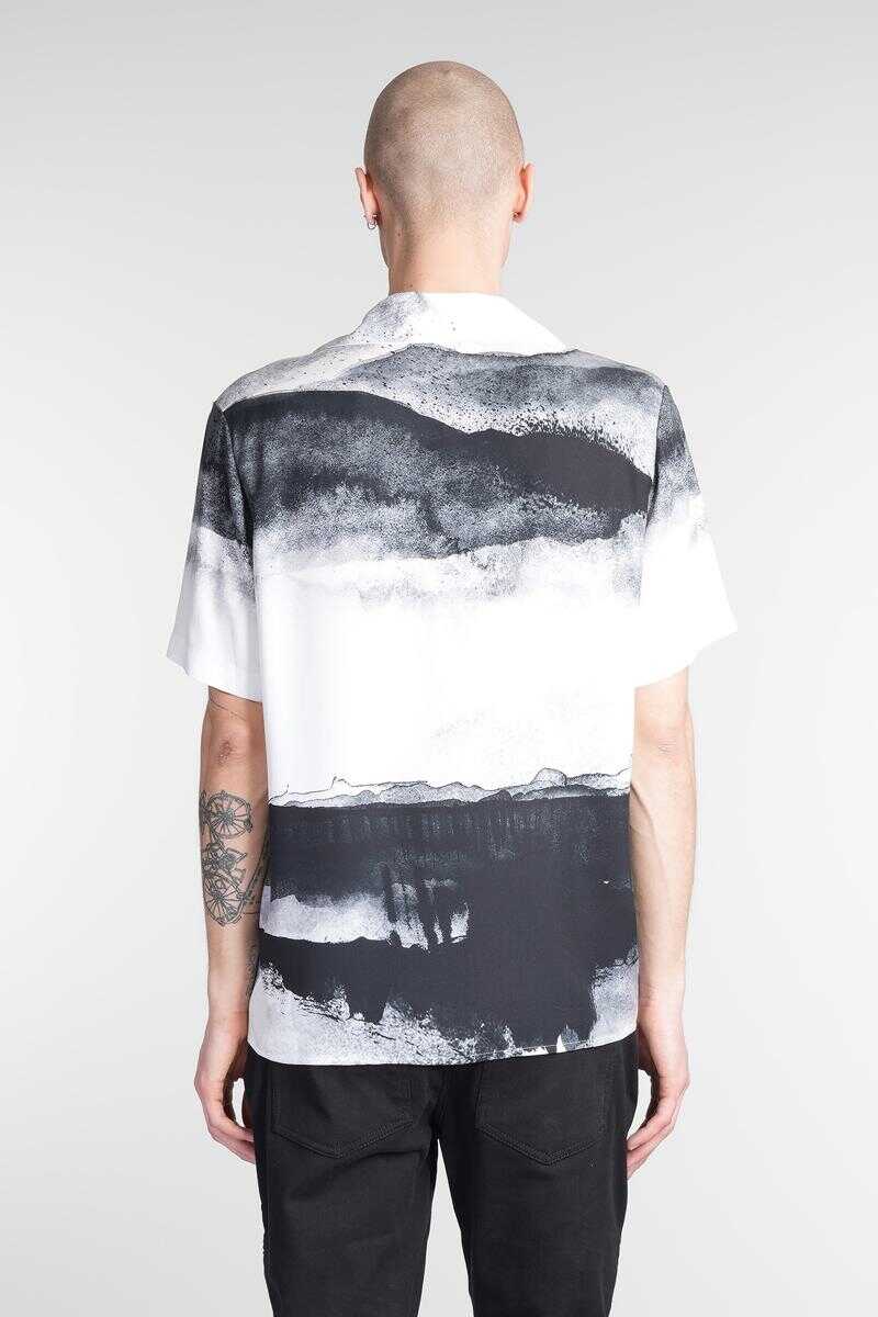Shirt in white viscose, bowling neck, short sleeves, frontal buttoning, abstract print , embroidery logo on chest, straight hem, 100% viscose, Made in Italy, the models is 1.91 and wears size L