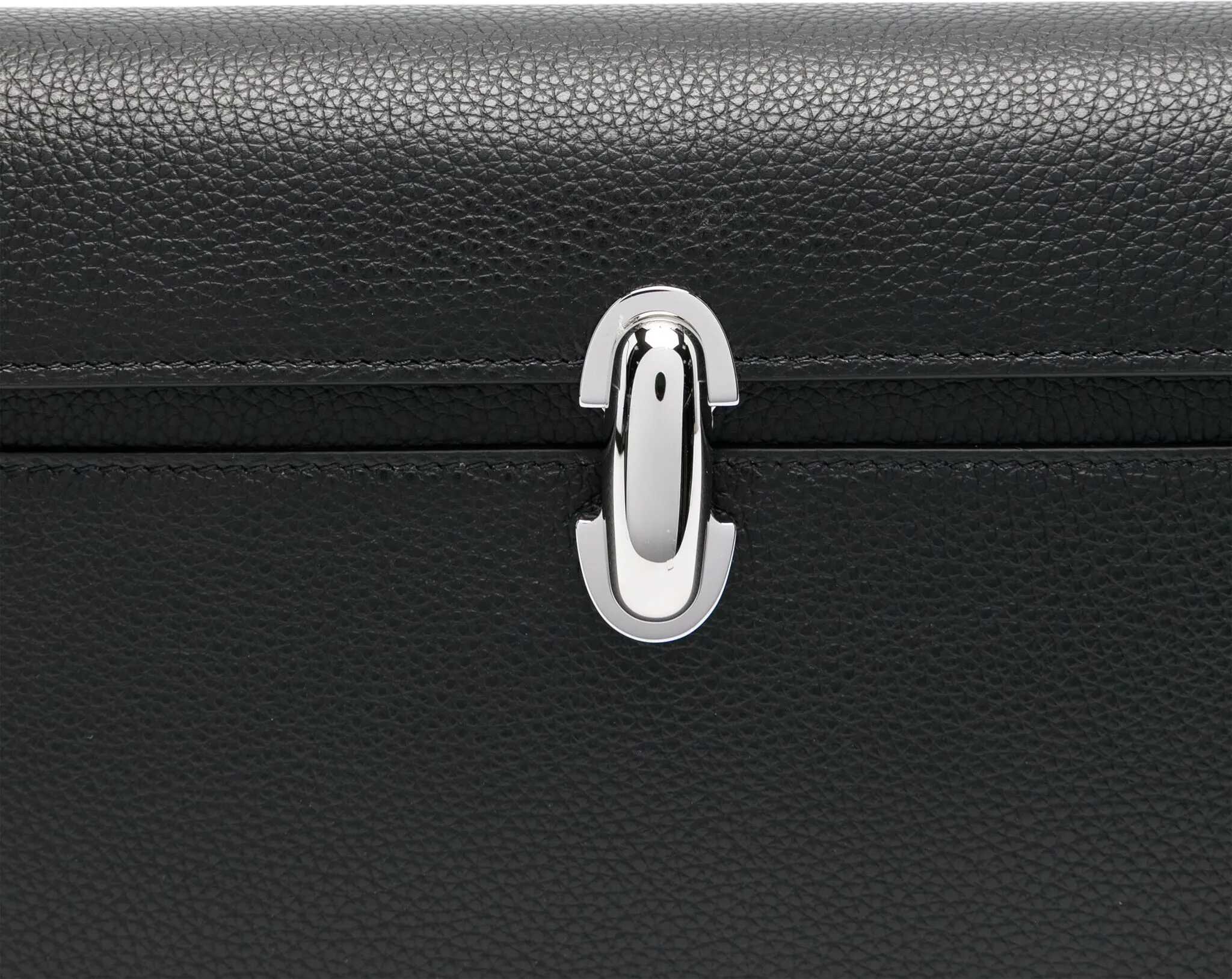 Savette's Symmetry Shoulder Bag embodies essential elegance through a design with clean, refined geometric lines. Made of fine grained leather, it features an adjustable and removable shoulder strap that allows it to be worn three ways: over the shoulder, cross-body or as a clutch. The swivel closure adds a sophisticated and functional detail, while the interior is organized with a useful pocket for essentials.