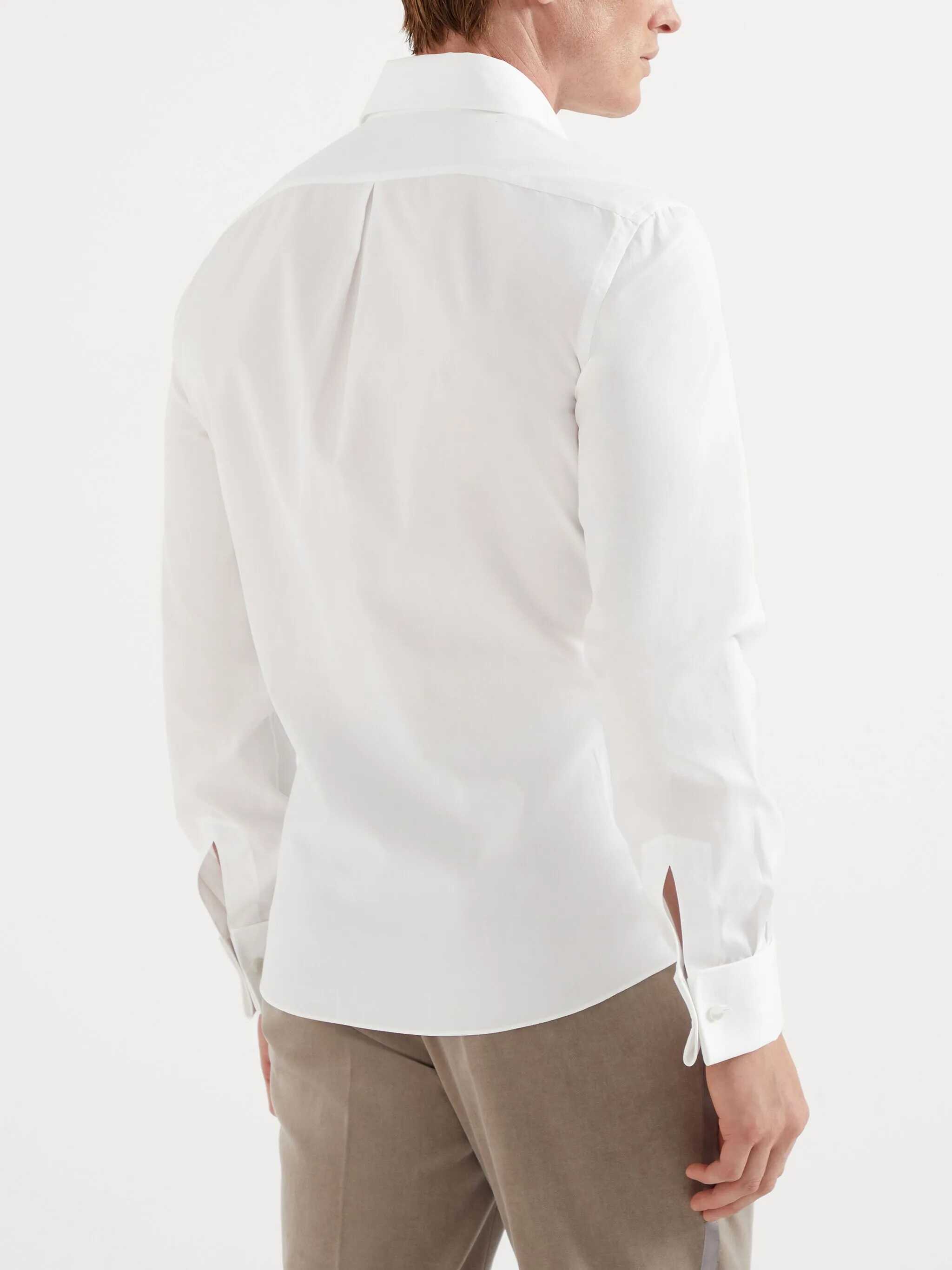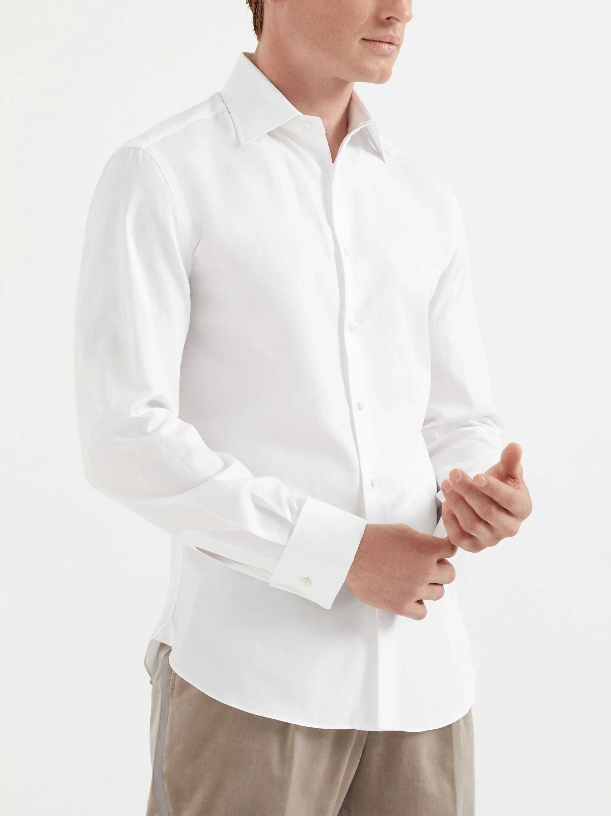 Brunello Cucinelli's cotton Shirt expresses sophistication and impeccable style. The classic collar and front button closure create a timeless look, while cuffs with lapels and appliqué cufflinks add a touch of formal elegance. The slim fit enhances the silhouette with a modern, well-structured fit. An essential garment for those who seek elegance in every detail.