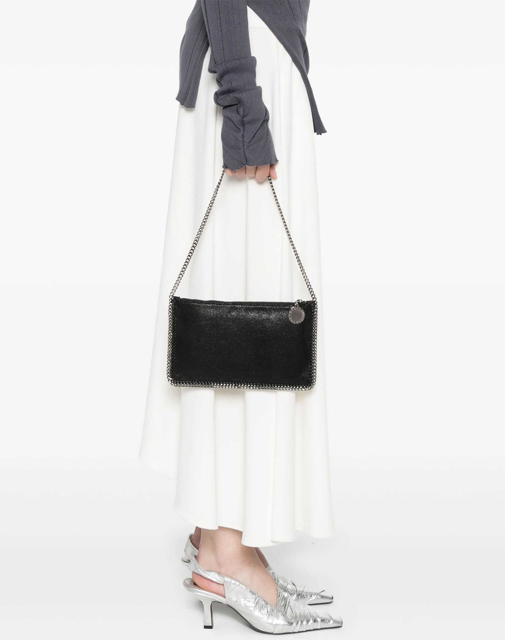 Stella McCartney's Falabella Pochette is an iconic accessory that combines contemporary style and sustainable ethics. Made of cruelty-free suede with a cracked effect, it features a rich and sophisticated texture that is perfectly in line with the brand's distinctive aesthetic. The top zipper closure is complemented by a logo pull, while the chain shoulder strap and diamond-cut chain trim give the model a bold and recognizable character. The single compartment is lined with logo-adorned jacquard fabric, a testament to the attention to detail.