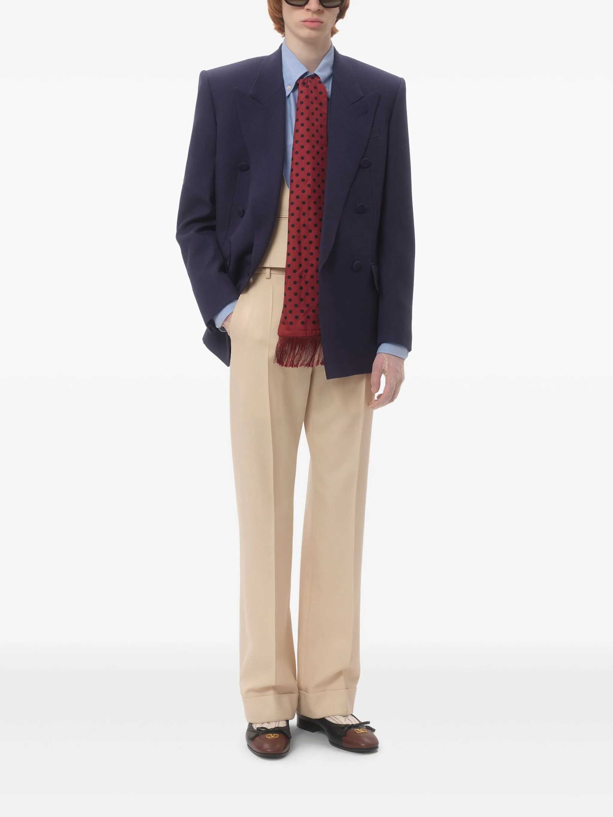 Formal wool gabardine trousers with front stretched pleat, slightly wide leg at the turn-up hem, button and hook zip closure