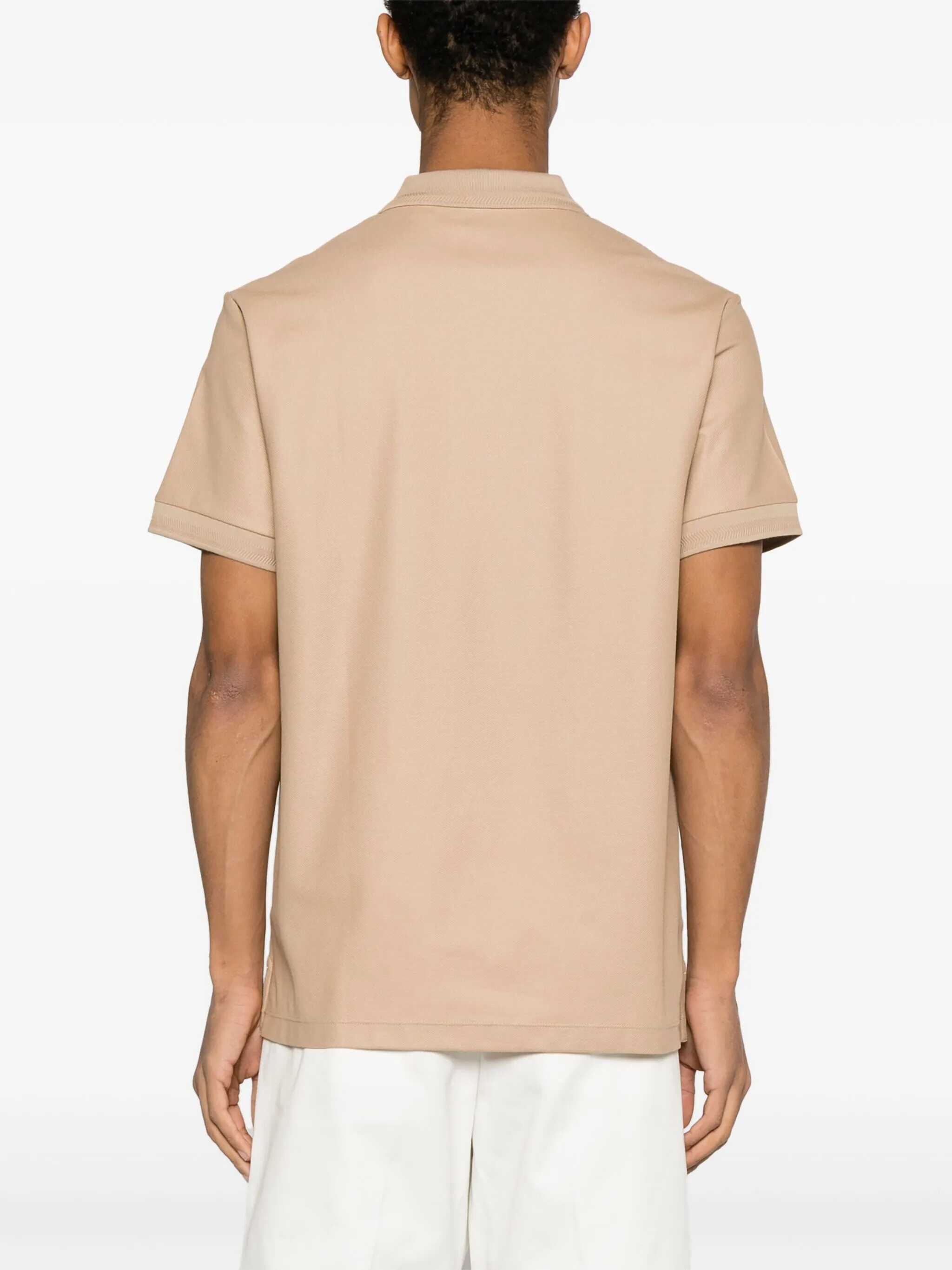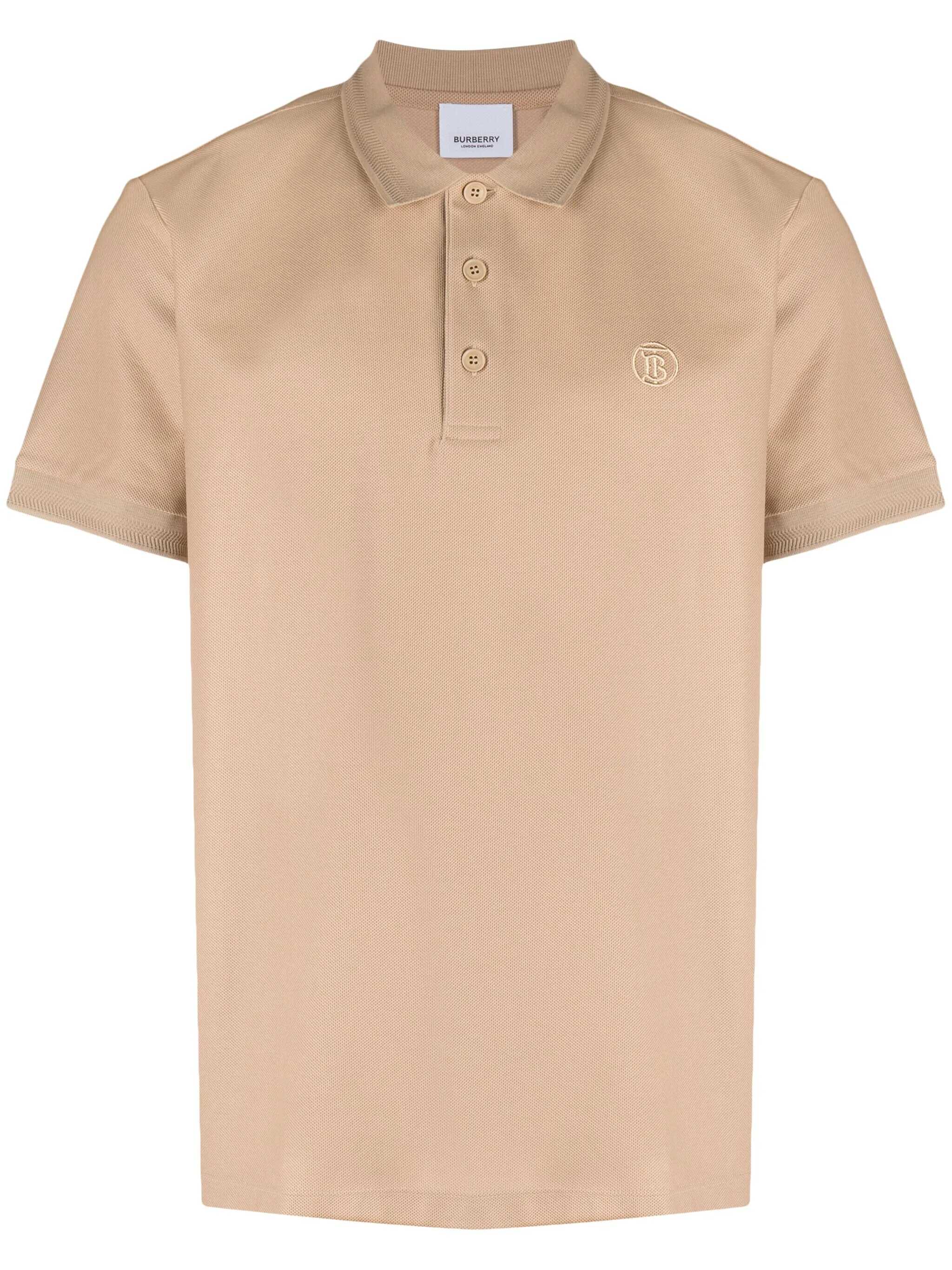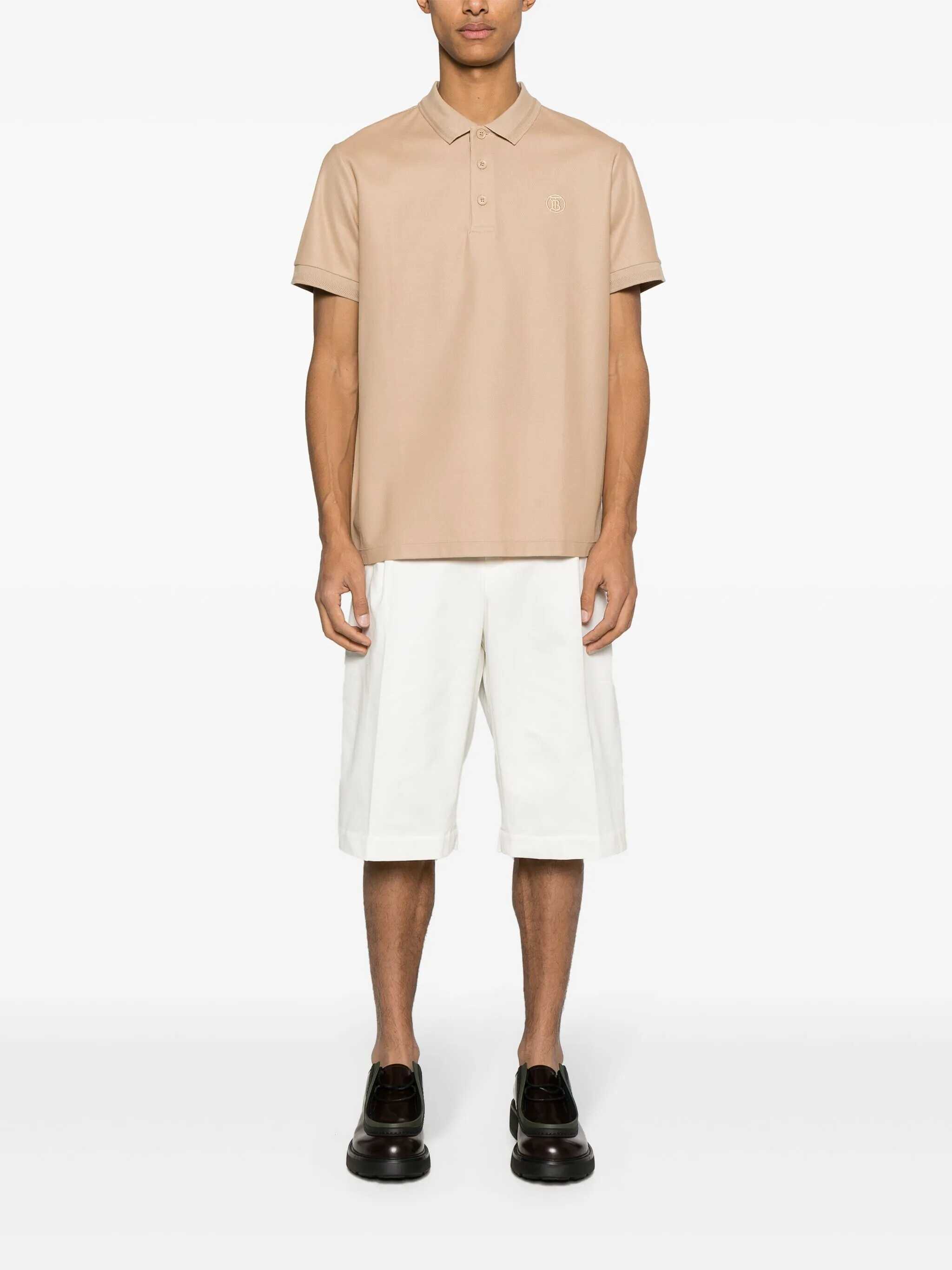 Burberry polo shirt crafted from beige cotton piquet, featuring a TB logo embroidery on the chest. Designed with a polo collar, three-button placket with Burberry Check detail on the inside, short sleeves, and a straight hem with small side slits.