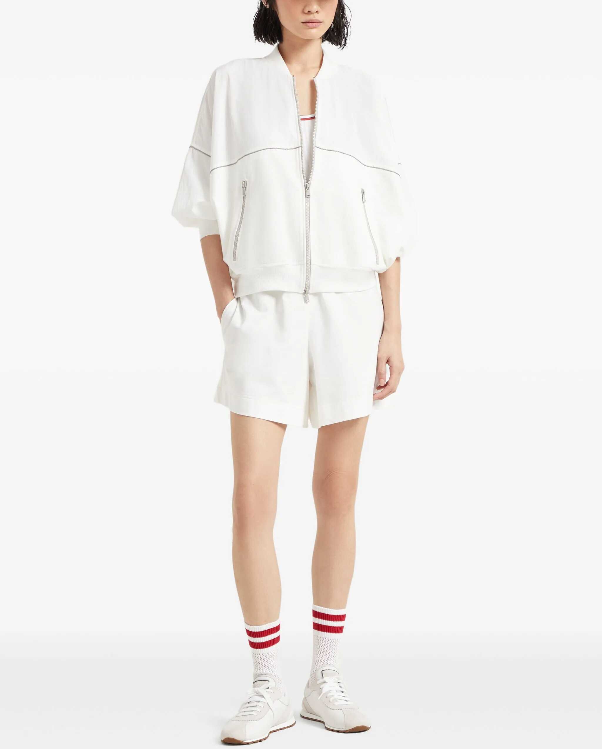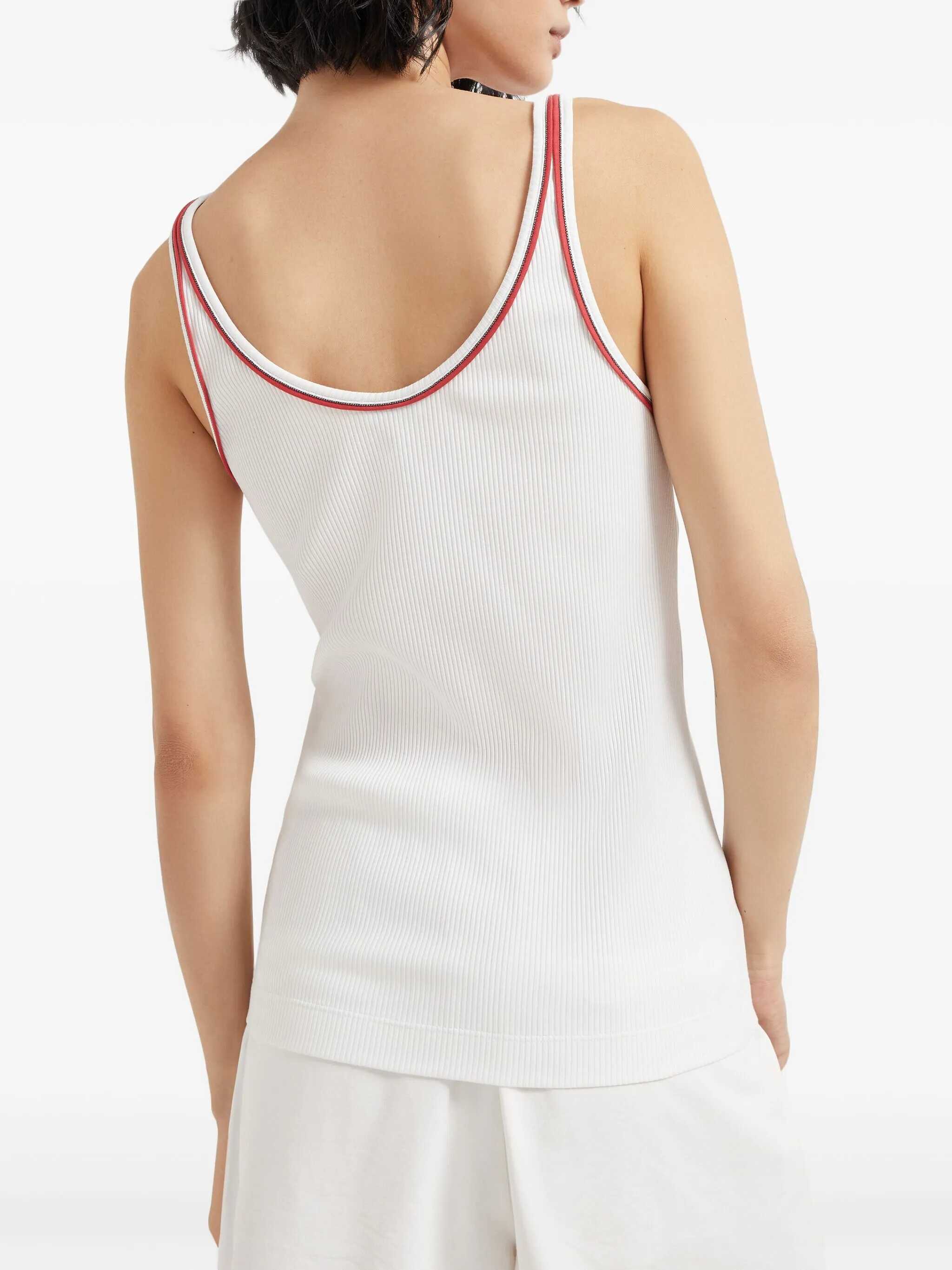 Brunello Cucinelli's Top is an essential yet refined garment that expresses the discreet elegance and craftsmanship typical of the maison. Made with a refined ribbed design, it sits naturally on the silhouette, enhancing it with sobriety. The round neckline is embellished with delicate contrasting details and a row of shiny jewels along the seams, the brand's distinctive signature, adding a bright and sophisticated touch without being excessive.
