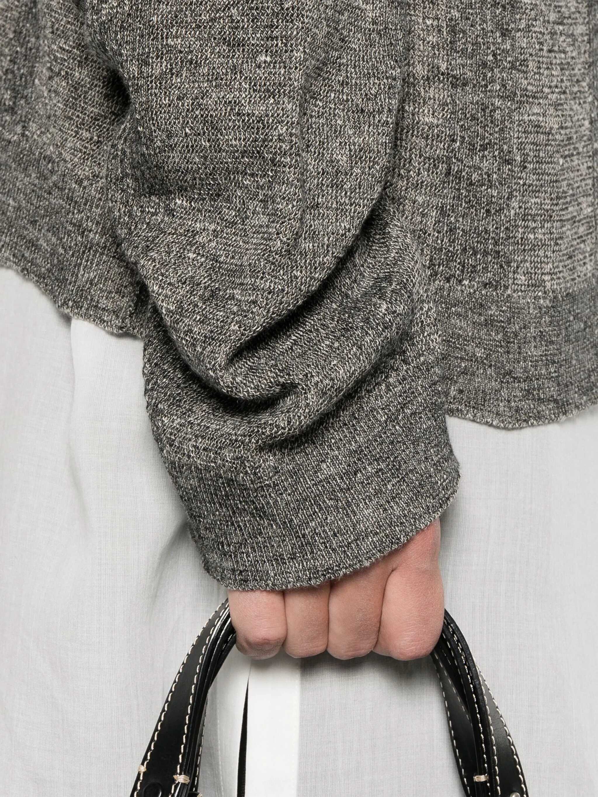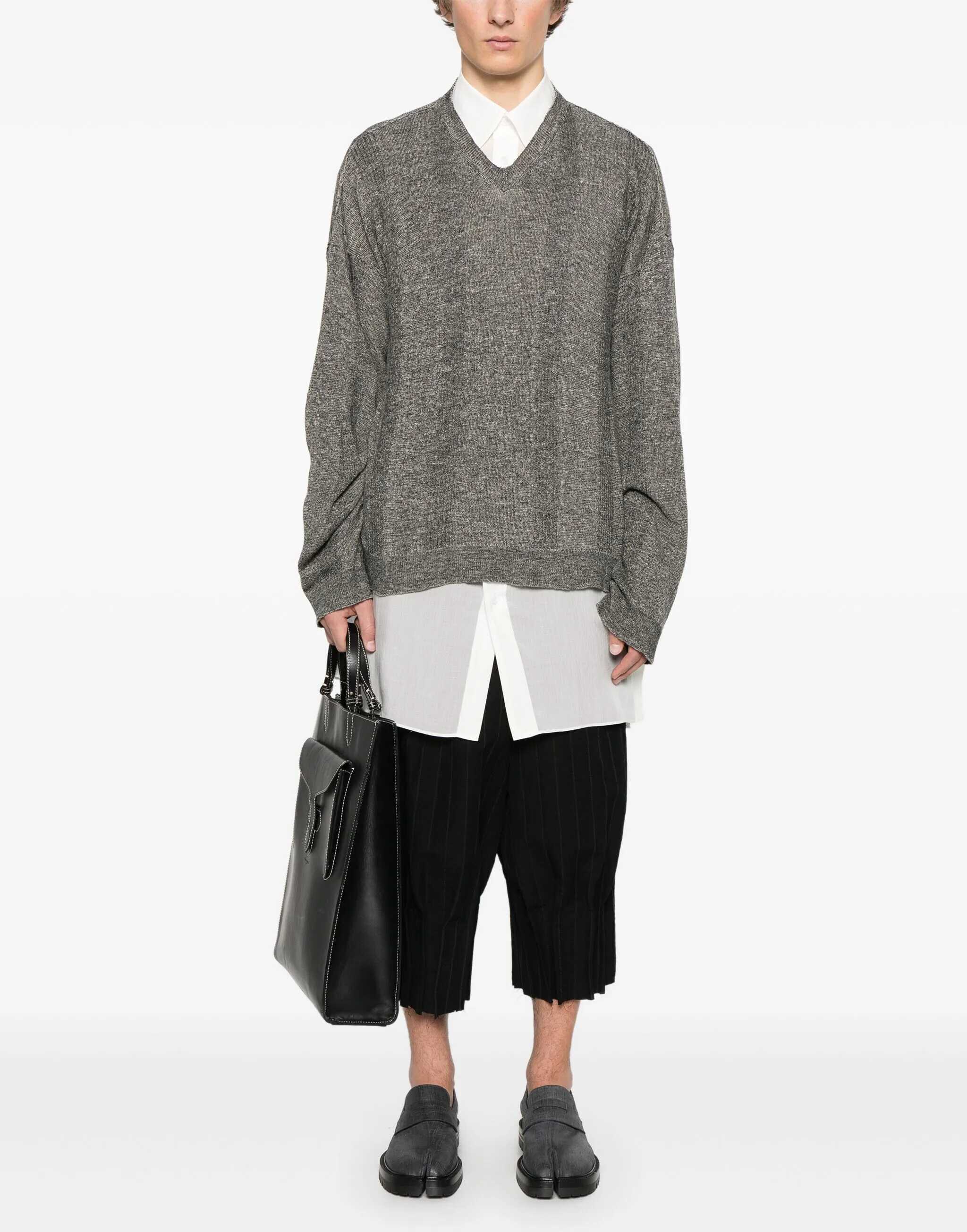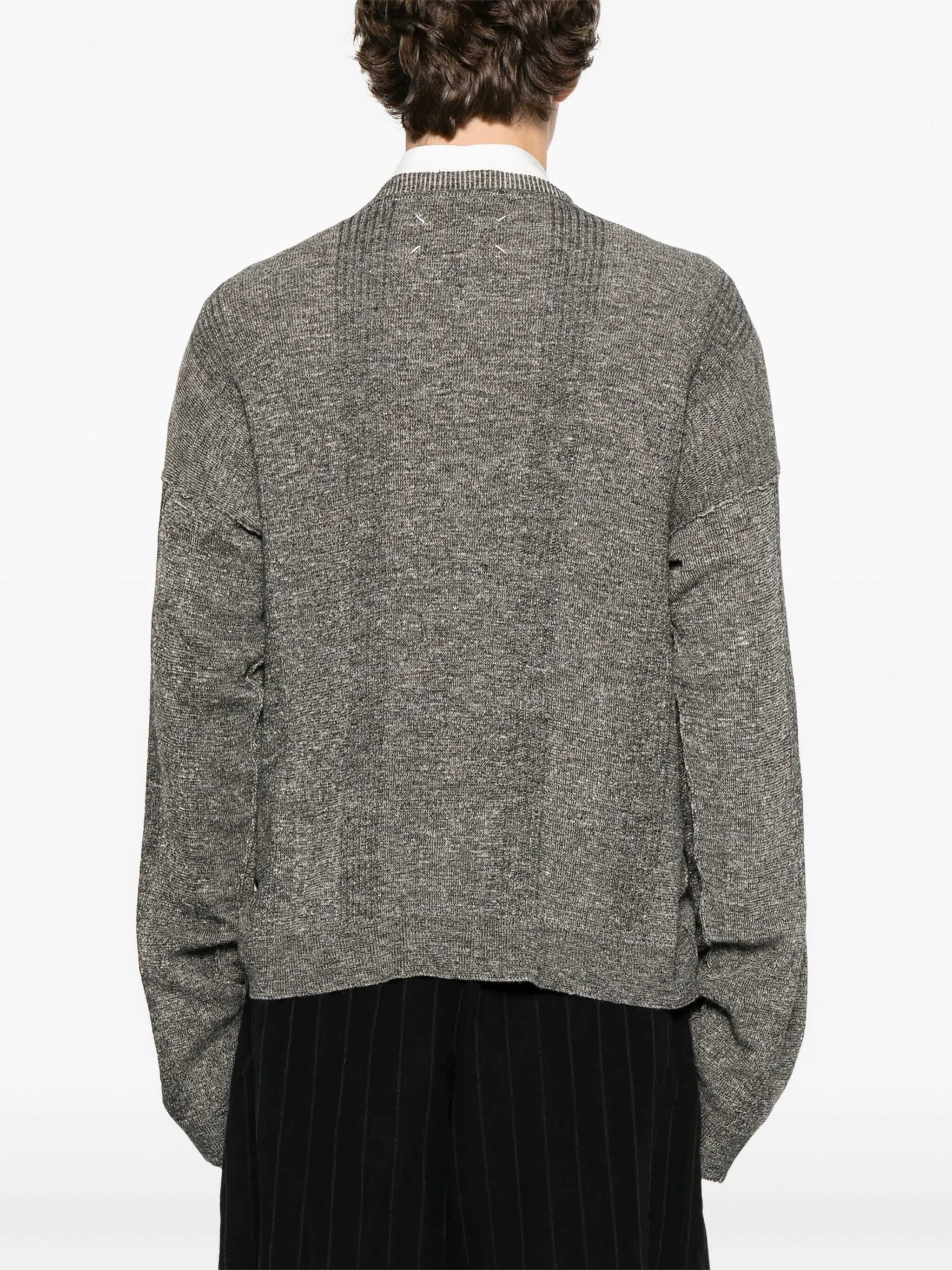 Linen and cotton mélange V-neck oversized Sweater by Maison Margiela, perfect for a relaxed yet refined style. Featuring a mélange pattern, it features a V-neck on the front, brand-typical exposed seams, and ribbed cuffs and hem that define the structure. The oversized fit gives a contemporary and comfortable feel, ideal for casual yet distinctive looks.