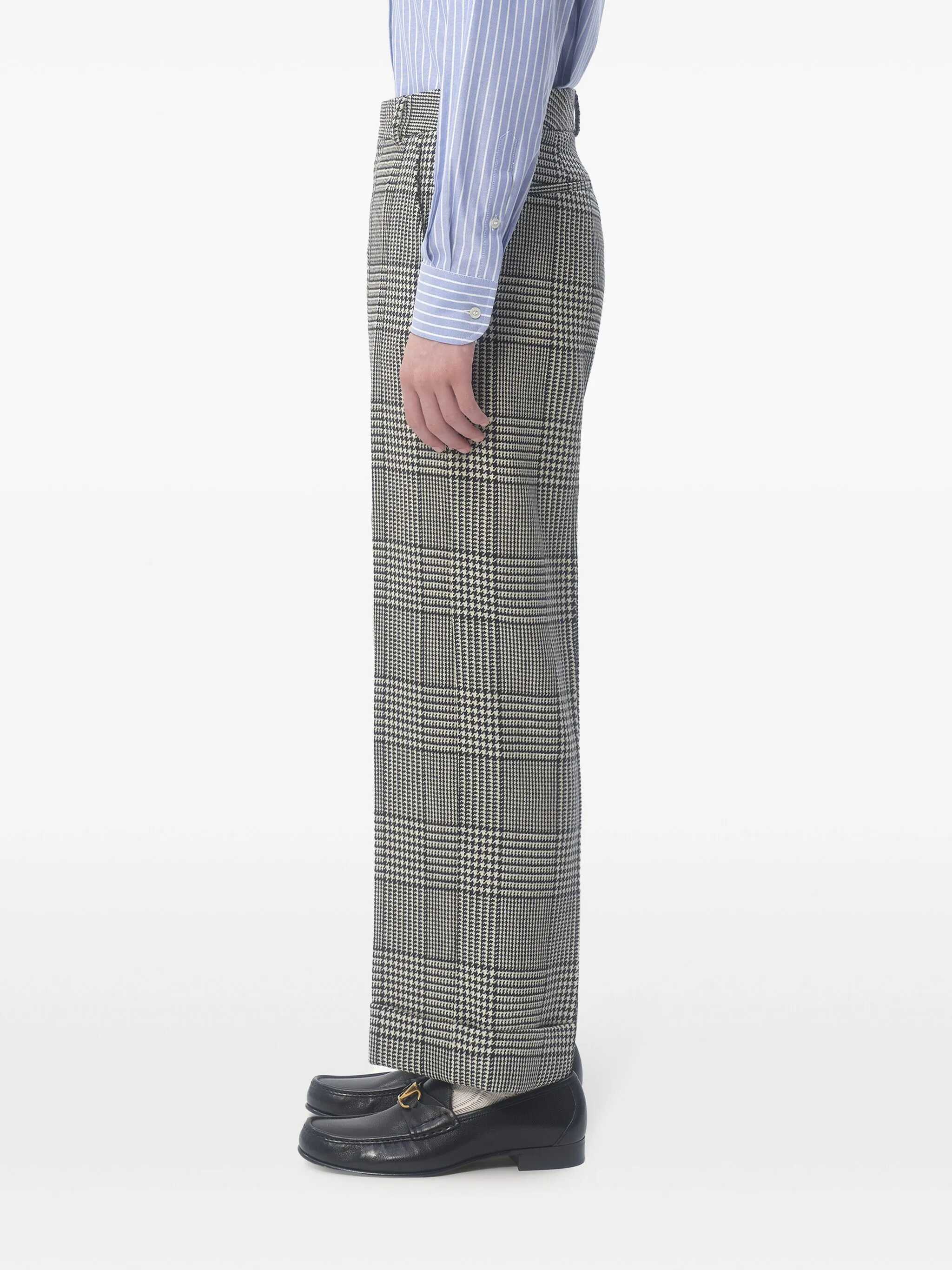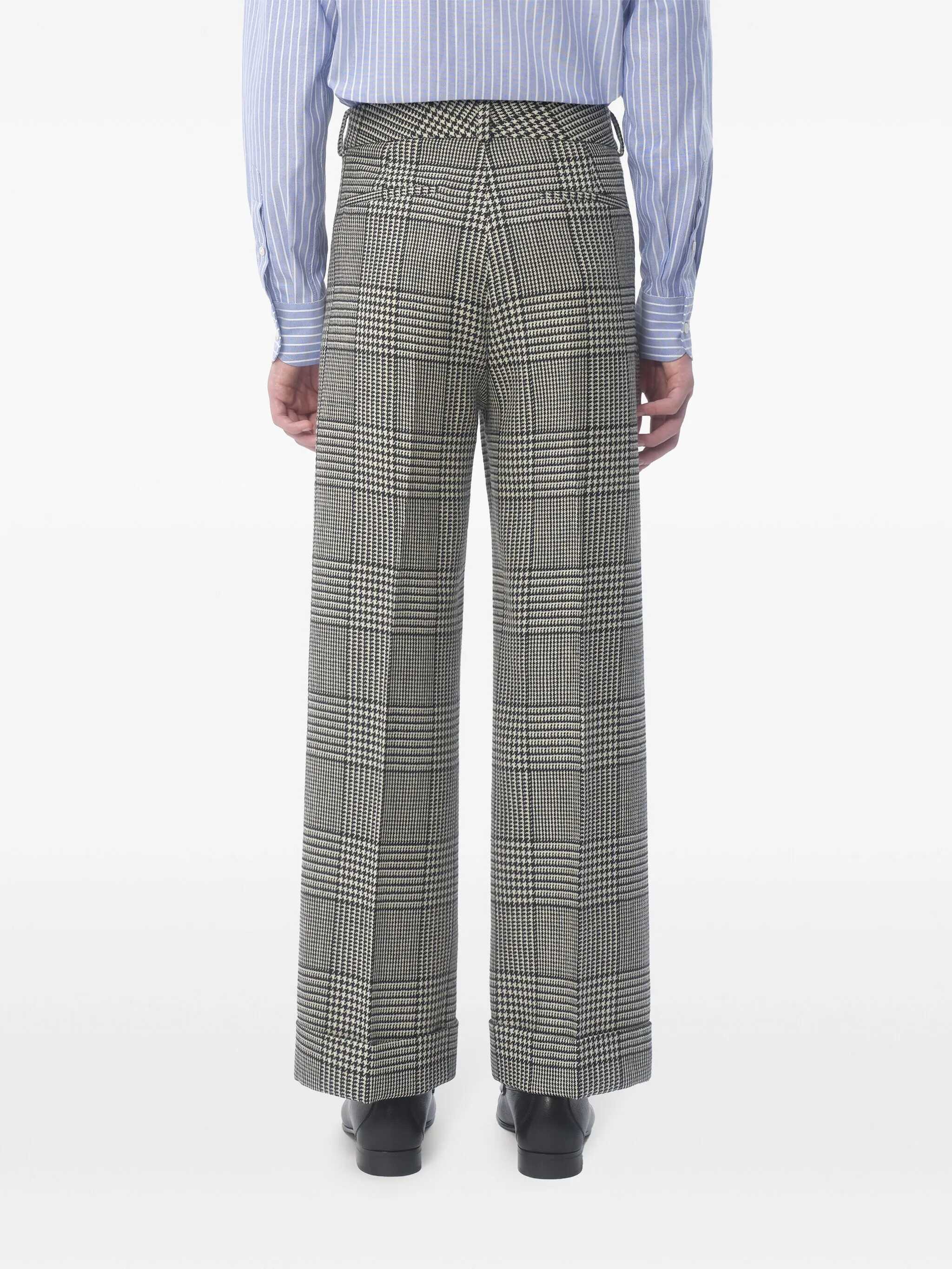 White/black tartan check pattern concealed front fastening belt loops two side slit pockets two rear welt pockets turn-up hem