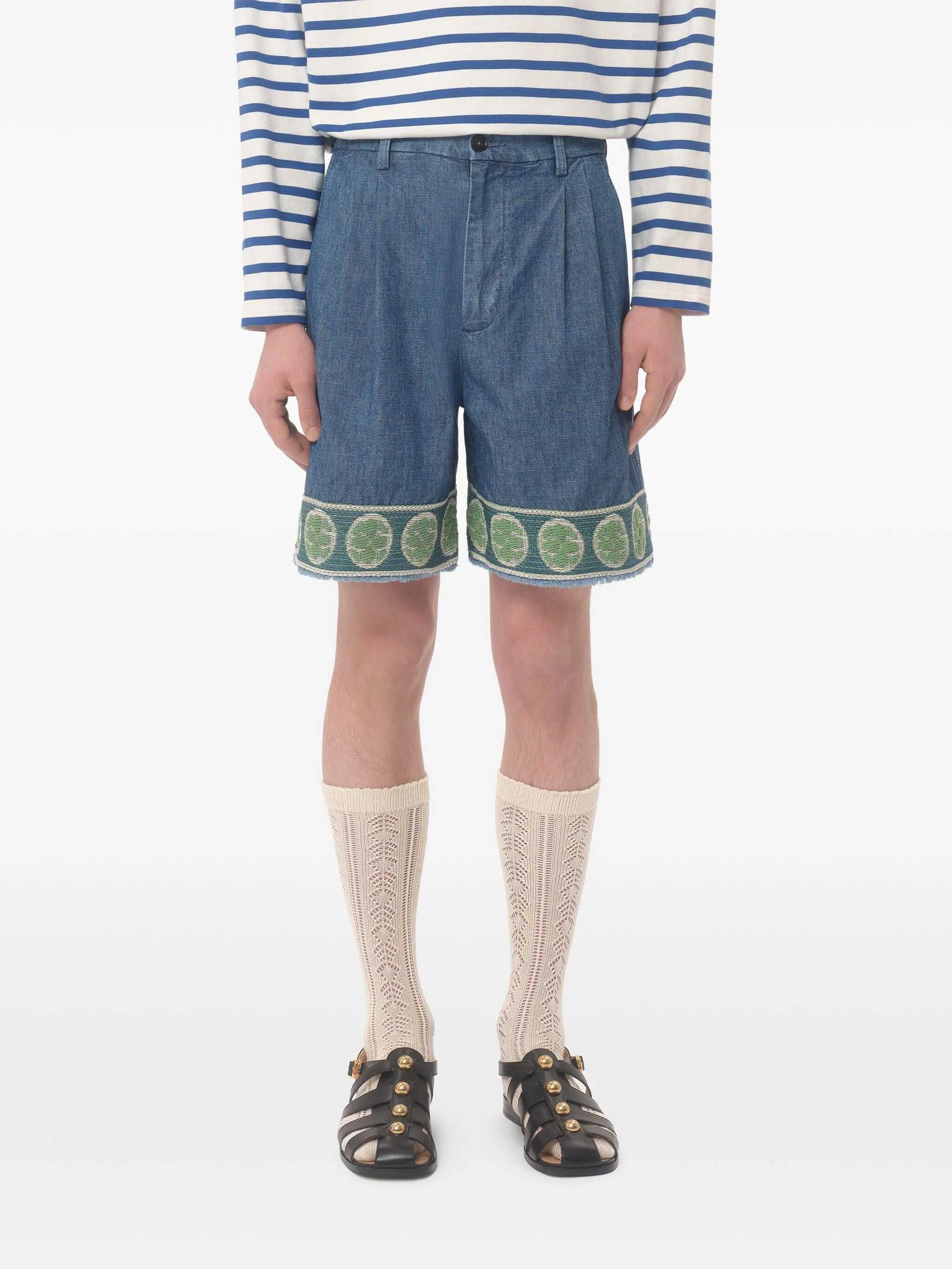 Light blue button fly fastening two side slash pockets two rear button-fastening jetted pockets embroidered motif
