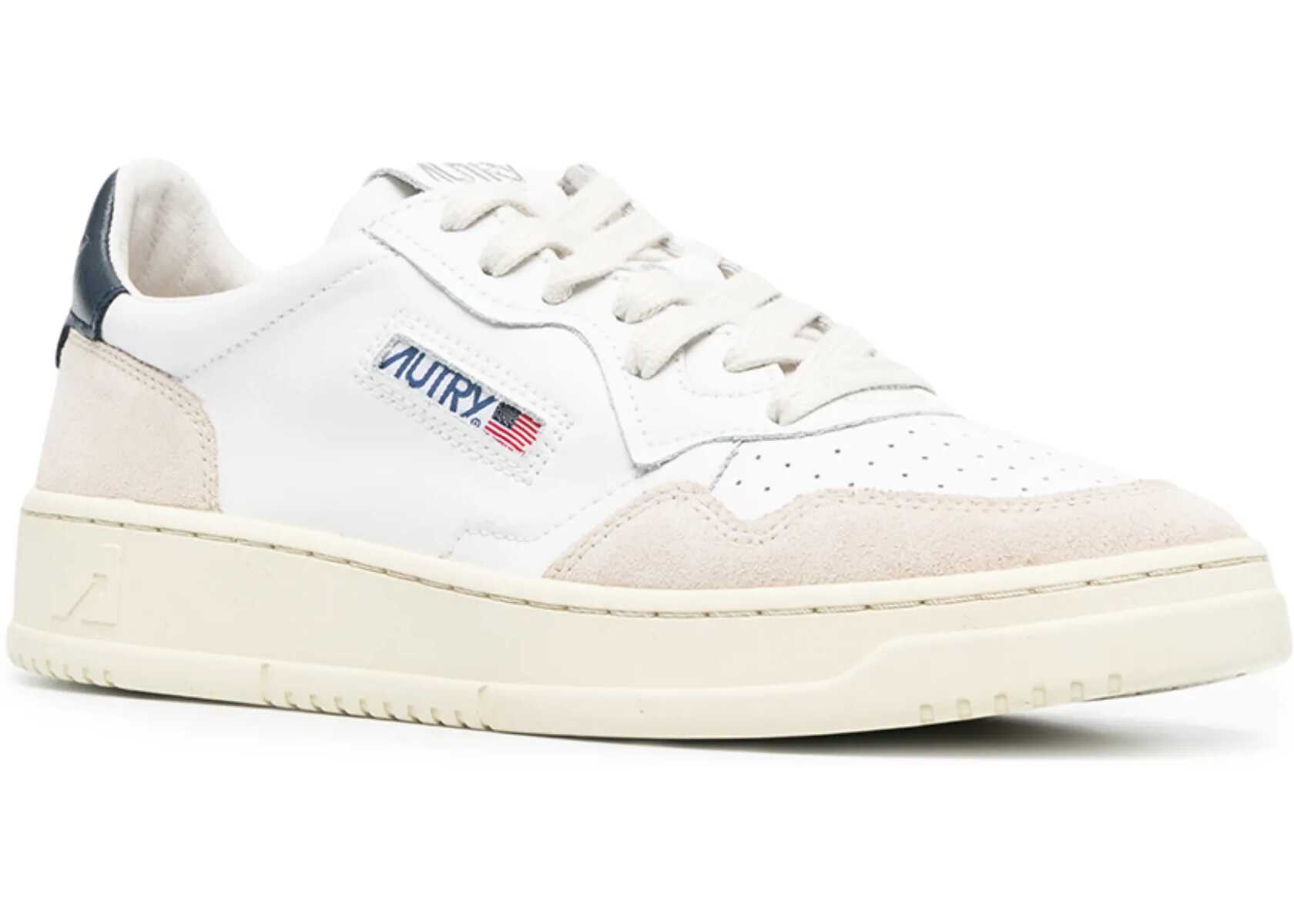 Low-top sneakers in white leather with suede inserts, blue heel and rubber sole. They feature lace-up closure, perforated toe, side detail with Autry blue logo, logo on tongue and embossed logo on the back. Dust bag included. Any leather imperfections are not to be considered manufacturing defects, but a peculiarity of the material.