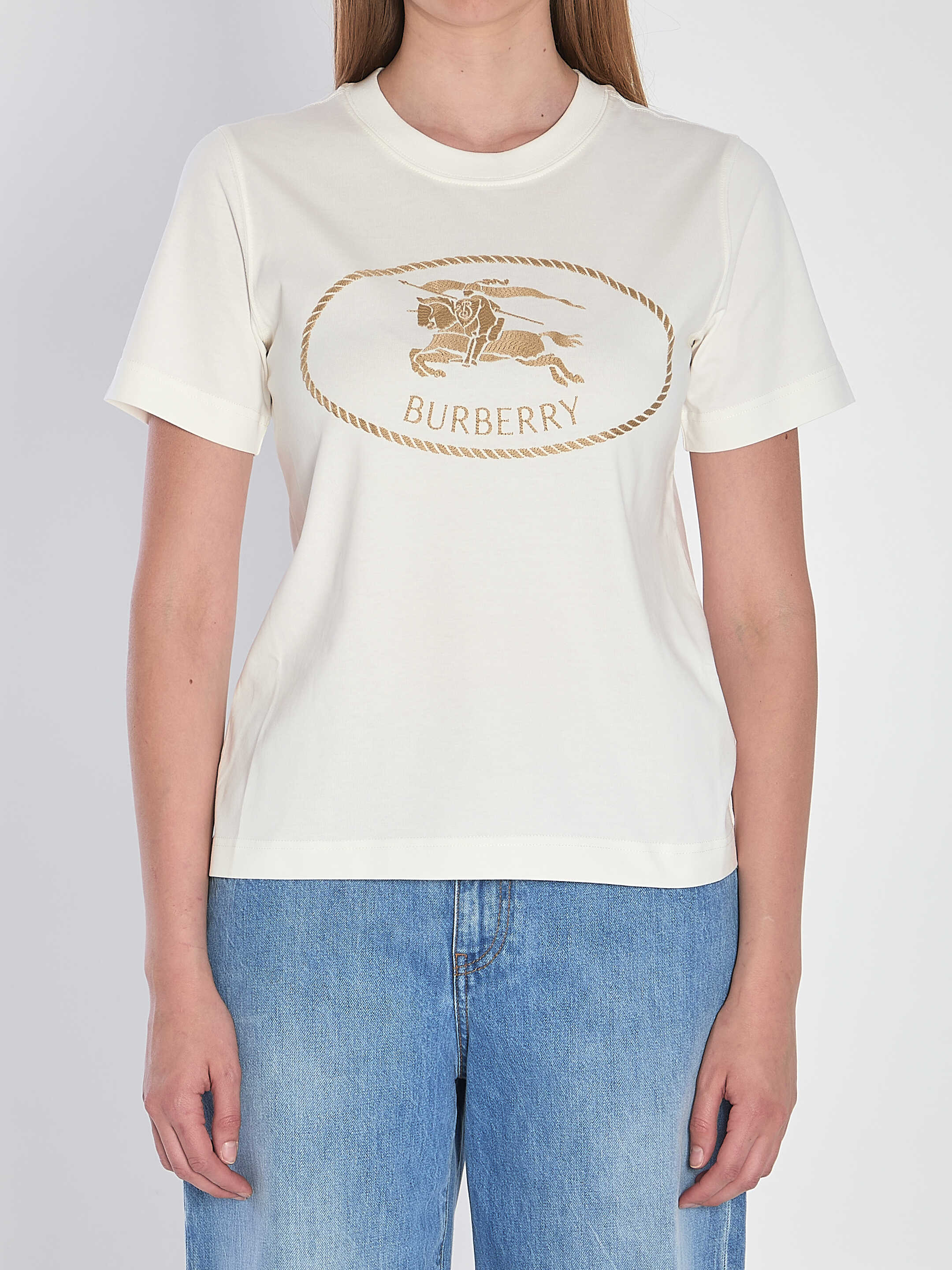 White crew-neck t-shirt in lightweight cotton jersey with short sleeves. It features a beige embroidered Knight Stamp on the chest and a ribbed neckline.