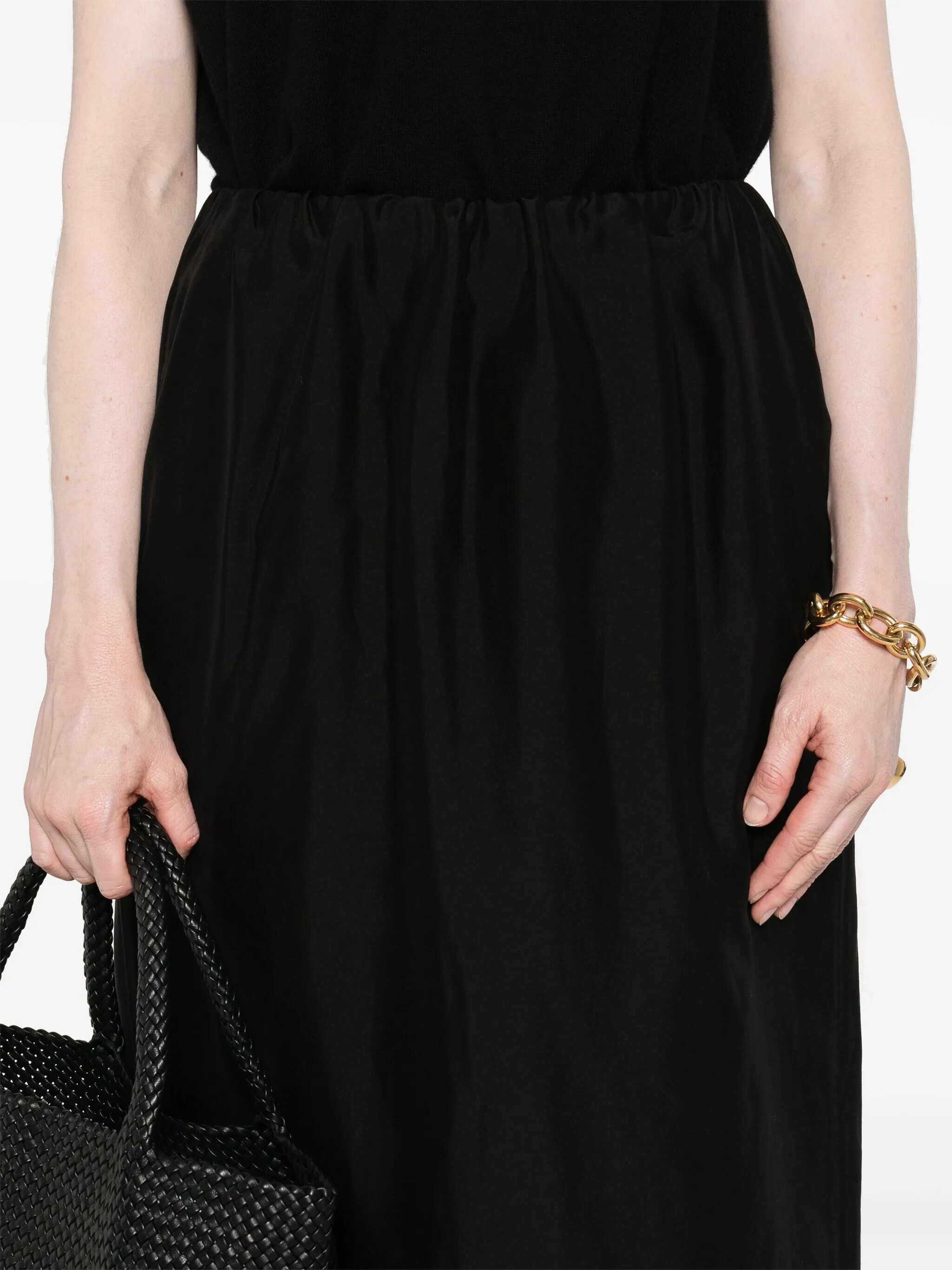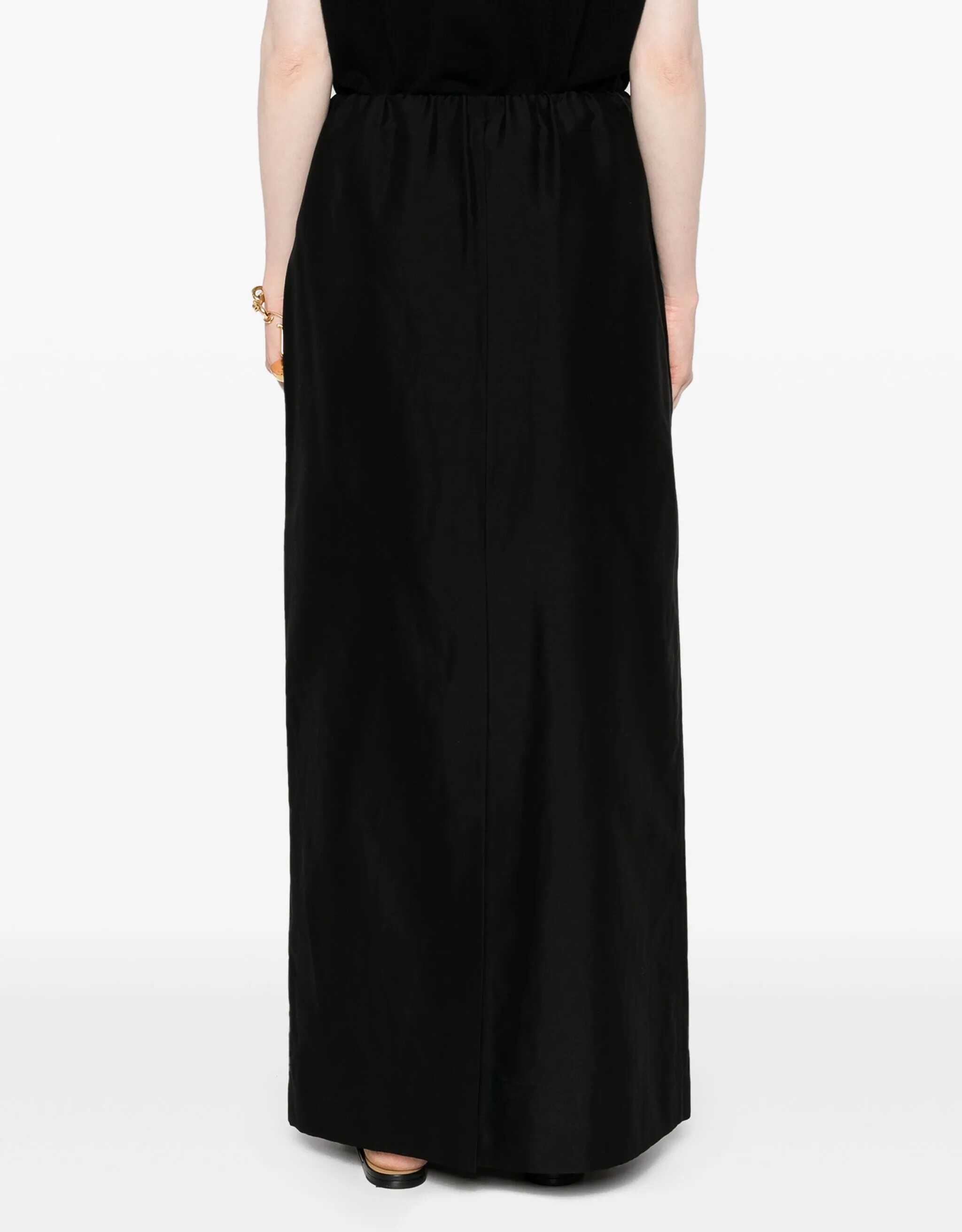 Saul long skirt in black cotton and silk. It features an elastic gathered waistband, two hidden side pockets, a back slit, and a slightly flared shape.