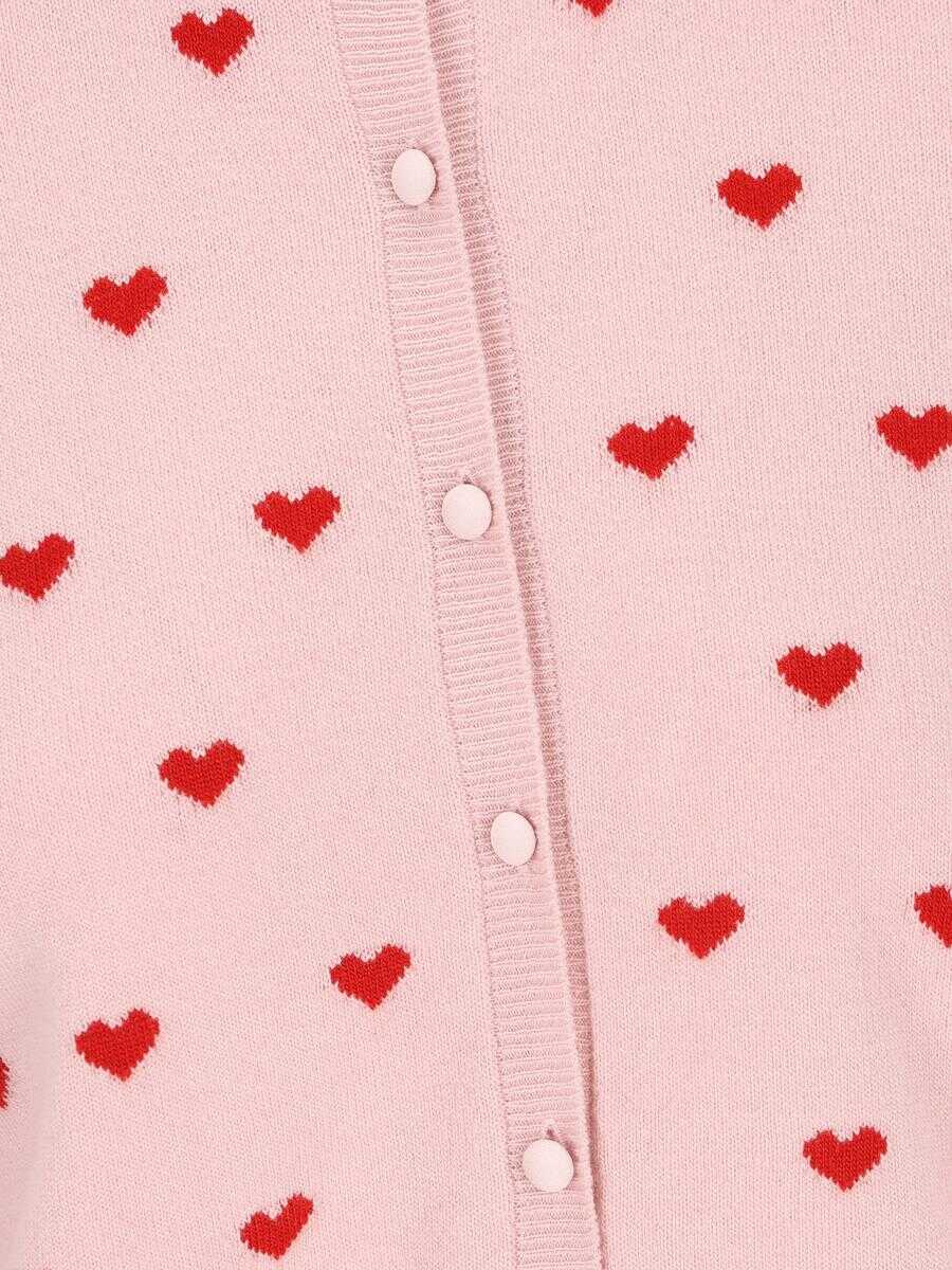 Valentino sweater in pink wool with red hearts, an iconic and playful garment that expresses romance with a couture twist. The compact design and all-over graphic pattern make it perfect for completing feminine looks with a distinctive ironic touch - Material: 100% virgin wool - Color: pink - Ribbed collar - Long sleeves - Ribbed hem and cuffs - Front button closure - Made in Italy - Item code: 7B3KA12P9J0BRQ