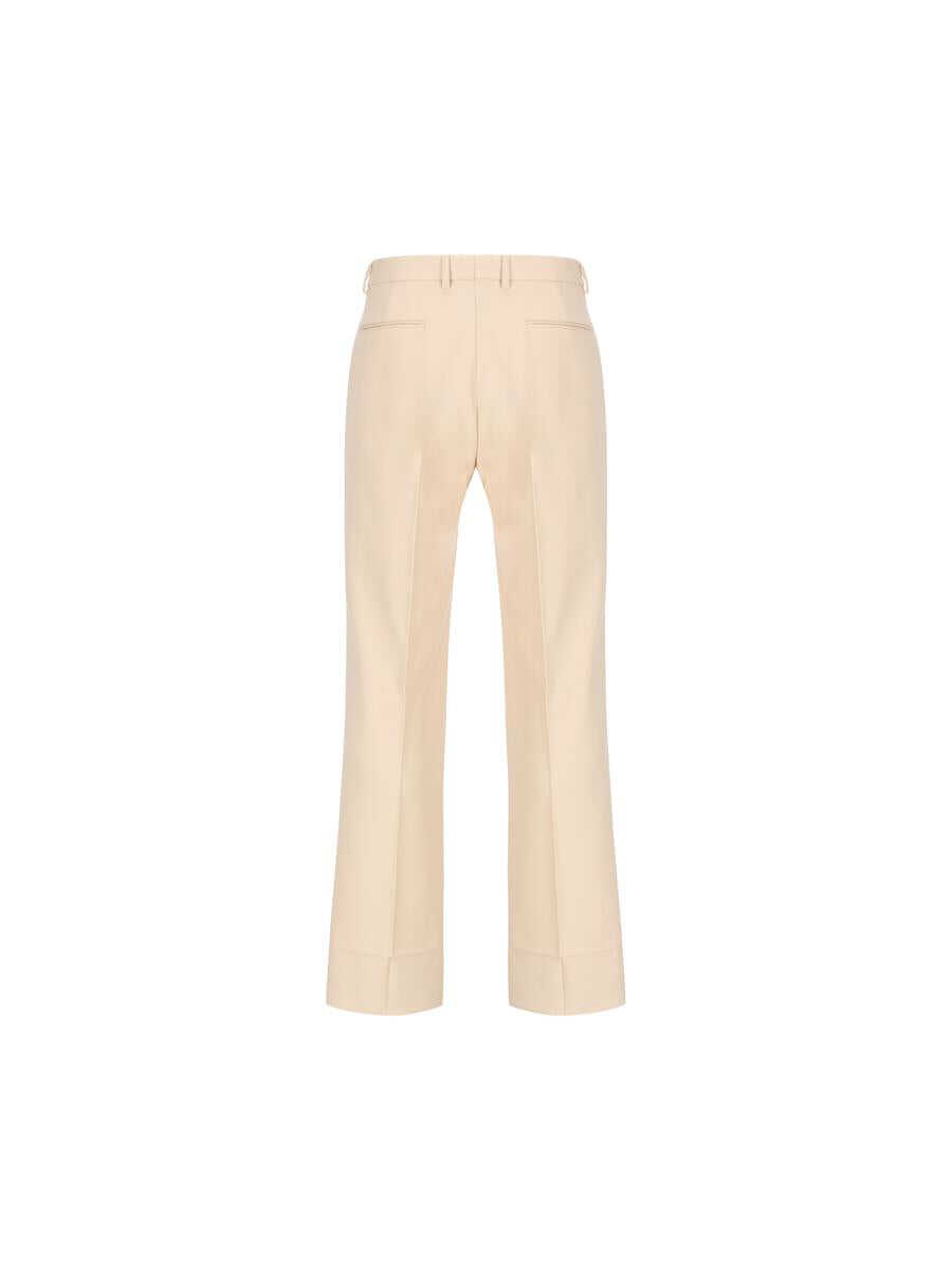 Valentino pants in wool gabardine, an essential garment with a tailored character and a revisited masculine cut. Made of compact and fluid fabric, they stand out for their clean and versatile lines, perfect for creating elegant or more casual looks with a sophisticated touch. - Material: 100% virgin wool - Color: beige - Two side pockets - Two back pockets - Straight leg - Clean hem - Regular waistband with belt loops - Zip and button closure - Made in Italy - Item code: 7V3RBN109EB581