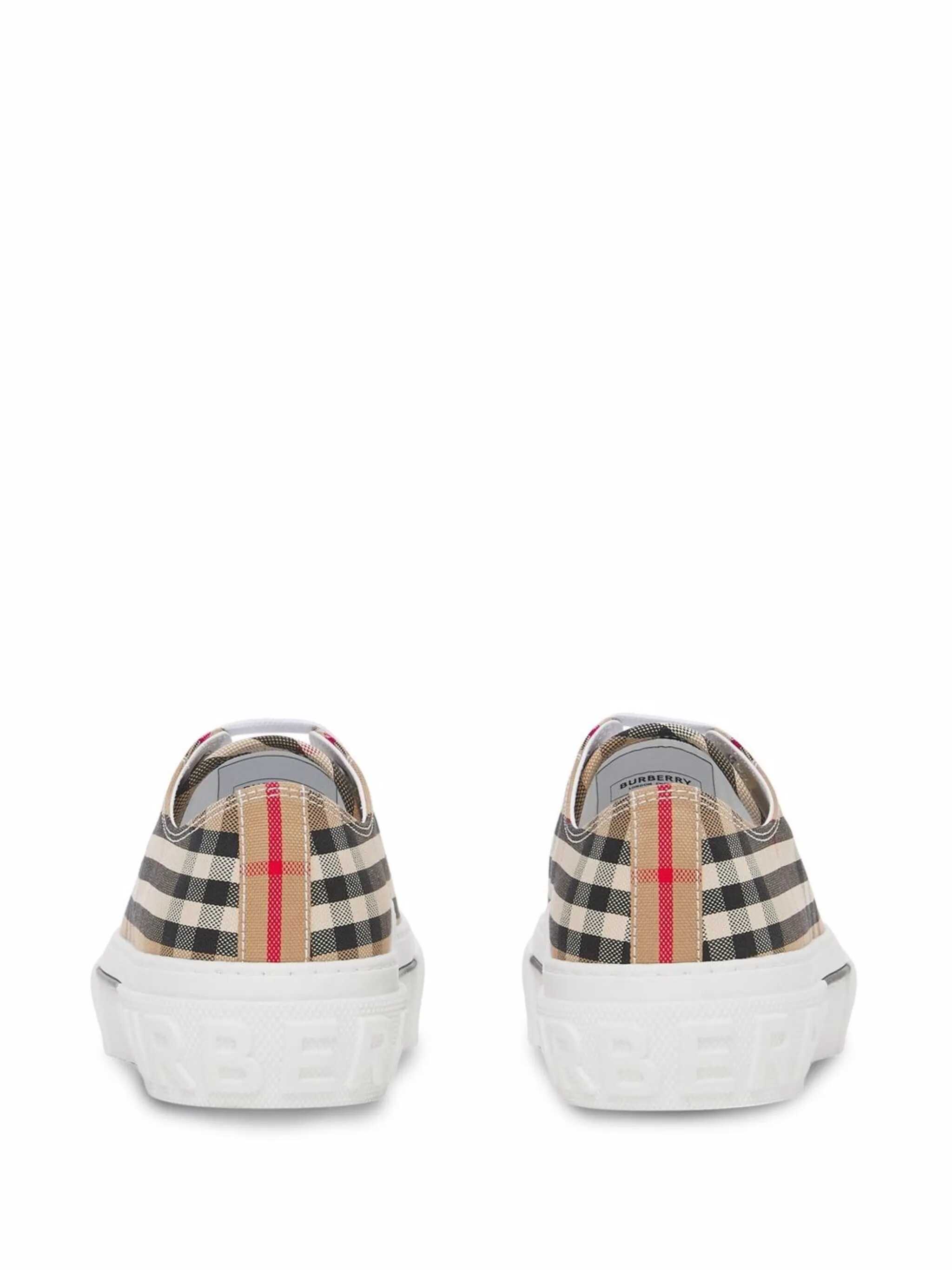 Beige cotton sneakers from Burberry featuring round toe, cotton laces, leather sole and check motif.