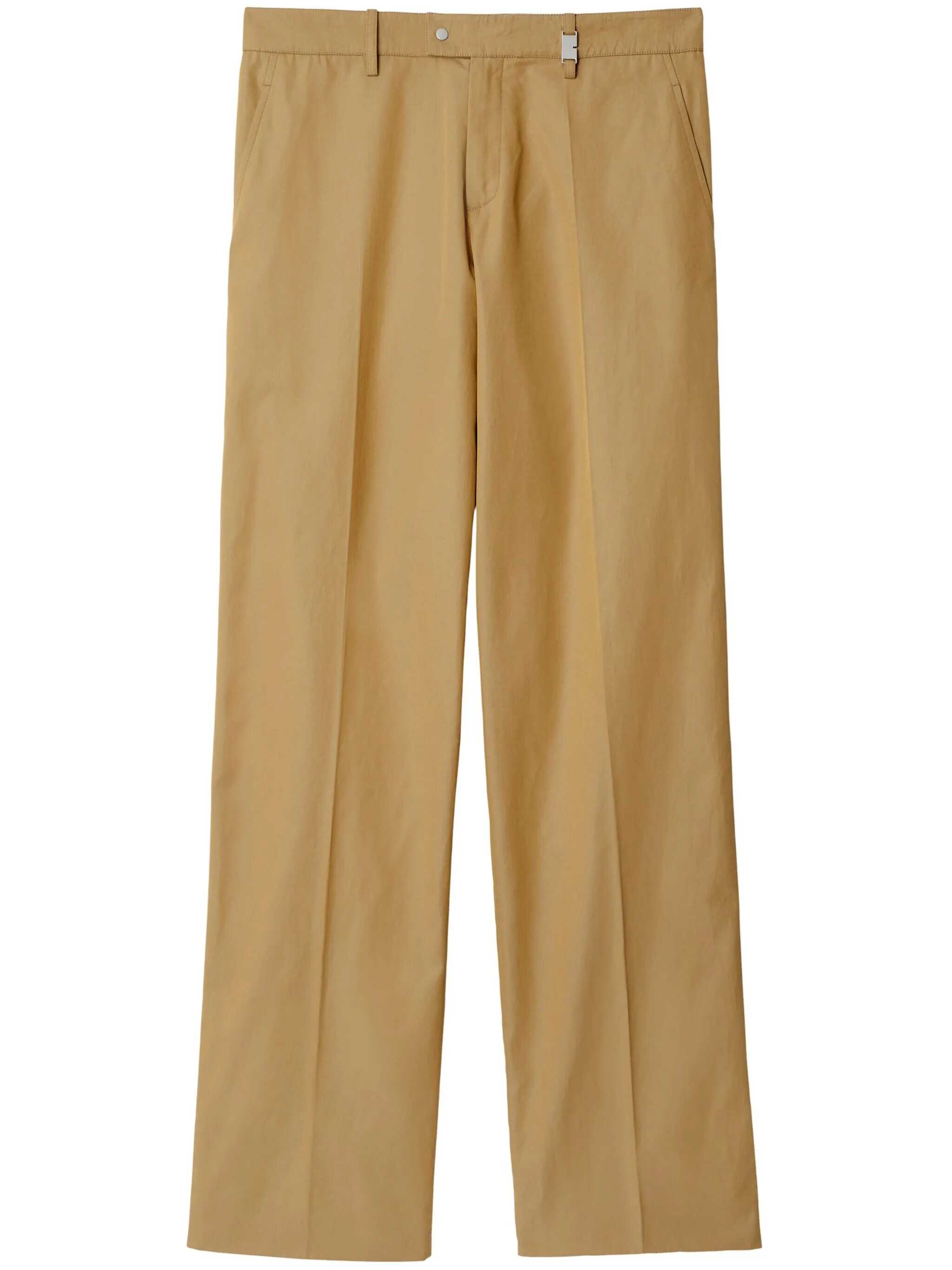Burberry's regular-fit pants crafted in beige lightweight cotton twill with iridescent effect. Featuring press-stud / button / zip closure, belt loops with B-cut detail, multiple pockets and central pressed crease.
