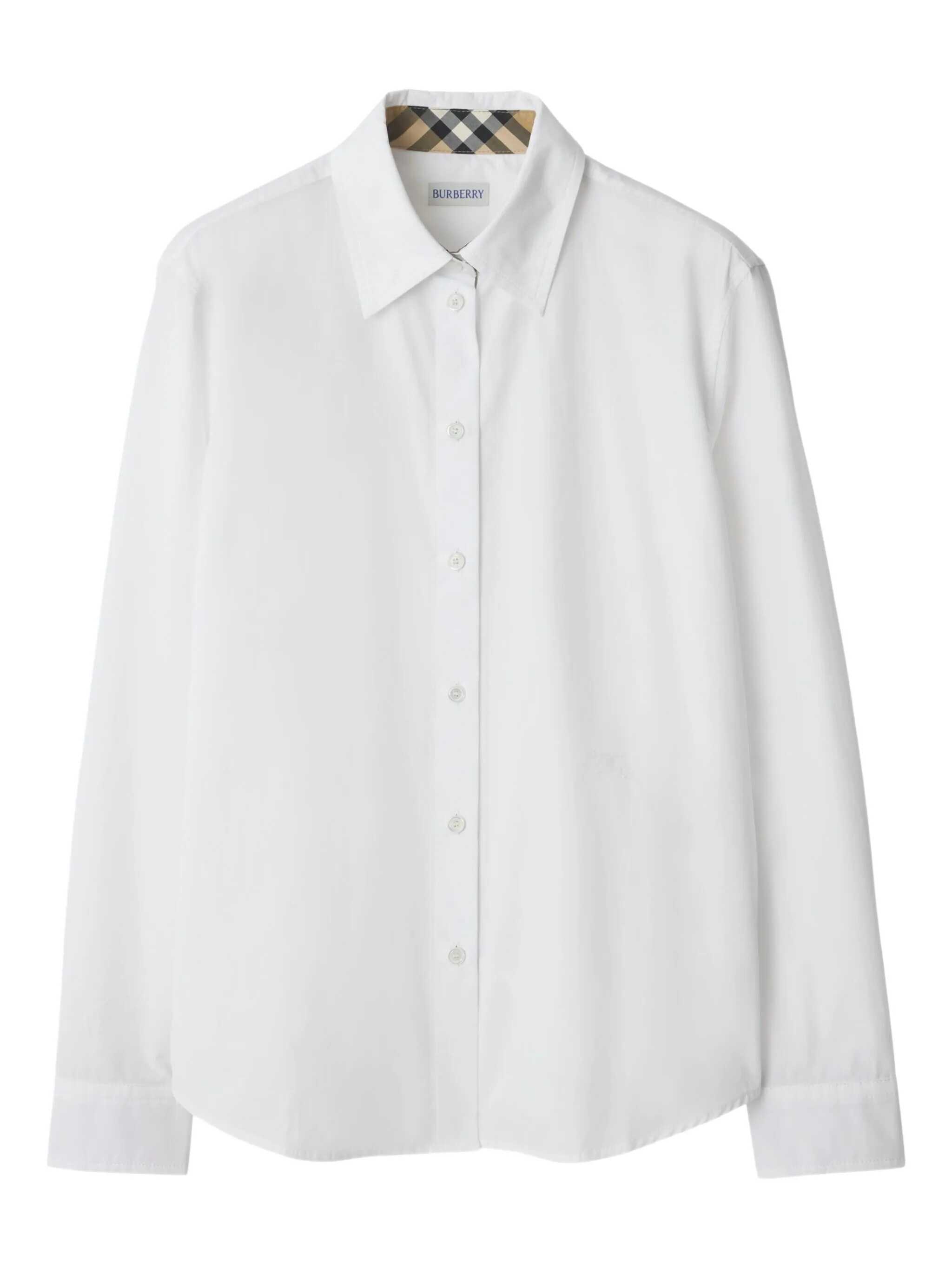 Italian cotton poplin shirt, regular fit. Exclusive details: Equestrian Knight Design embroidered on front and Burberry Check trim inside collar, placket and cuffs. Button closure, pointed collar and curved hem for elegant, timeless style.