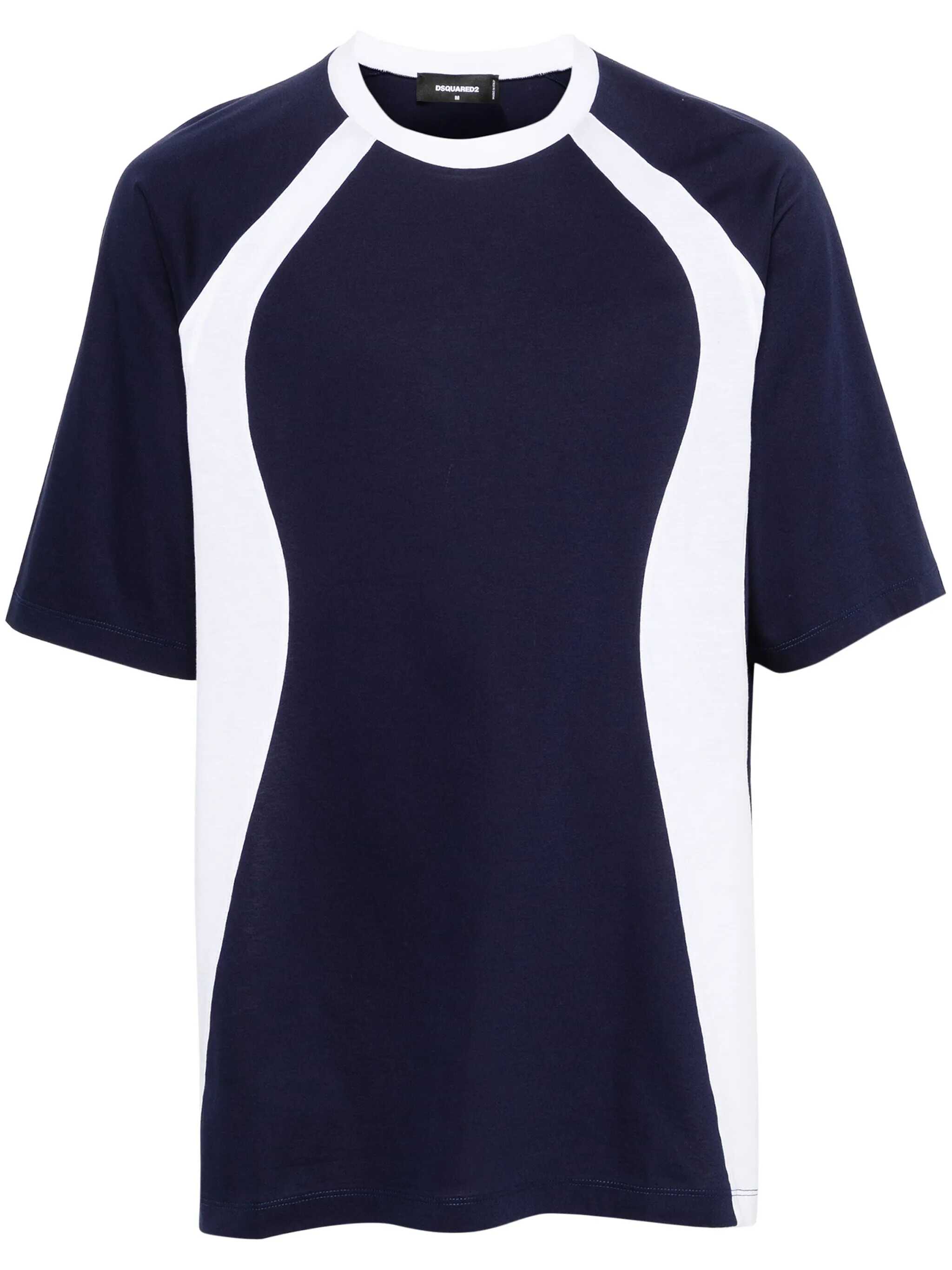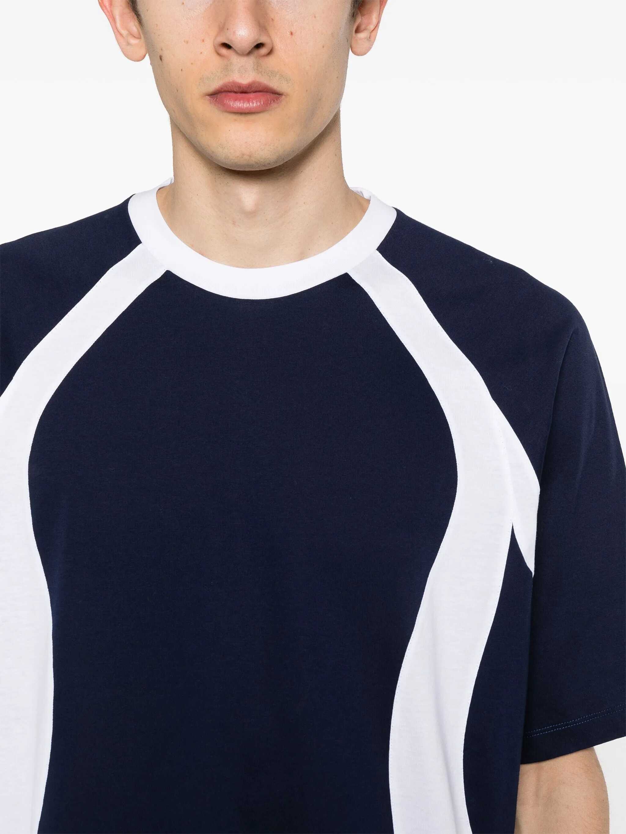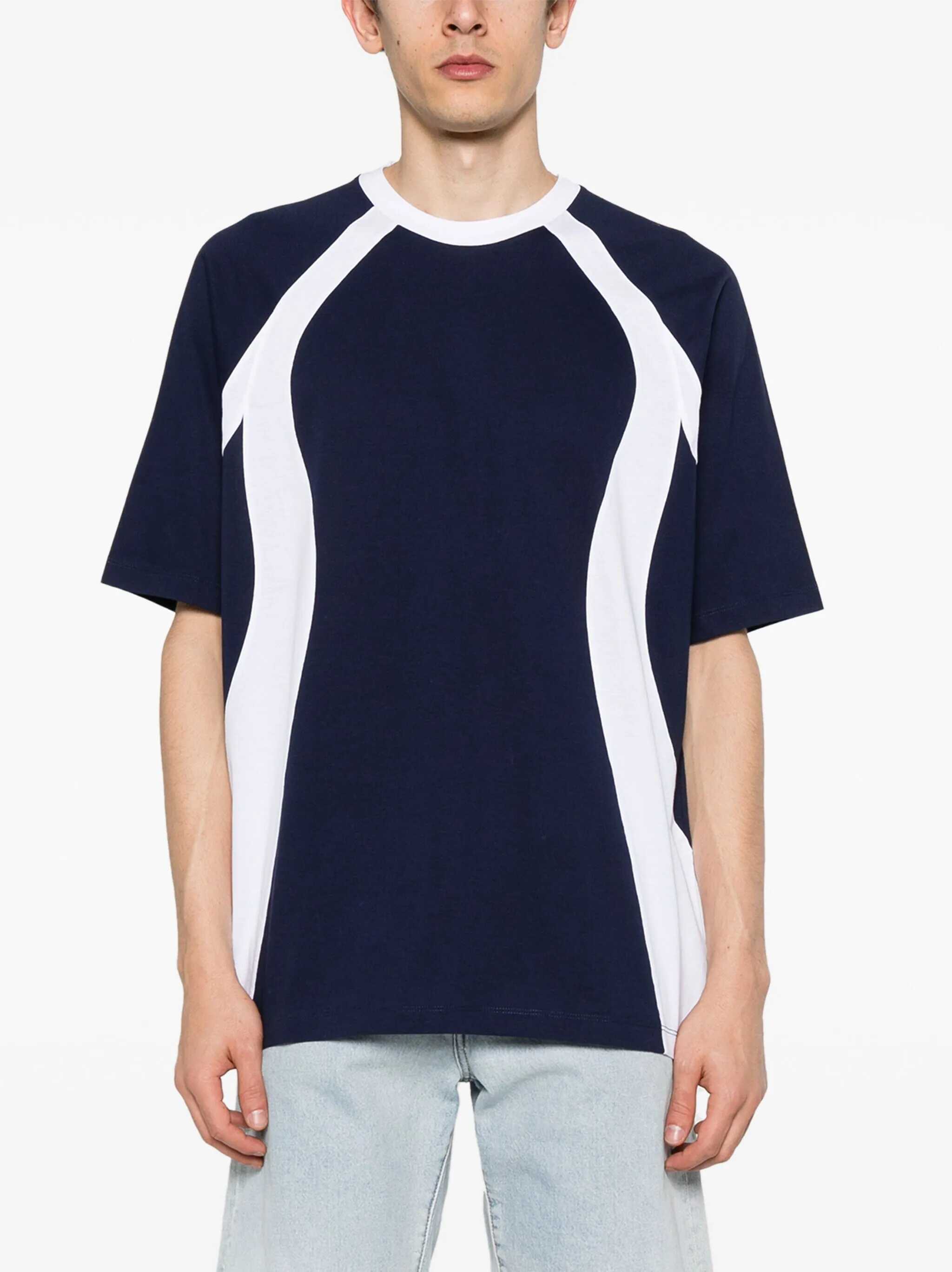 Short-sleeved T-shirt. Crew neck. Ribbed hems. Two-tone stripes on front. Printed logo on back.