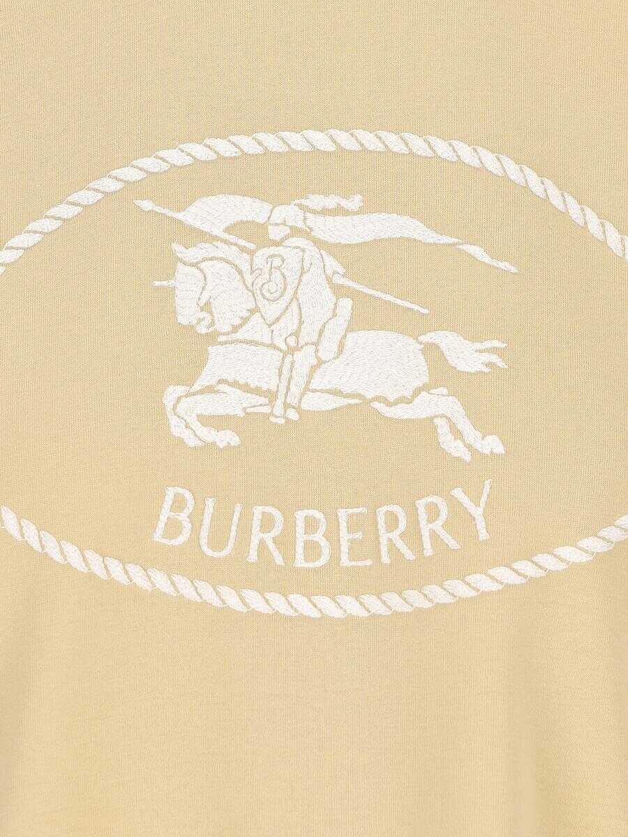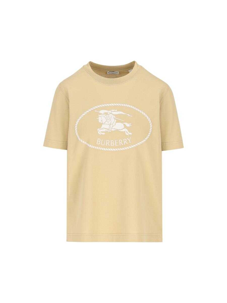Burberry cotton T-shirt with Knight print, an essential garment with a graphic design that pays homage to the iconic heritage of the British fashion house. The clean silhouette and illustrated detail give a contemporary twist to an everyday wardrobe classic. - Material: 100% cotton - Color: beige - Contrasting "Knight" print on chest - Ribbed crew neck - Short sleeves - Straight hem - Item number: 8110926A3743