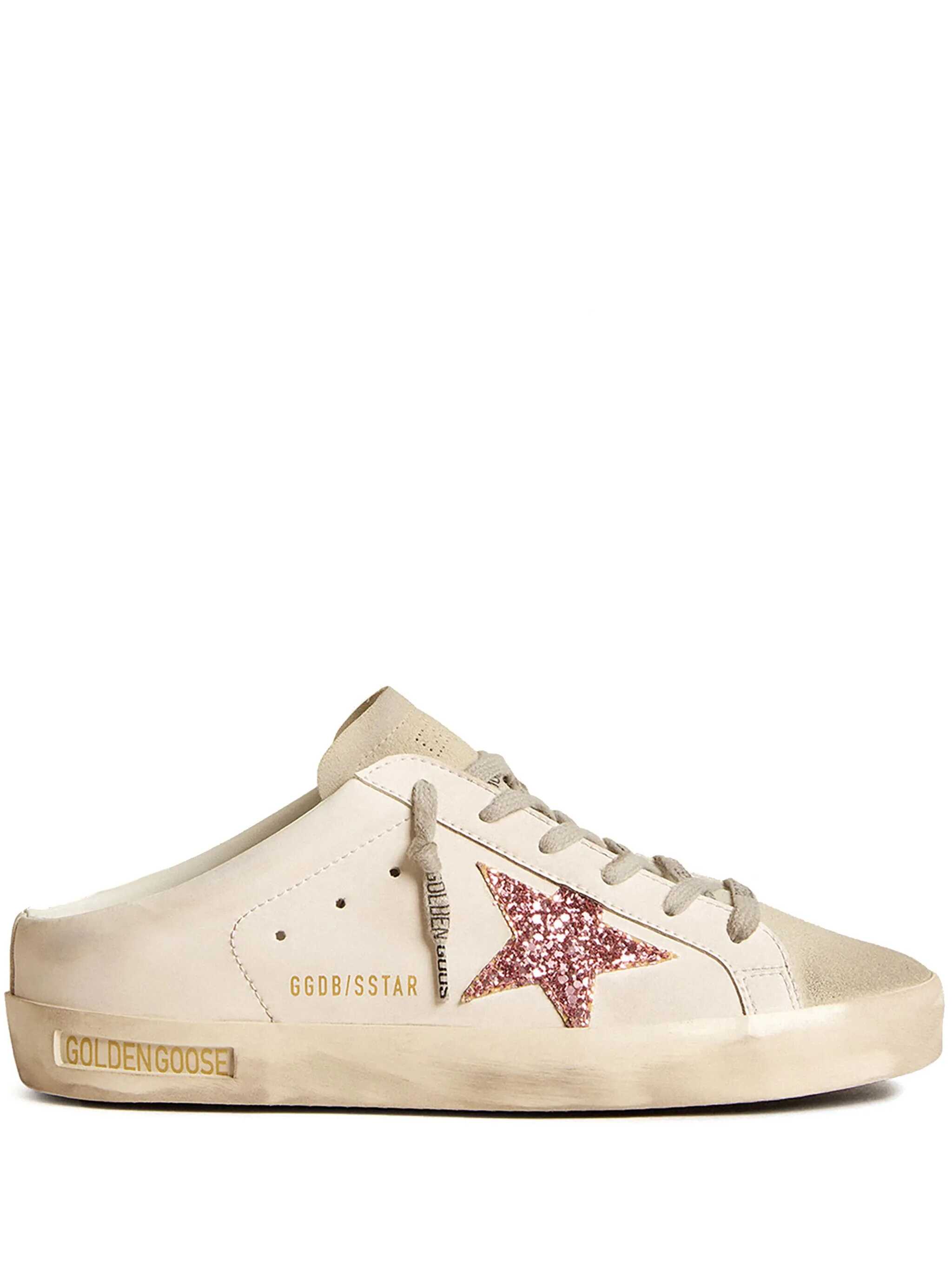 cream white/rose pink faux leather distressed effect star patch detail glitter detailing logo print to the side front lace-up fastening round toe flat rubber sole slip-on style