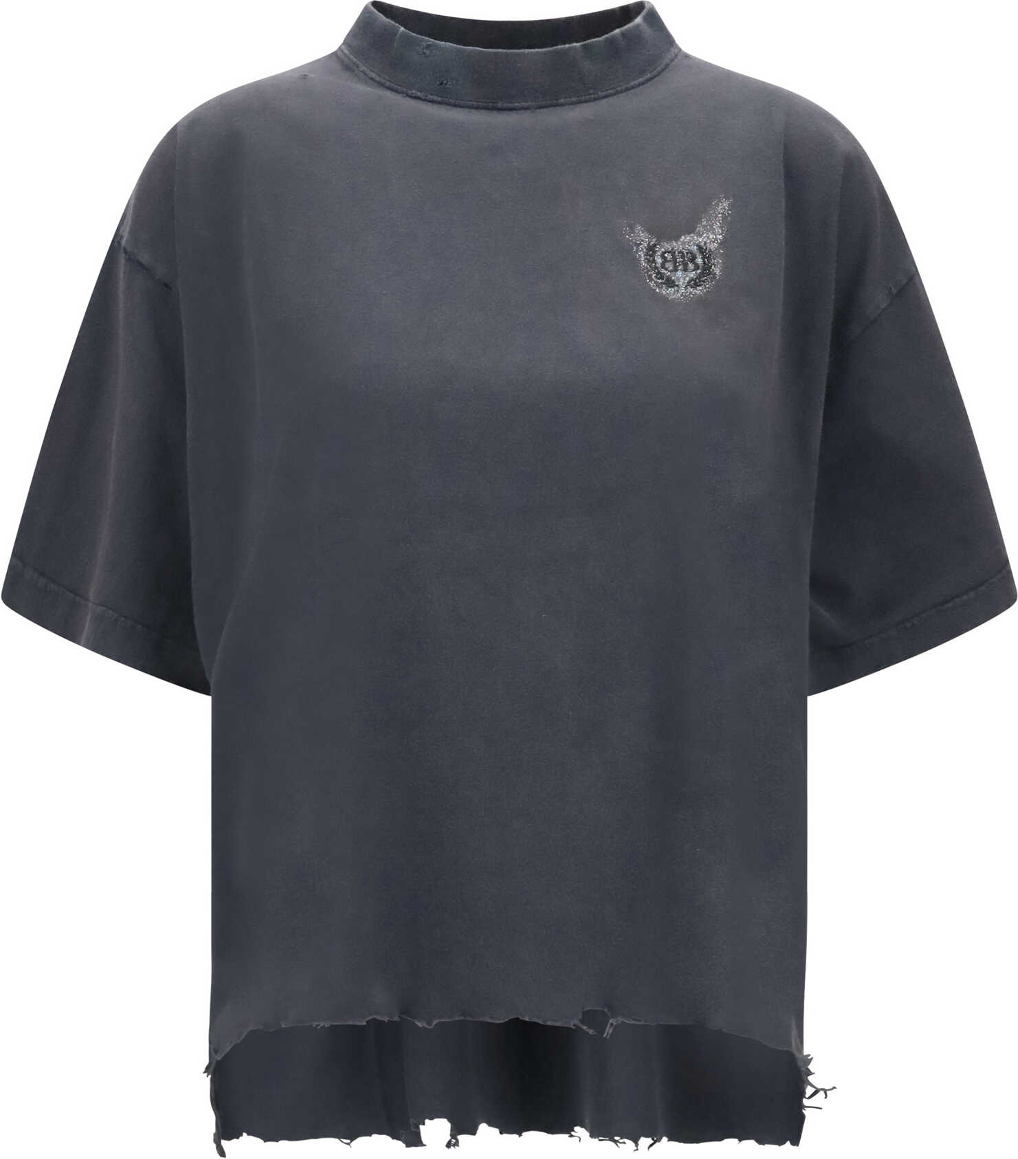 Balenciaga's cotton T-Shirt is a bold, modern piece that combines comfort and contemporary style. The cropped design with ribbed crew neck offers a chic and dynamic fit. The iconic embroidered logo on the front adds a recognizable touch, while the glitter monogram print on the back panel gives a bright and original effect. The destroyed treatment gives the T-shirt a worn-in look, adding a distinctive, urban character to the look.