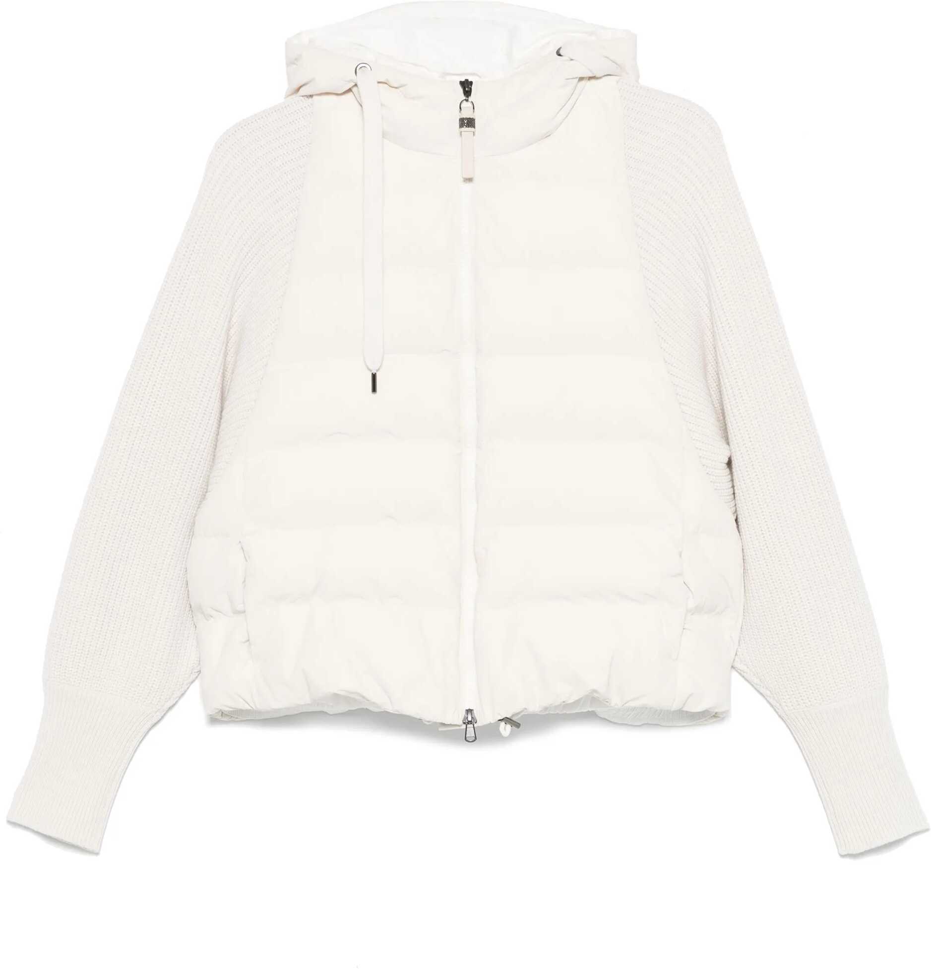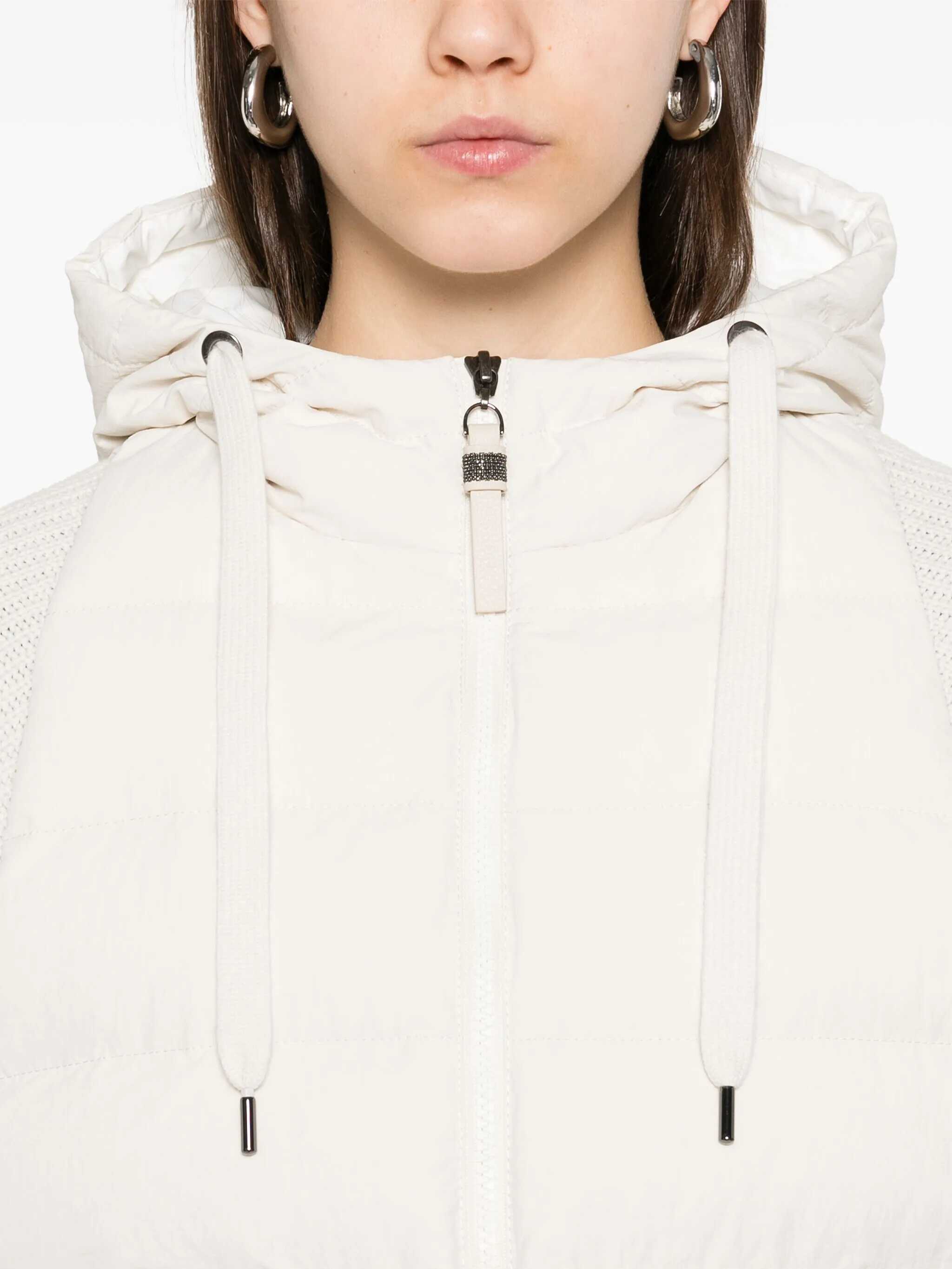 Brunello Cucinelli's wool sleeved Down Jacket is an innovative garment that blends functionality and sophisticated style. The model, with an adjustable drawstring hood, offers comfort and protection, while the front zipper closure ensures practicality. The two side welt pockets are ideal for storing small items, while the ribbed knit sleeves add a touch of warmth and contrasting texture. The padded, quilted design completes the down jacket with a modern, wrap-around look perfect for colder seasons.