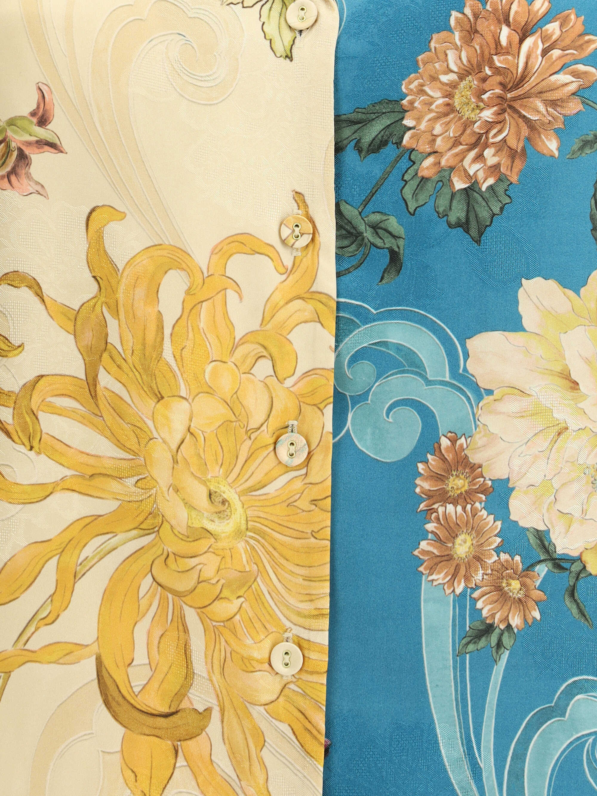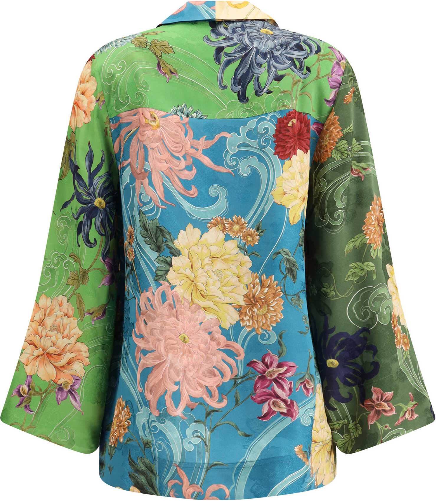 The Avery Shirt by Alemais is a feminine and sophisticated garment made from fluid silk and embellished with a vibrant multicolored floral pattern. The design is complemented by a classic lapel and a front button closure for a refined yet casual style perfect for summer.
