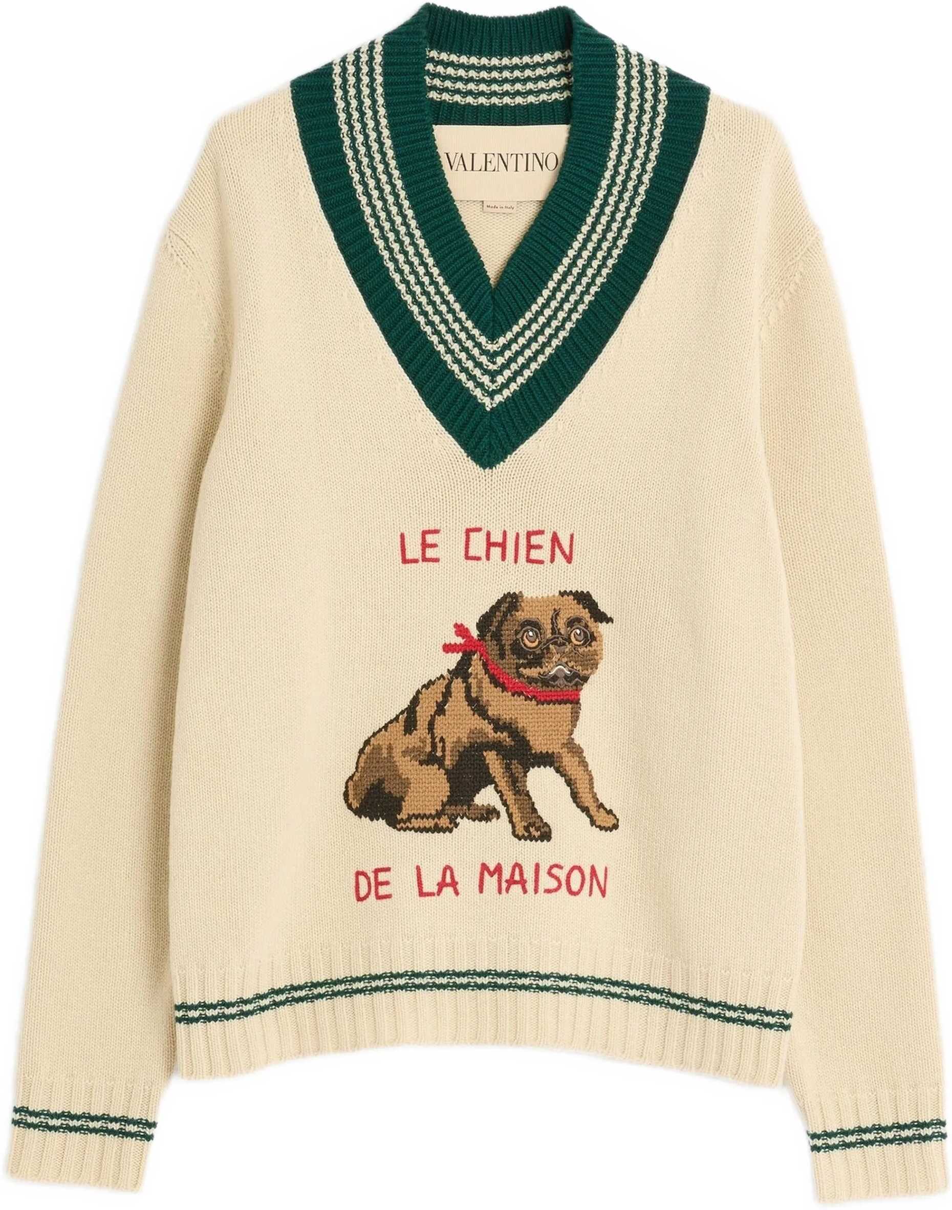 Valentino's Le Chien De La Maison wool Sweater is a sleek and modern piece. With a ribbed V-neck that flatters the silhouette, it features ribbed cuffs and hem for a touch of comfort and style. Le Chien De La Maison embroidery on the chest adds a distinctive and refined detail, giving the sweater a unique and sophisticated character. Perfect for a casual yet sophisticated look.