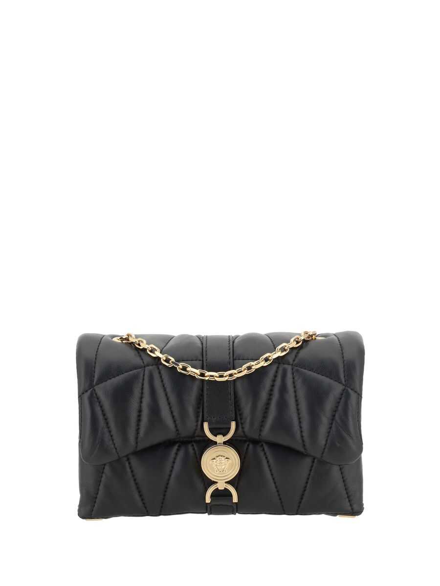 Black leather bag. Adjustable and removable shoulder strap. Two compartments and inside pocket. Magnetic button closure with Medusa logo. Width: 18 Height: 10 Depth: 6