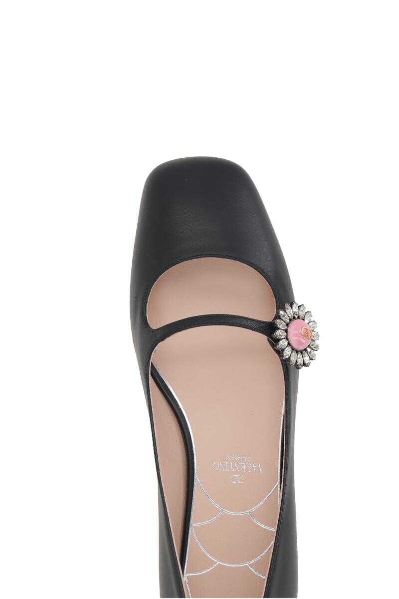 Valentino Garavani mary-jane ballerinas crafted in smooth black leather. Featuring a front strap detailed with a jewel button adorned with crystals and VLogo Signature decoration. Designed with a squared toe, leather lining and leather sole.