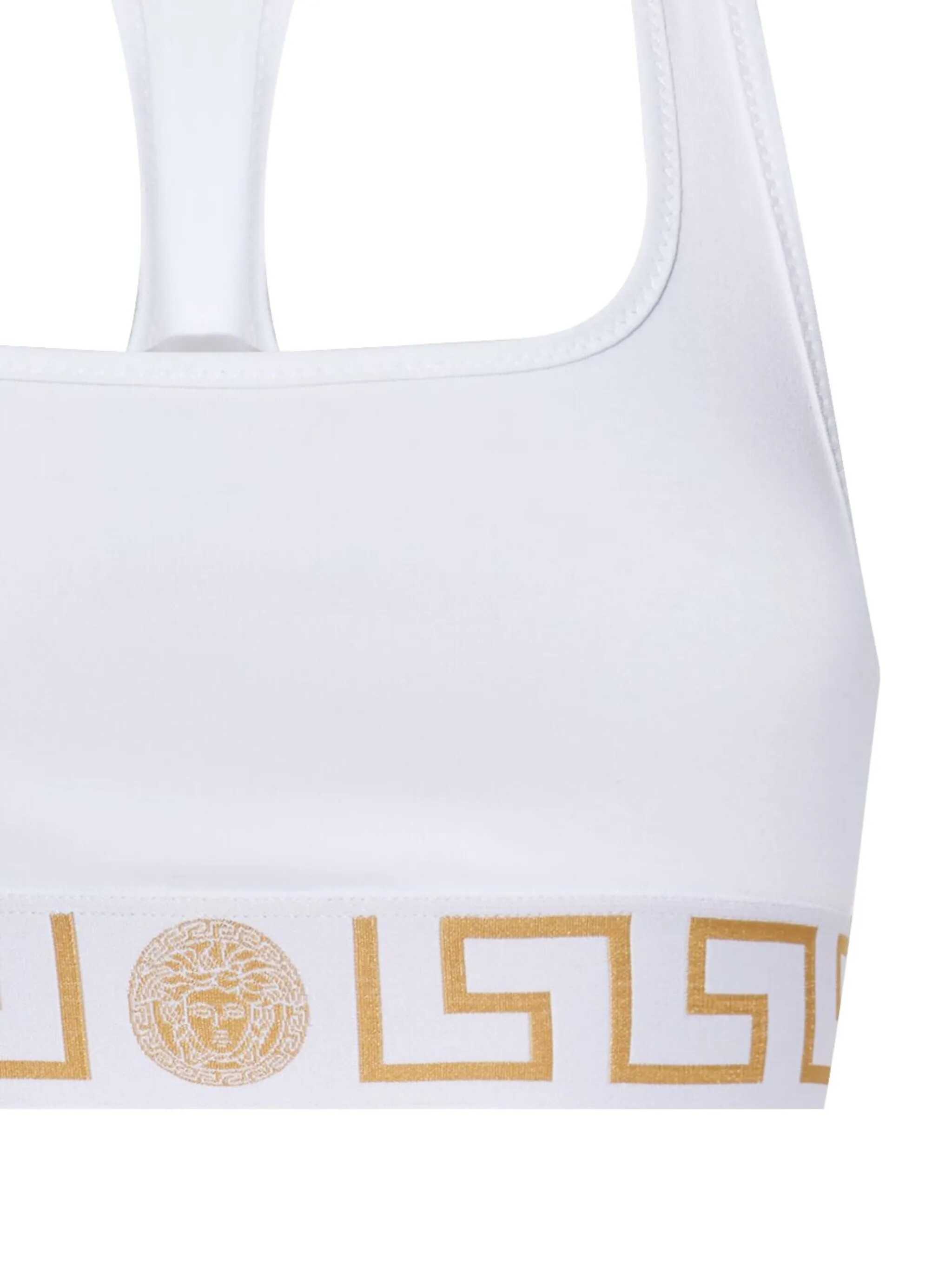 White stretch-cotton signature Greca detailing Medusa Head motif square neck elasticated underband pull-on style signed by Versace