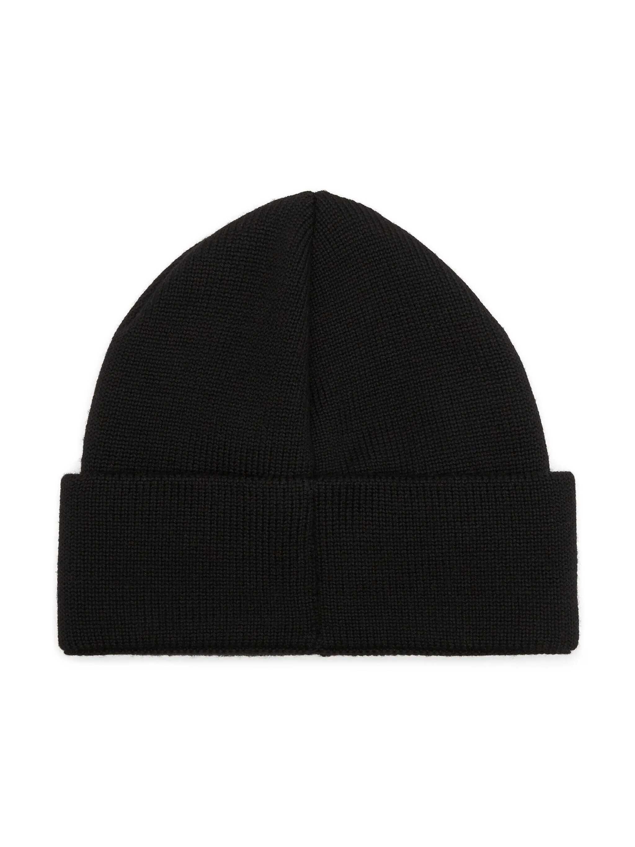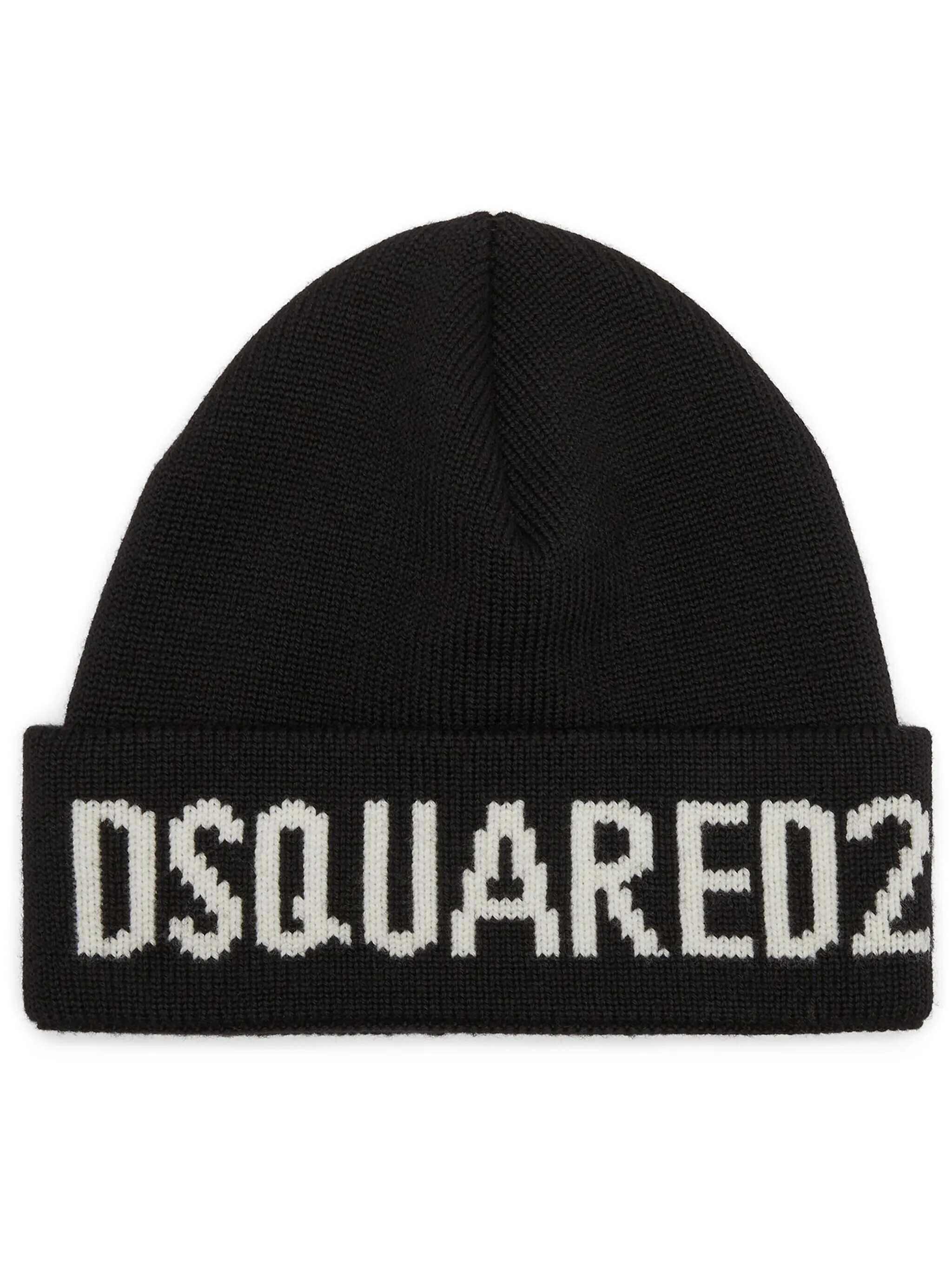 Black wool knitted hat from Dsquared2 featuring construction round crown intarsia-knit logo turn-up wide brim and logo