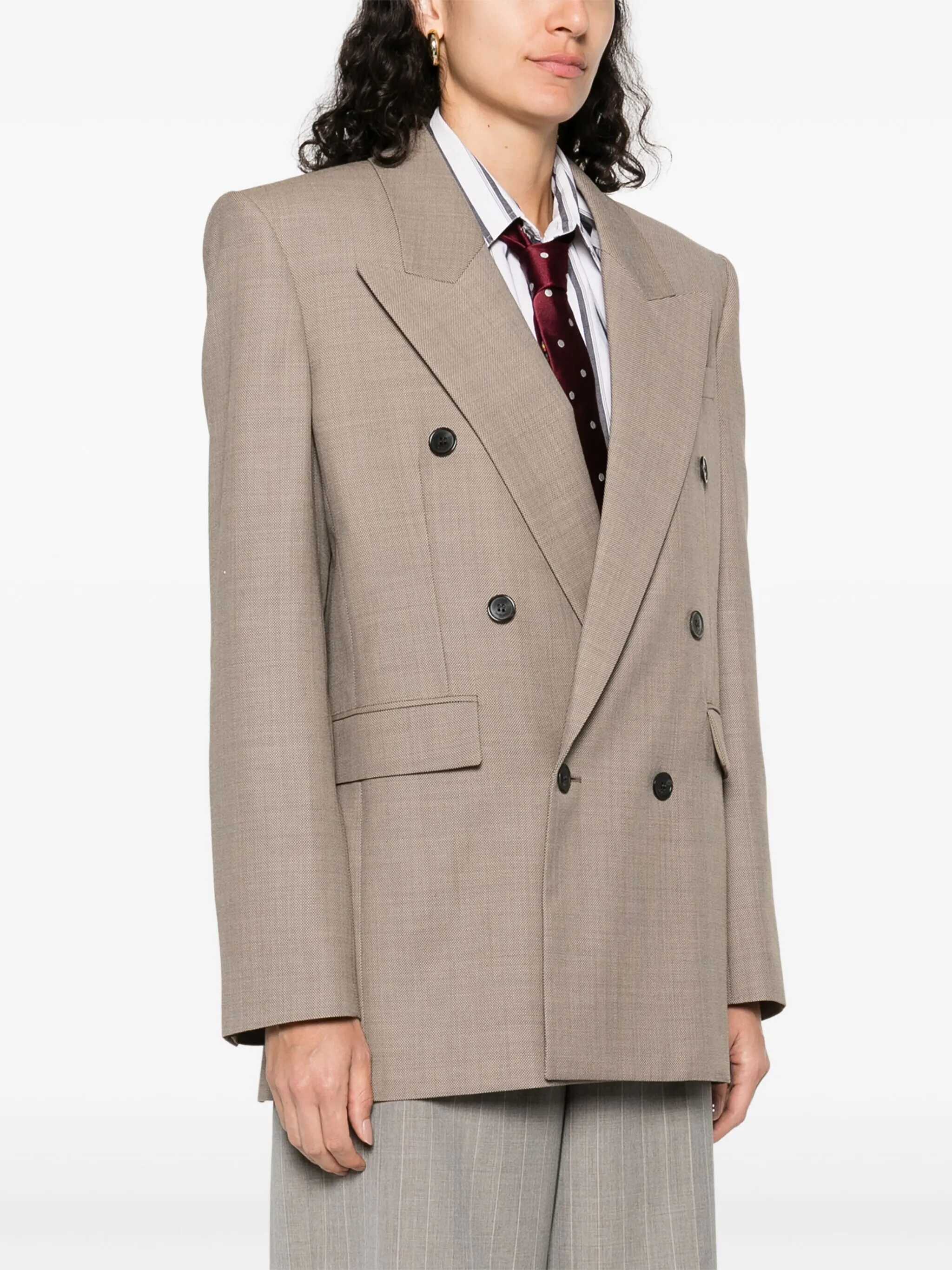 Saint Laurent's wool Blazer features a structured cut with padded epaulettes and peaked lapels. The double-breasted button closure lends classic elegance, complemented by a breast pocket and two flap pockets on the front. Details such as the four buttons on the sleeves and side slits at the back finish the design with a sharp sartorial touch.
