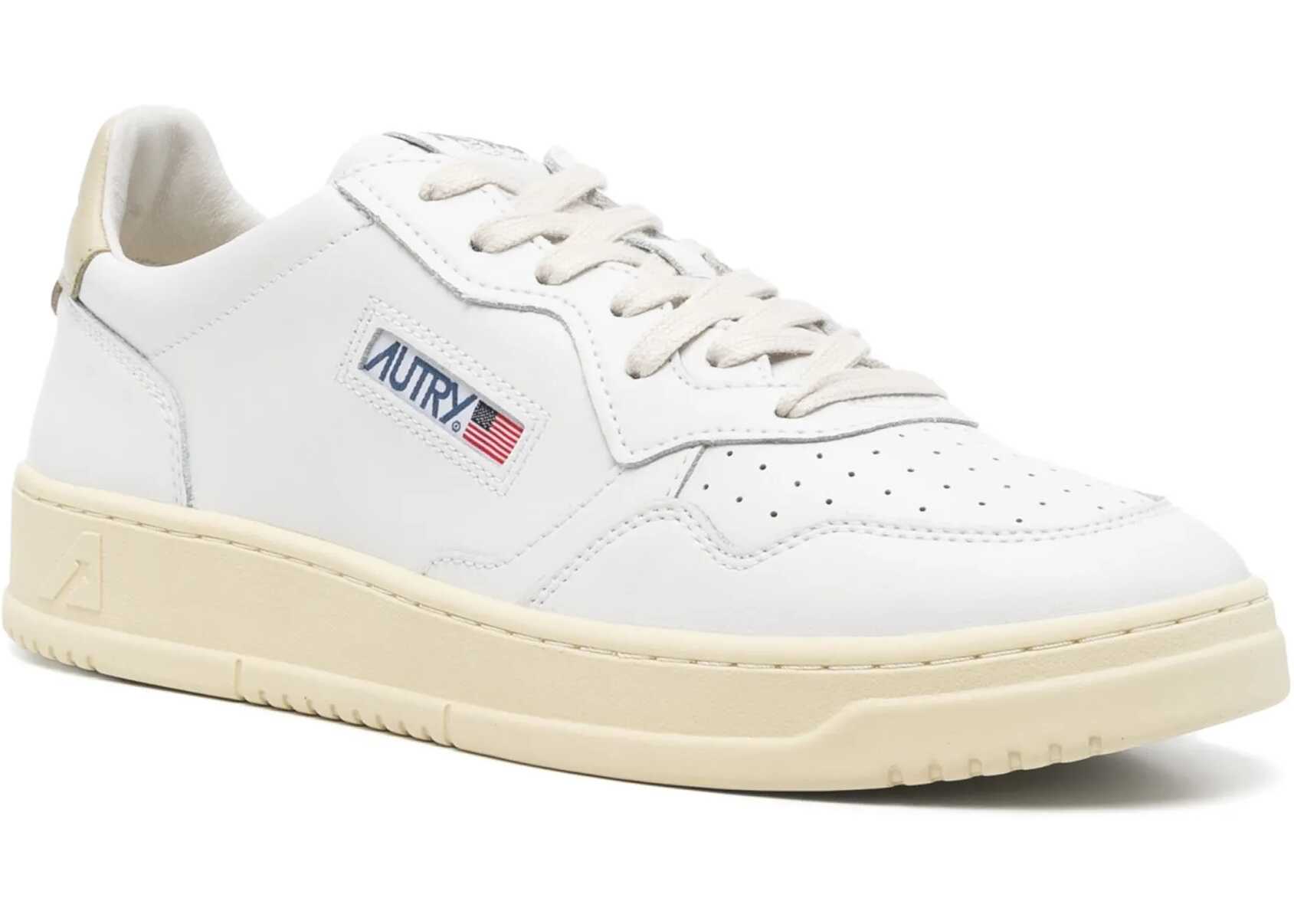 Low-top sneakers in white leather with taupe-colored heel and rubber sole. They feature lace-up closure, perforated toe, side detail with Autry blue logo, logo on tongue and embossed logo at the back. Dust bag included. Any imperfections are not to be considered manufacturing defects but rather a characteristic of the material
