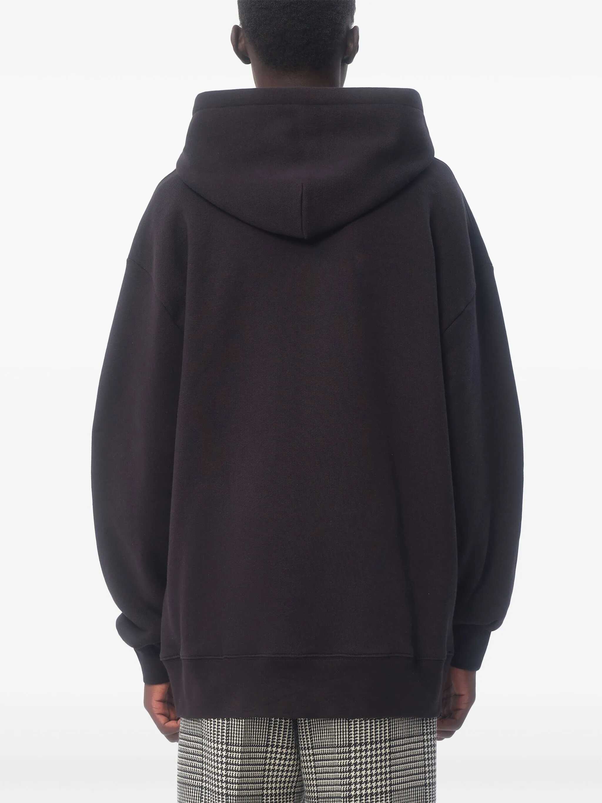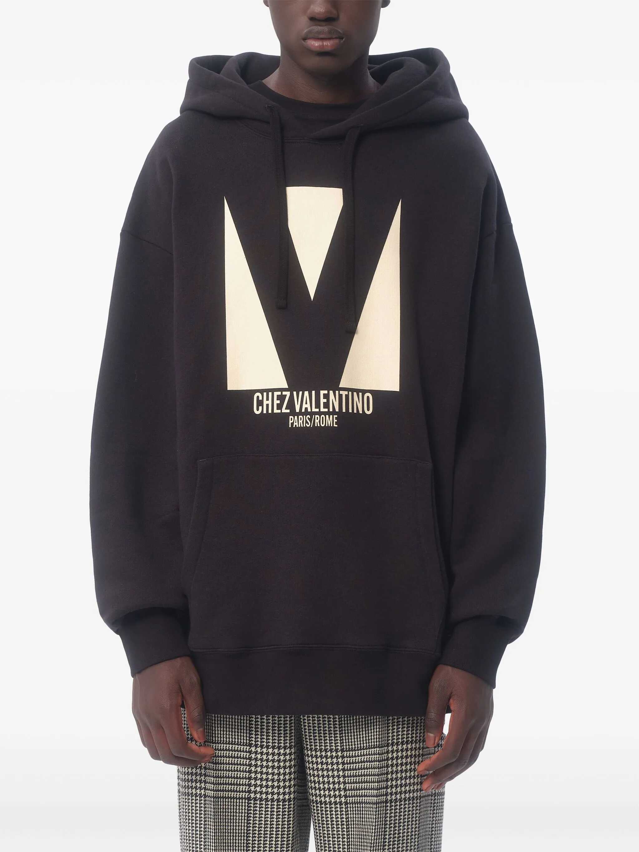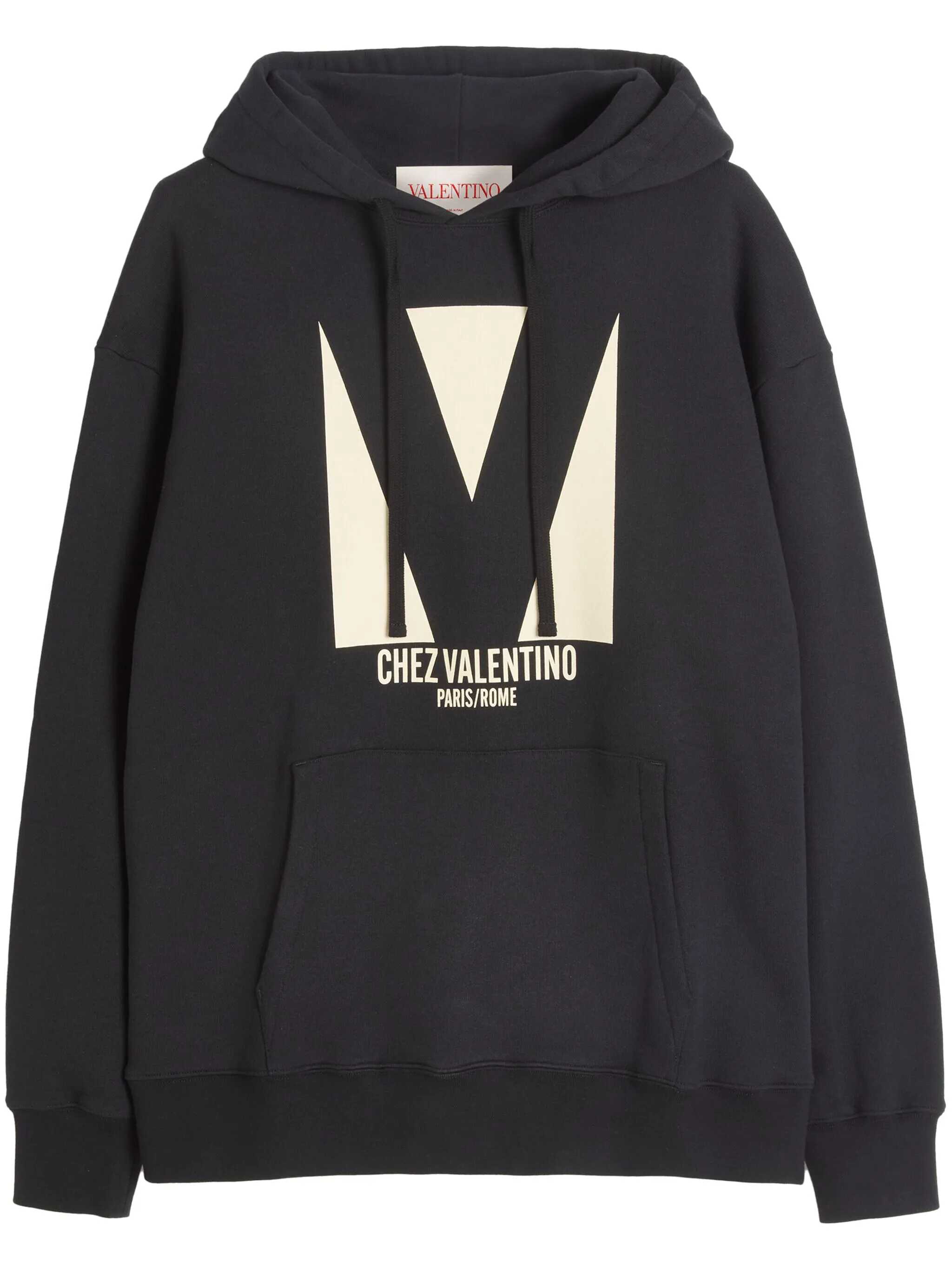 Black cotton sweatshirt from Valentino featuring long sleeves, frontal pring, ribbed cuffs, hood and regular vestibility.
